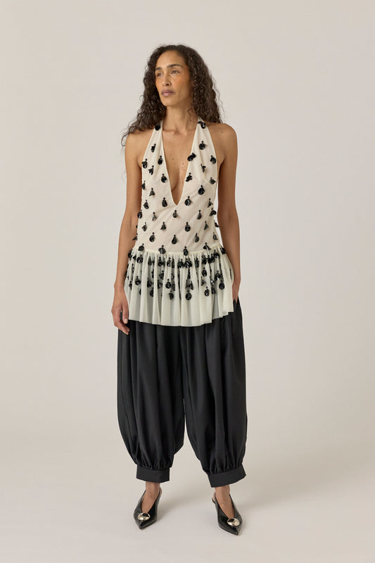 Regular price $1,395.00 CADRegular priceUnit price perSale price $1,395.00 CADvar product = { id: 10105552109856, title: "Night Top", available: true, handle: "night-top", description: "Halter-style top in tulle with hand-applied black paillette embellishments. Featuring deep V-neckline, pleated peplum hem, and button closure at the neck. \nModel is 5'9 and is wearing a size 3.", type: "Tops", tags: ["FW25","new"], options_with_values: [{"name":"Size","position":1,"values":["3\/US 6","4\/US 8"]}], featured_media: { alt: "Night Top", src: "\/\/absolutelyfabrics.com\/cdn\/shop\/files\/NIGHTTOP_WHITES_tiff_1.jpg?v=1763080669", }, url: "\/collections\/all\/products\/night-top", mf: {} }; var variants = []; var variant = { id: 50891936530720, available: true, option1: "3\/US 6", option2: null, option3: null, options: ["3\/US 6"], price: 139500, compare_price: null, inventory: { quantity: 1, policy: "deny" }, mf: {} }; variant.media = null; product.selected_variant = variant; variants.push(variant); var variant = { id: 50891936563488, available: true, option1: "4\/US 8", option2: null, option3: null, options: ["4\/US 8"], price: 139500, compare_price: null, inventory: { quantity: 1, policy: "deny" }, mf: {} }; variant.media = null; variants.push(variant); product.variants = variants; -