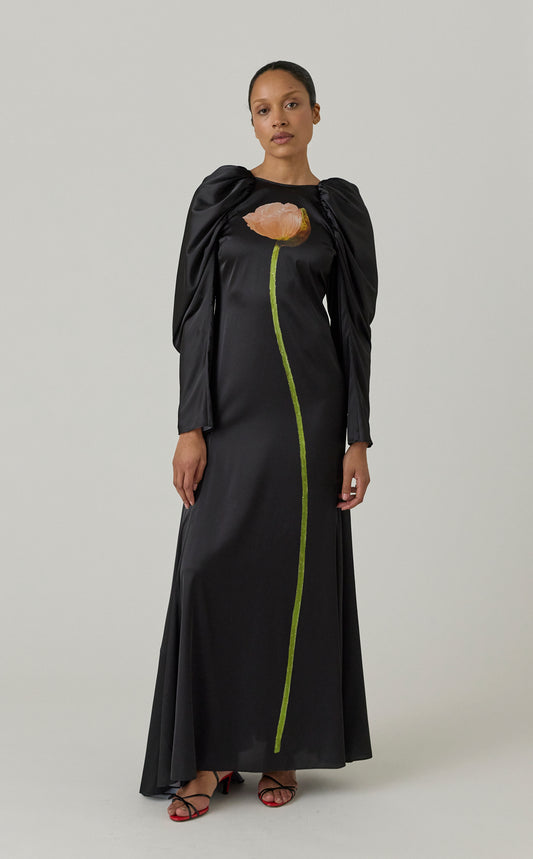 Poppy Motif Draped Sleeve Cascade Dress