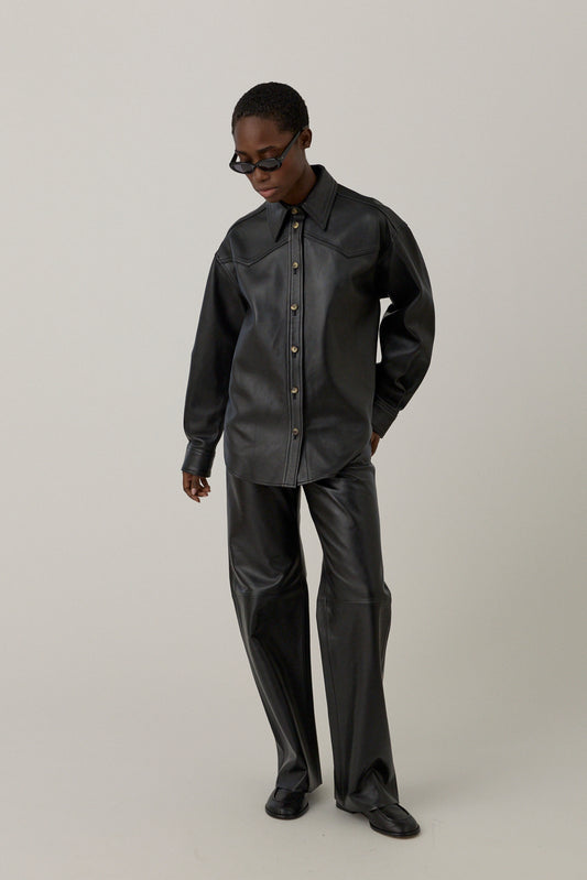 Regular price $1,095.00 CADRegular priceUnit price perSale price $1,095.00 CADvar product = { id: 10018550808864, title: "Belty Leather Shirt", available: true, handle: "belty-leather", description: "Long-sleeved shirt made from smooth black leather. Features a pointed collar, button front closure, and curved hem. Tonal paneling at the shoulders. Finished with buttoned cuffs and a relaxed fit.\nModel is 5'10 and is wearing a size S.", type: "Tops", tags: ["FW25","haikure"], options_with_values: [{"name":"Size","position":1,"values":["S","M","L","XL"]}], featured_media: { alt: "Belty Leather Shirt", src: "\/\/absolutelyfabrics.com\/cdn\/shop\/files\/HAIKURE_BeltyLeather_TOPS_tiff_2_383376b8-94c4-4822-81d7-6745ae07237d.jpg?v=1754495590", }, url: "\/collections\/haikure\/products\/belty-leather", mf: {} }; var variants = []; var variant = { id: 50556395159840, available: true, option1: "S", option2: null, option3: null, options: ["S"], price: 109500, compare_price: null, inventory: { quantity: 1, policy: "deny" }, mf: {} }; variant.media = null; product.selected_variant = variant; variants.push(variant); var variant = { id: 50556395192608, available: true, option1: "M", option2: null, option3: null, options: ["M"], price: 109500, compare_price: null, inventory: { quantity: 1, policy: "deny" }, mf: {} }; variant.media = null; variants.push(variant); var variant = { id: 50556395225376, available: true, option1: "L", option2: null, option3: null, options: ["L"], price: 109500, compare_price: null, inventory: { quantity: 1, policy: "deny" }, mf: {} }; variant.media = null; variants.push(variant); var variant = { id: 50556395258144, available: true, option1: "XL", option2: null, option3: null, options: ["XL"], price: 109500, compare_price: null, inventory: { quantity: 1, policy: "deny" }, mf: {} }; variant.media = null; variants.push(variant); product.variants = variants; -