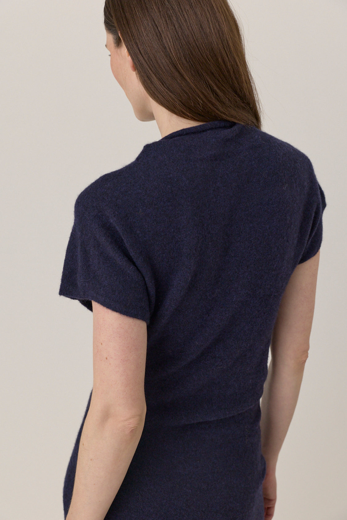 Ankle-length dress in clean boiled wool knitted to a slim silhouette with a draped-effect waist. Finished with mock neckline and wide short sleeves.