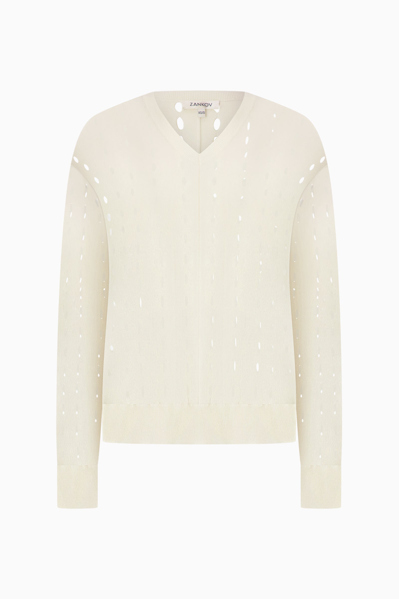 Ivory V-neck sweater with long sleeves and openwork knit detailing.