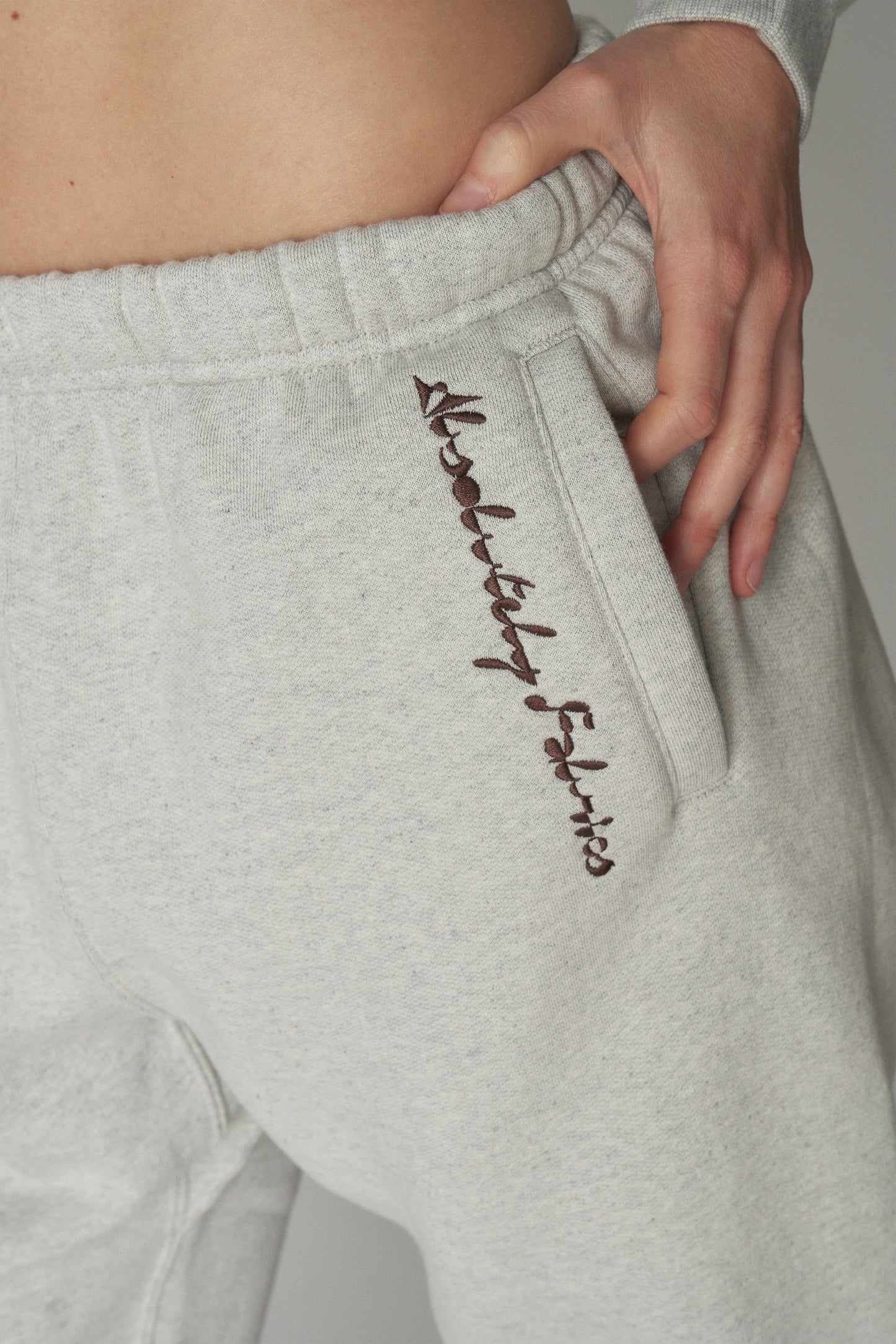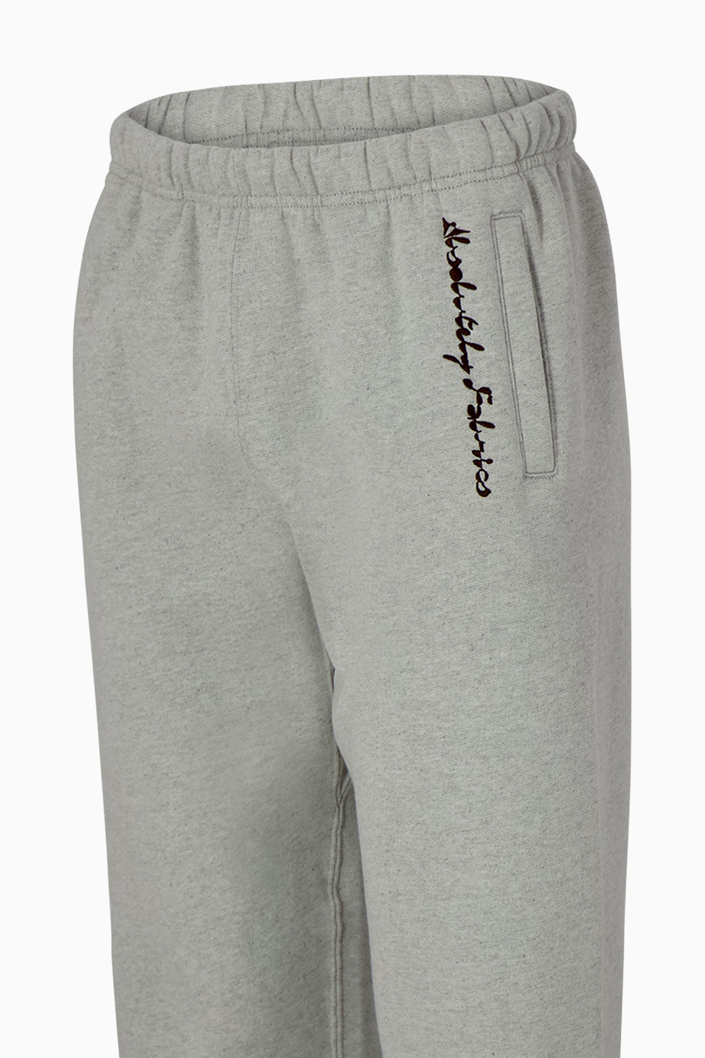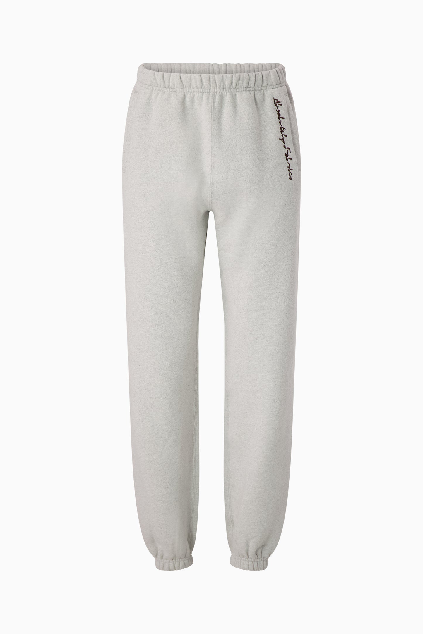 Relaxed-fit sweatpants with concealed drawstring waist and gathered ankle. Pockets at hip. Embroidered Absolutely Fabrics at hip.