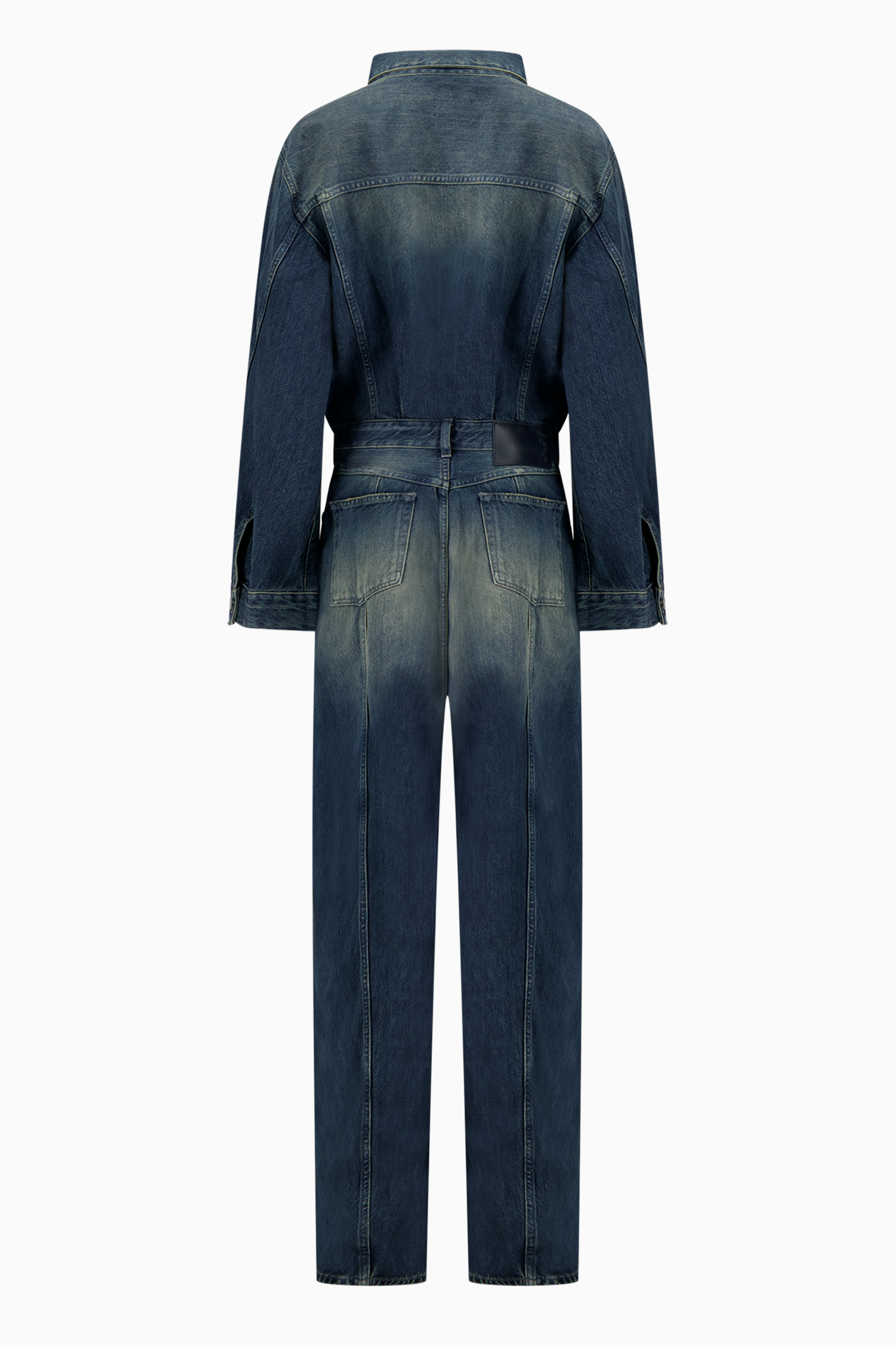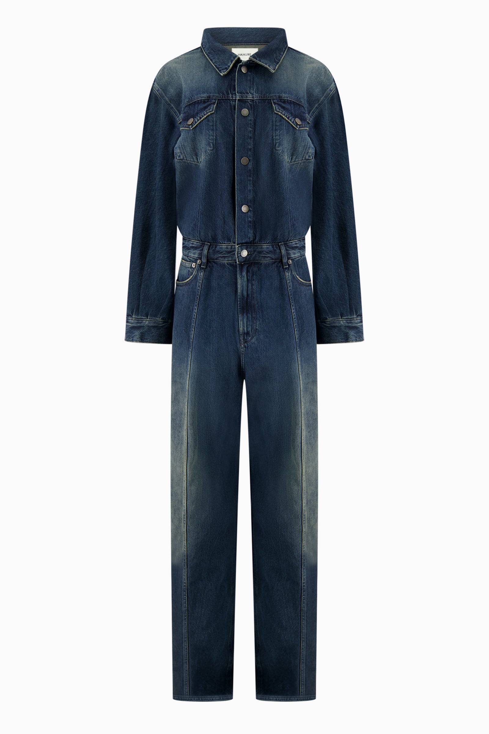 Jumpsuit in mid-weight, non-stretch denim with fading and whiskering throughout. Long sleeves with button cuffs. Snap placket. Zip fly. Flap breast pockets. 5-pocket styling.