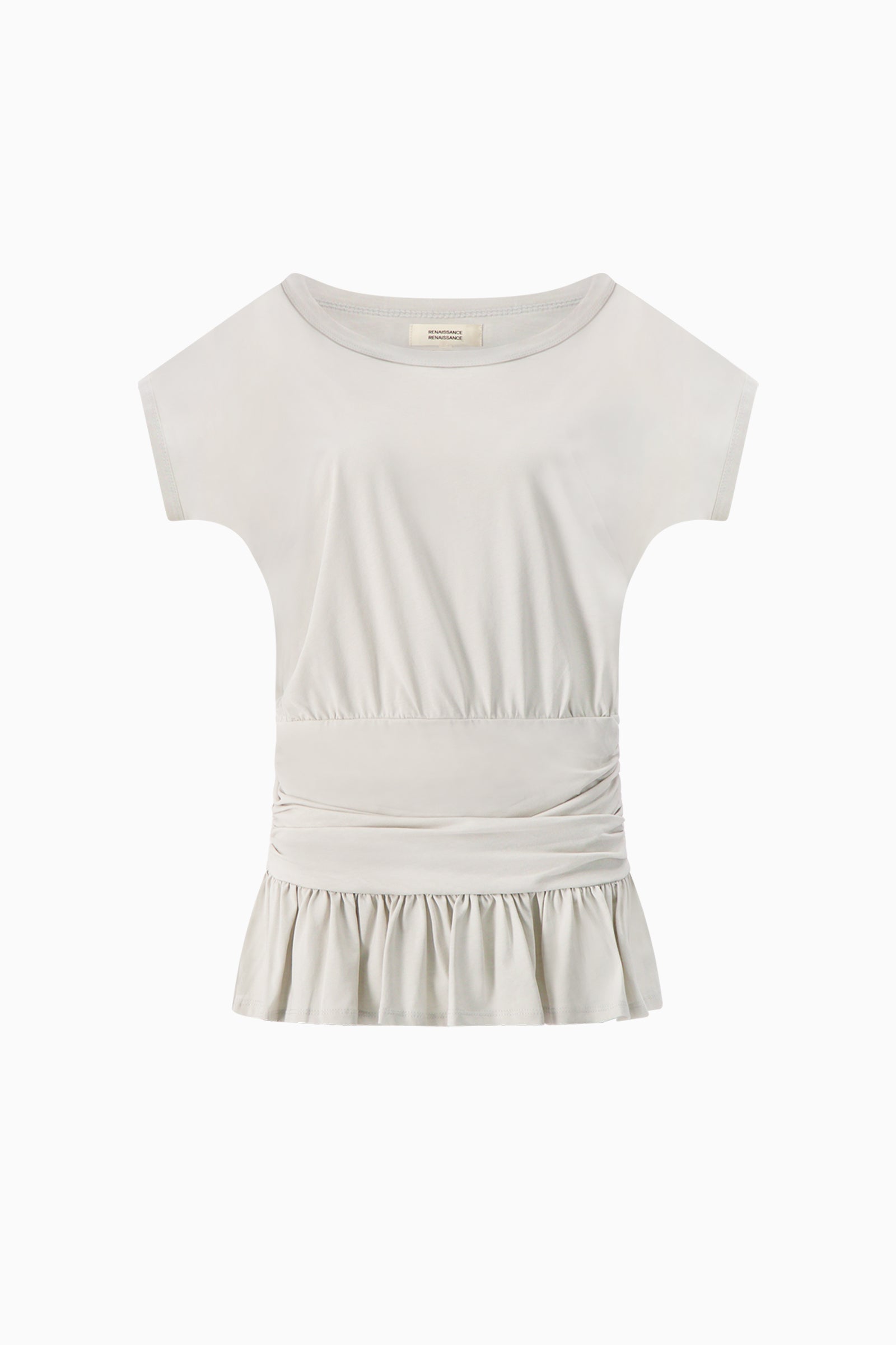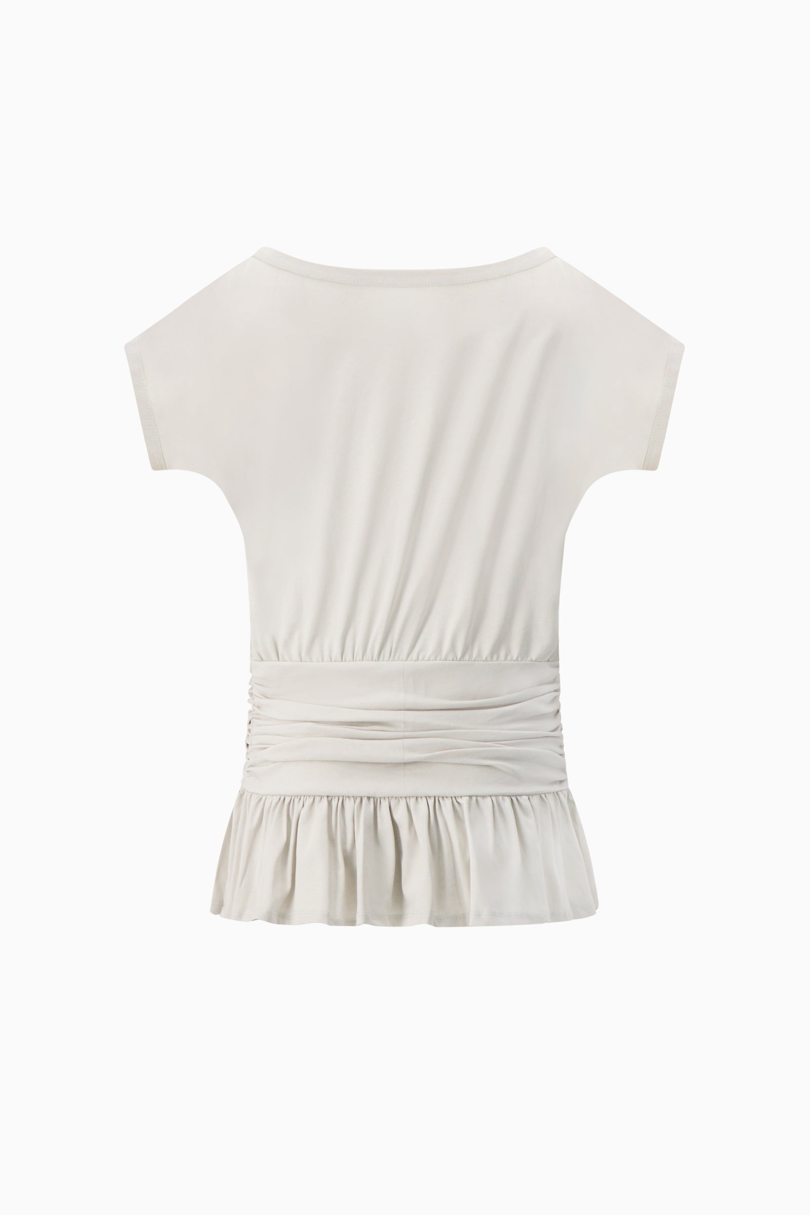 Lightweight jersey top with relaxed cap sleeve, gentle drape through the body, and softly ruched waist finished with subtle peplum hem.