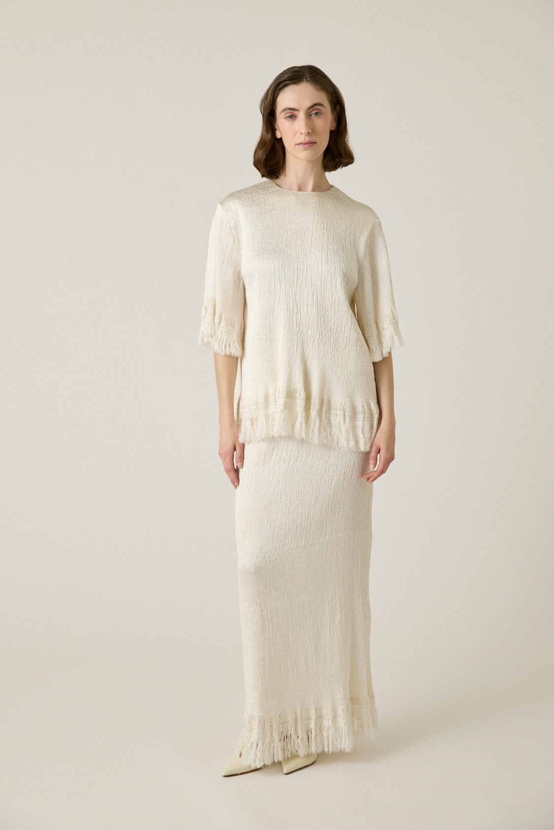 Relaxed t-shirt with fringe detailing in woven silk ottoman.