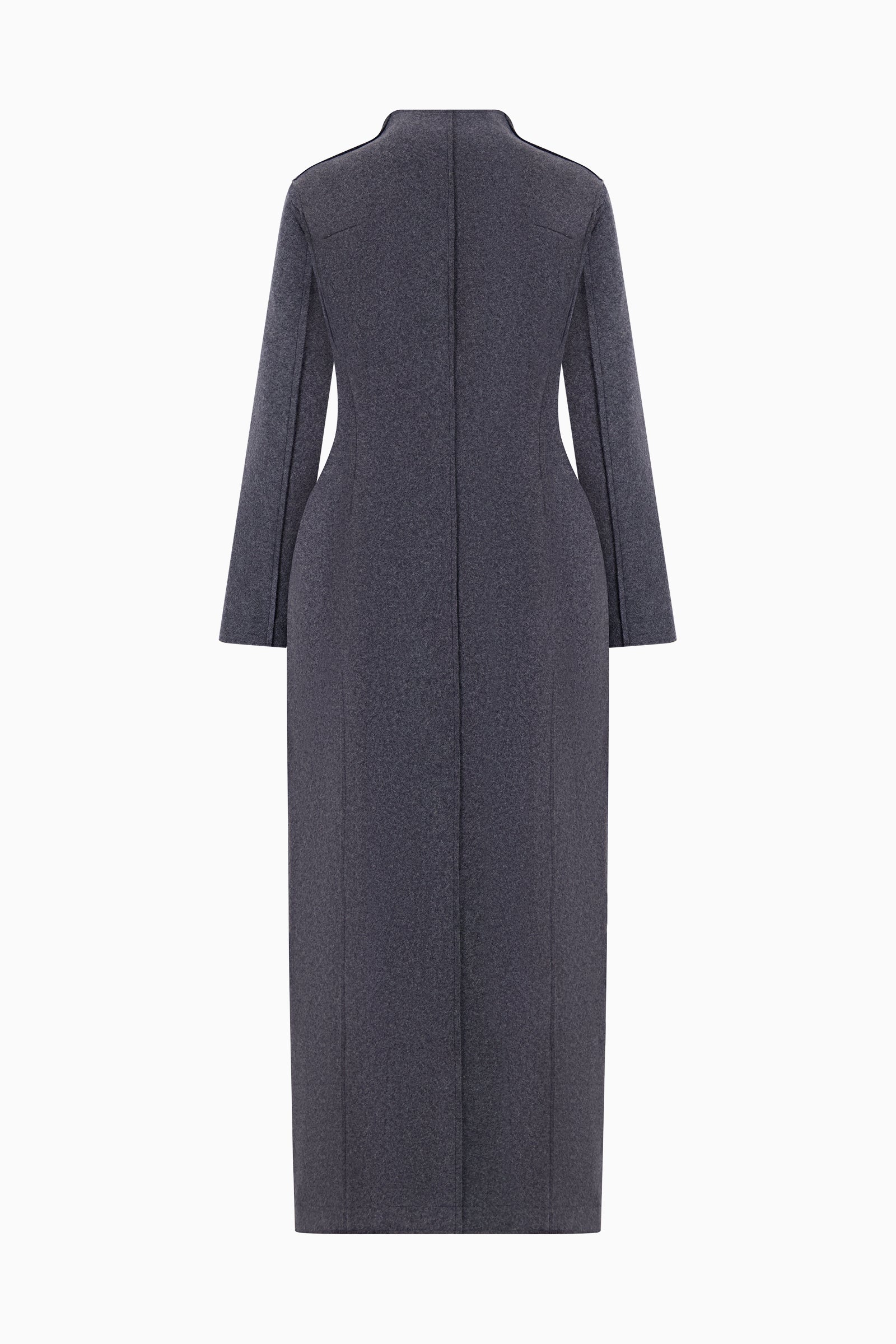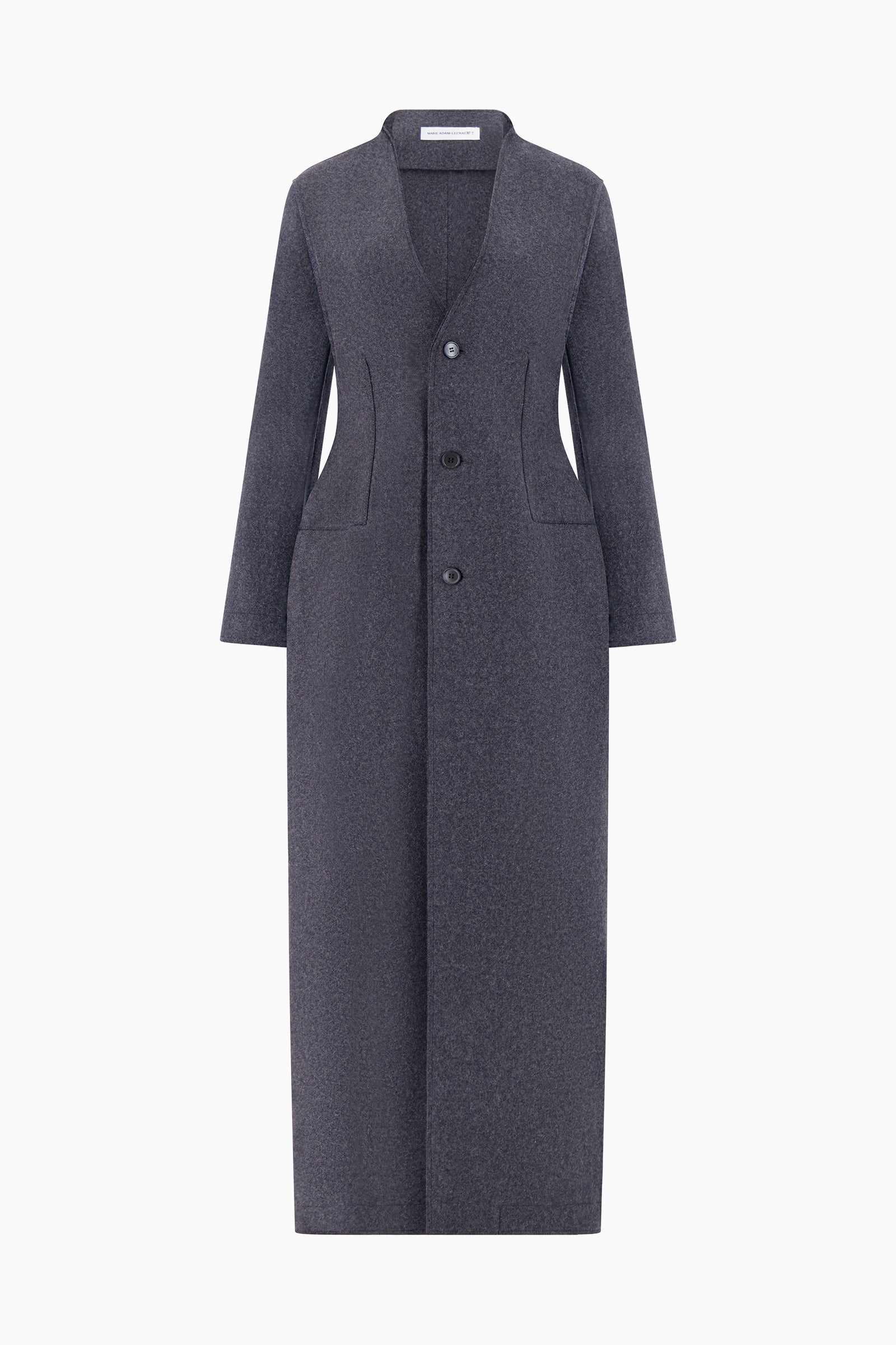 Long tailored coat in structured wool, designed with a sculpted silhouette. Featuring a deep V-neckline, front button closure, and curved seaming through the body. Finished with front patch pockets and a clean, full-length hem.