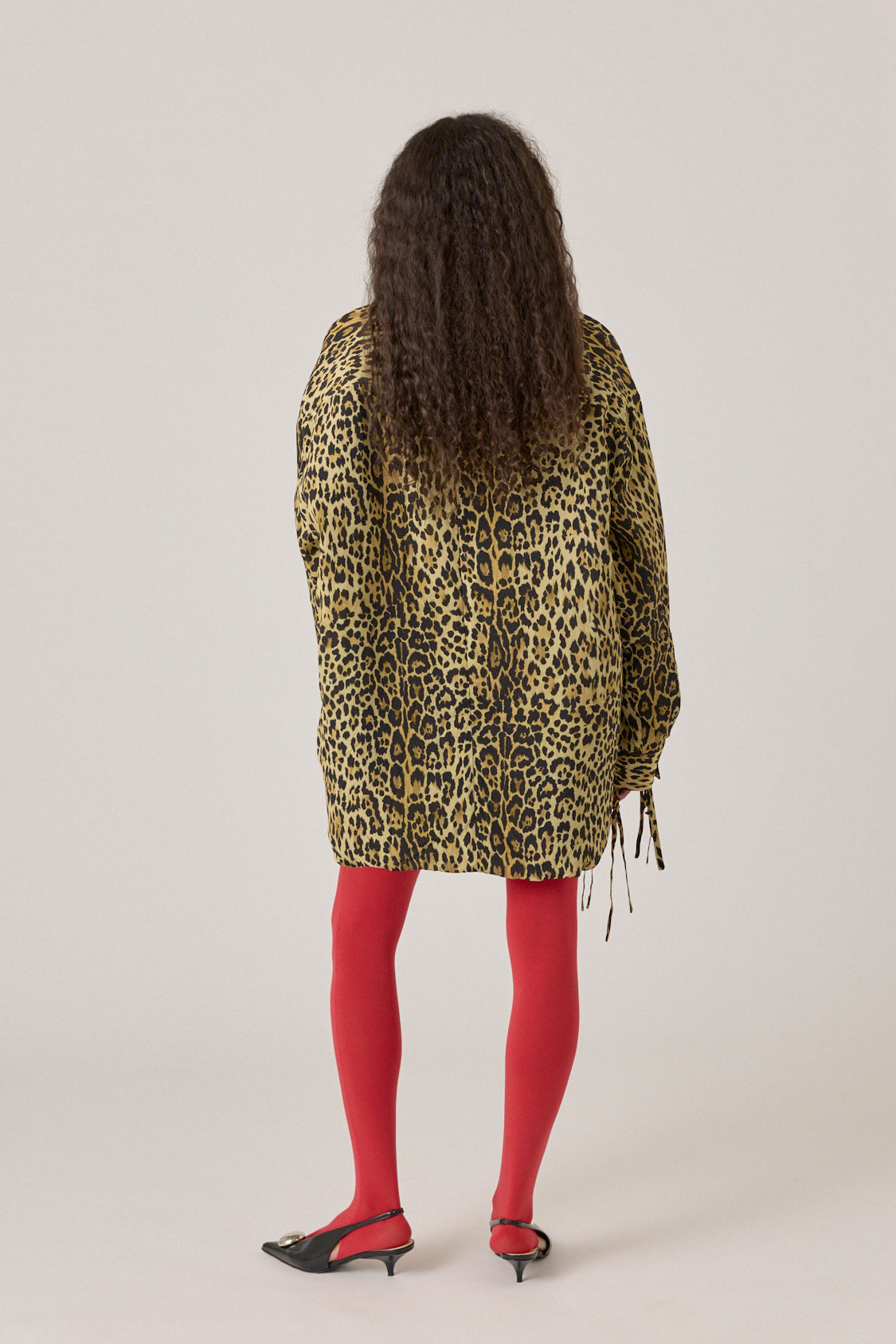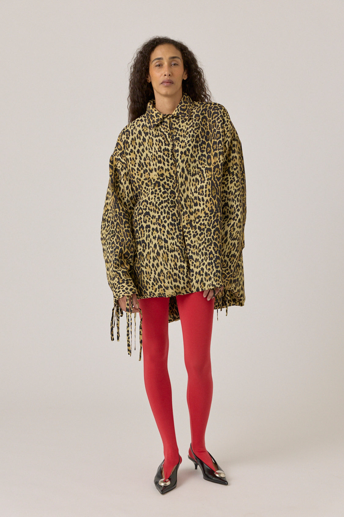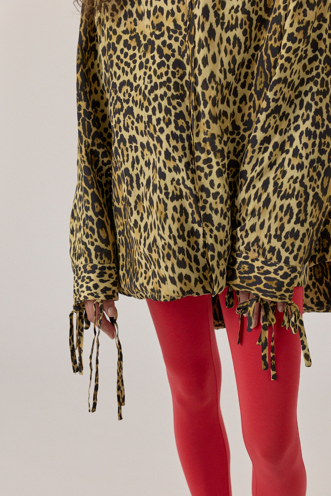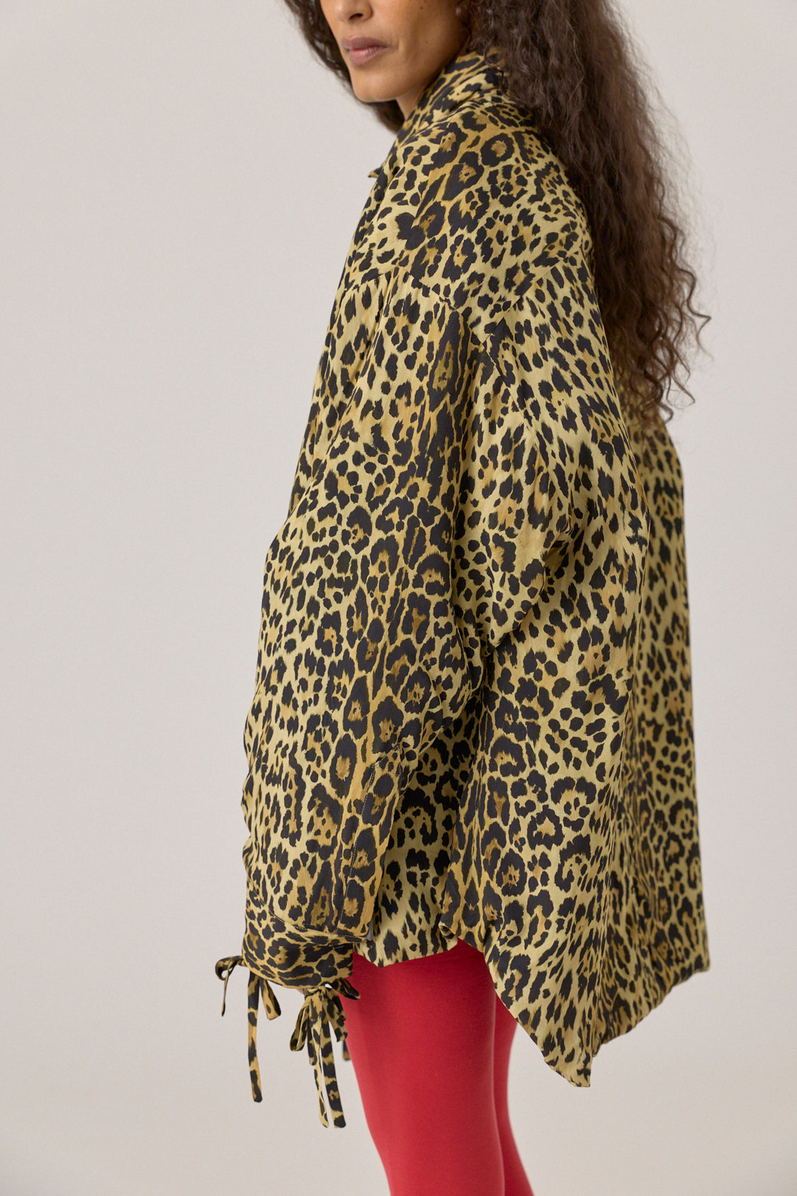 Oversized shirt made from lightweight crepe with ties at the cuffs. Button fastening.