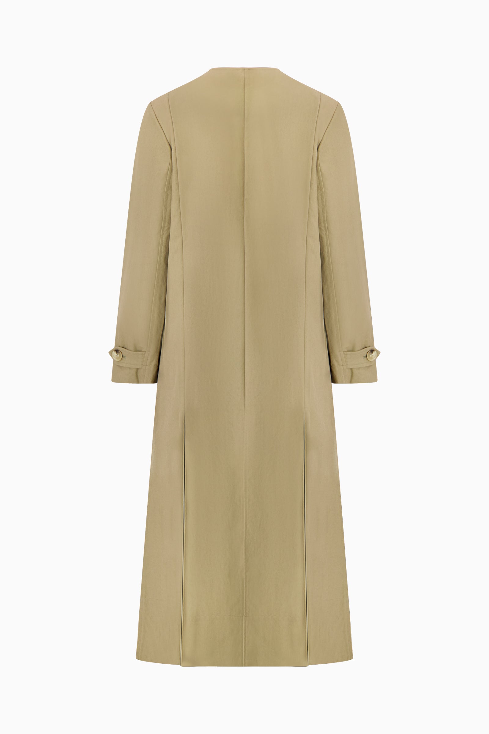 Collarless trench coat with slit detail. Faux pearl flower snap buttons. Welt pockets at side. Self-fabric belt.