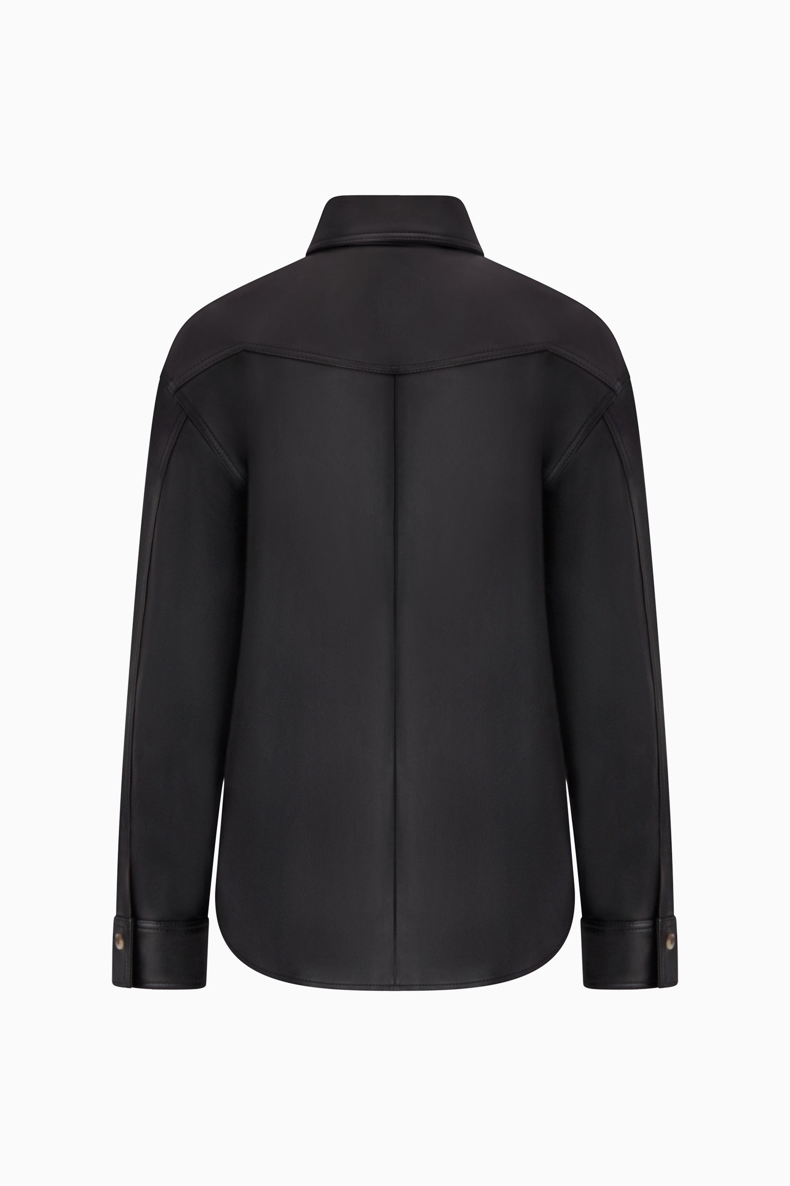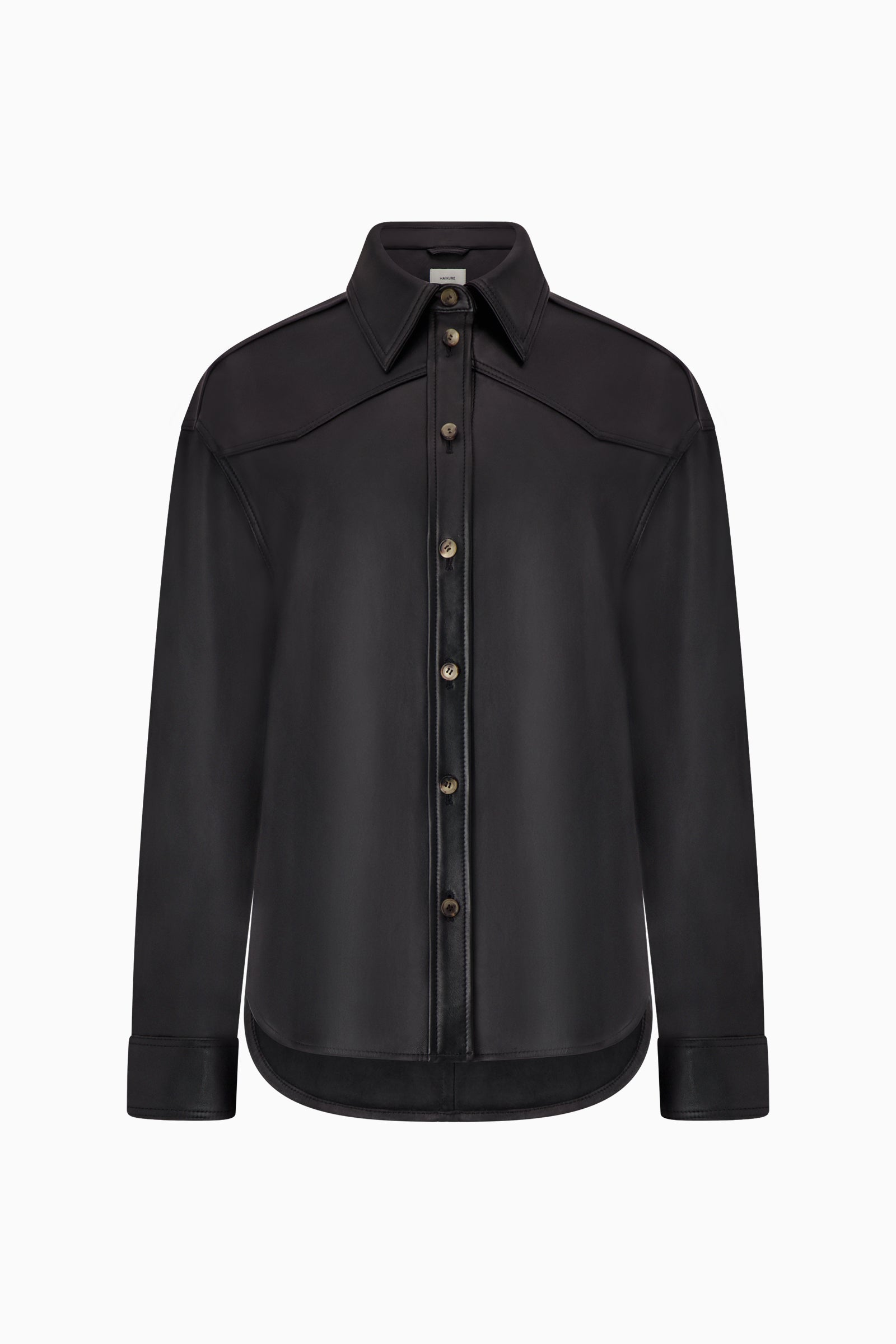 Long-sleeved shirt made from smooth black leather. Features a pointed collar, button front closure, and curved hem. Tonal paneling at the shoulders. Finished with buttoned cuffs and a relaxed fit.