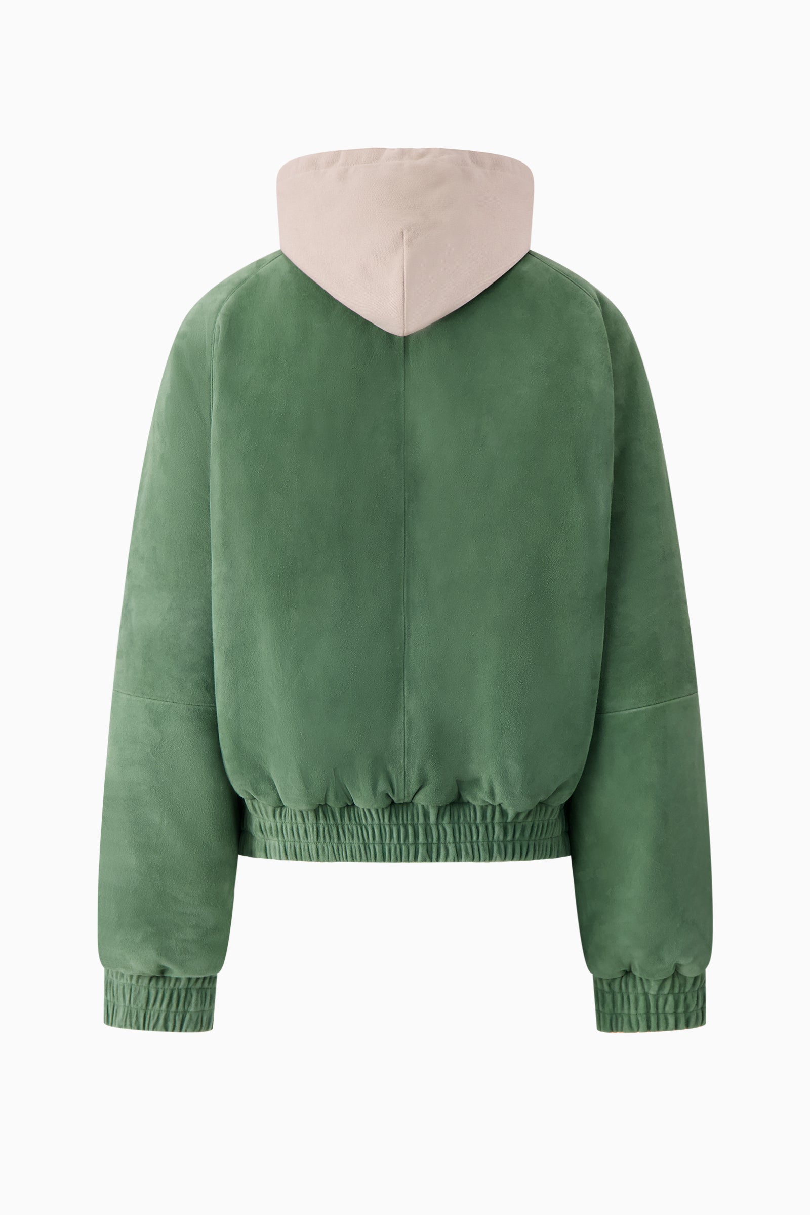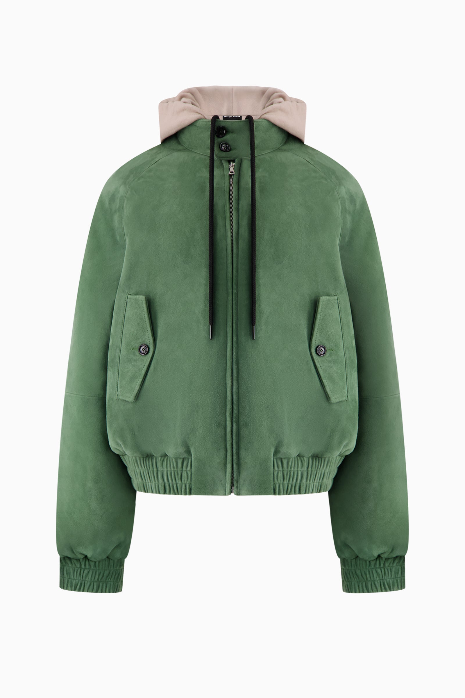 Cropped bomber jacket crafted from soft suede with a contrast nylon hood. Features a zip front with button placket, flap pockets, and elasticized hem and cuffs.