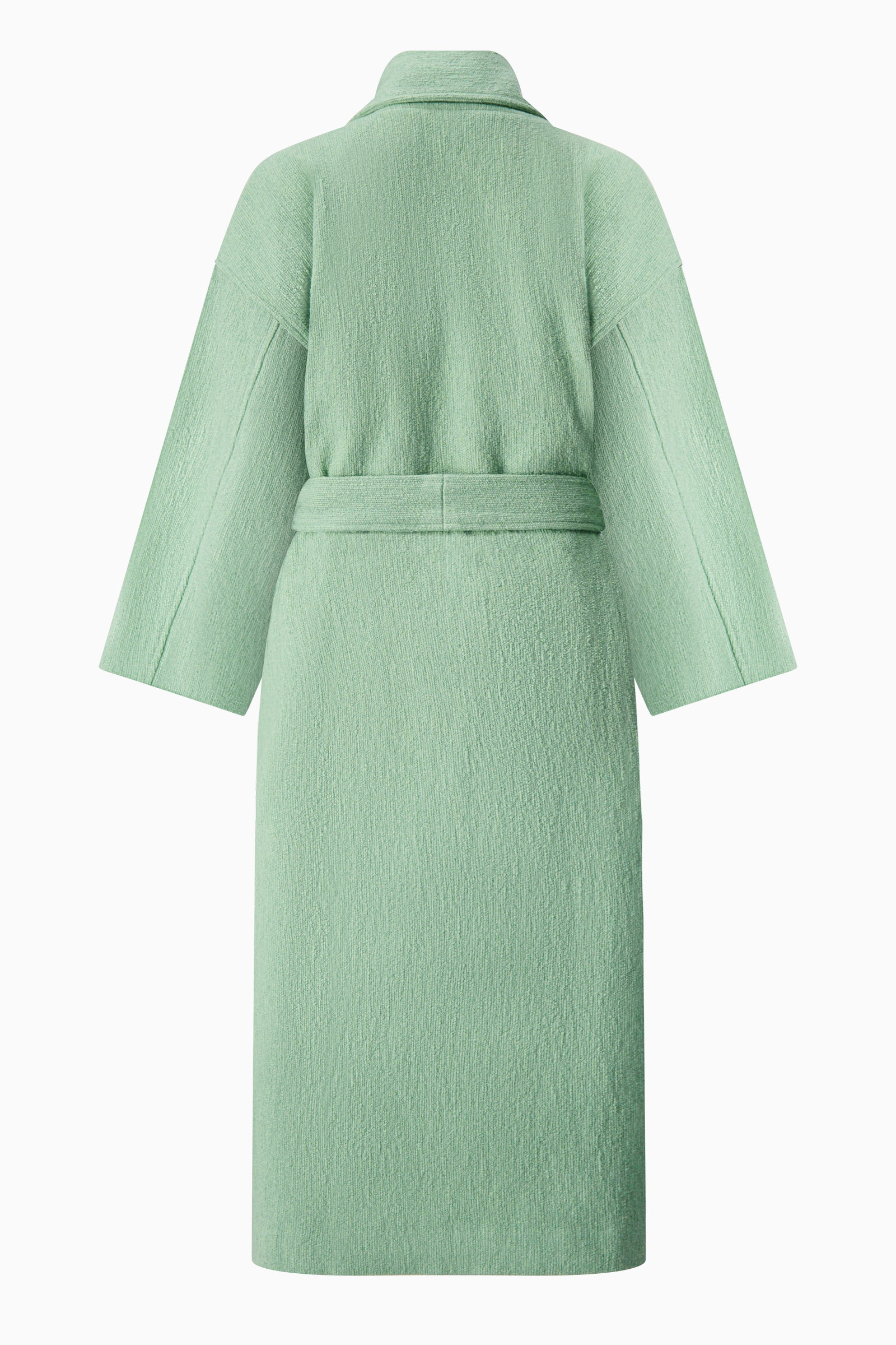 Textured longline coat with relaxed silhouette, featuring wide sleeves, notched lapels, and a self-tie belt. Finished with patch pockets.