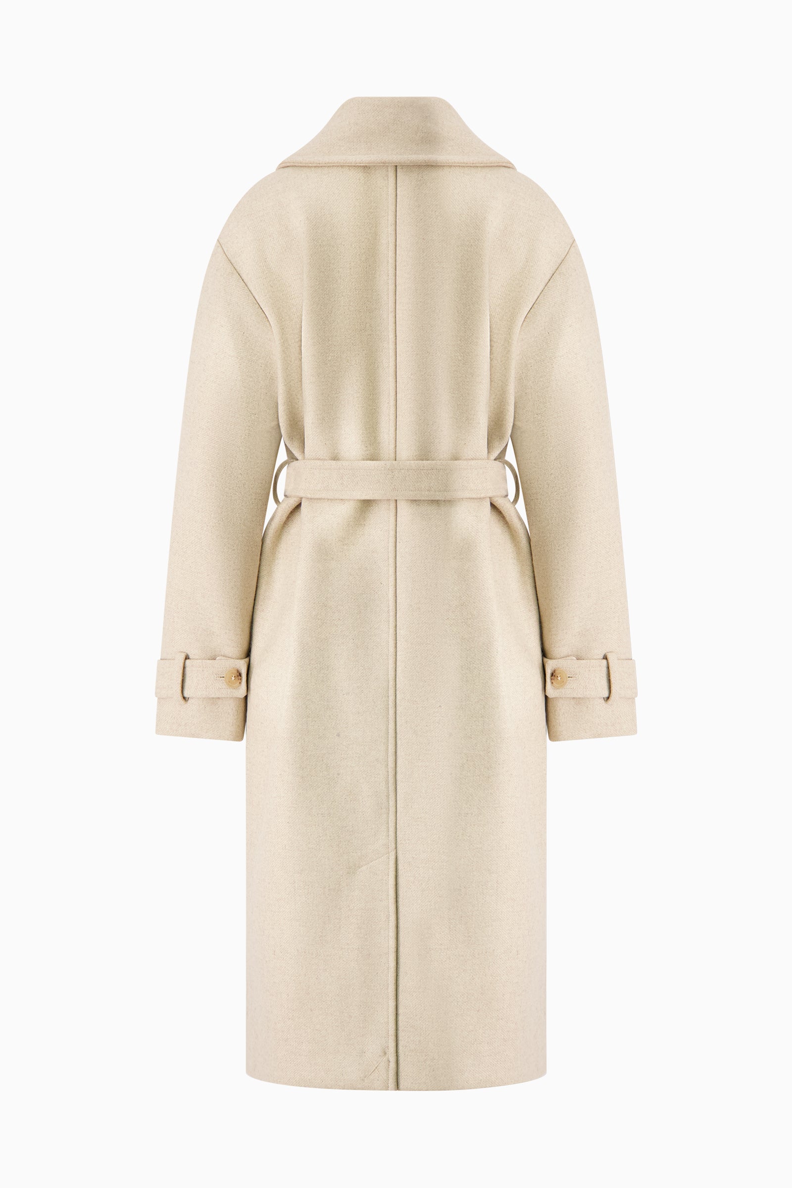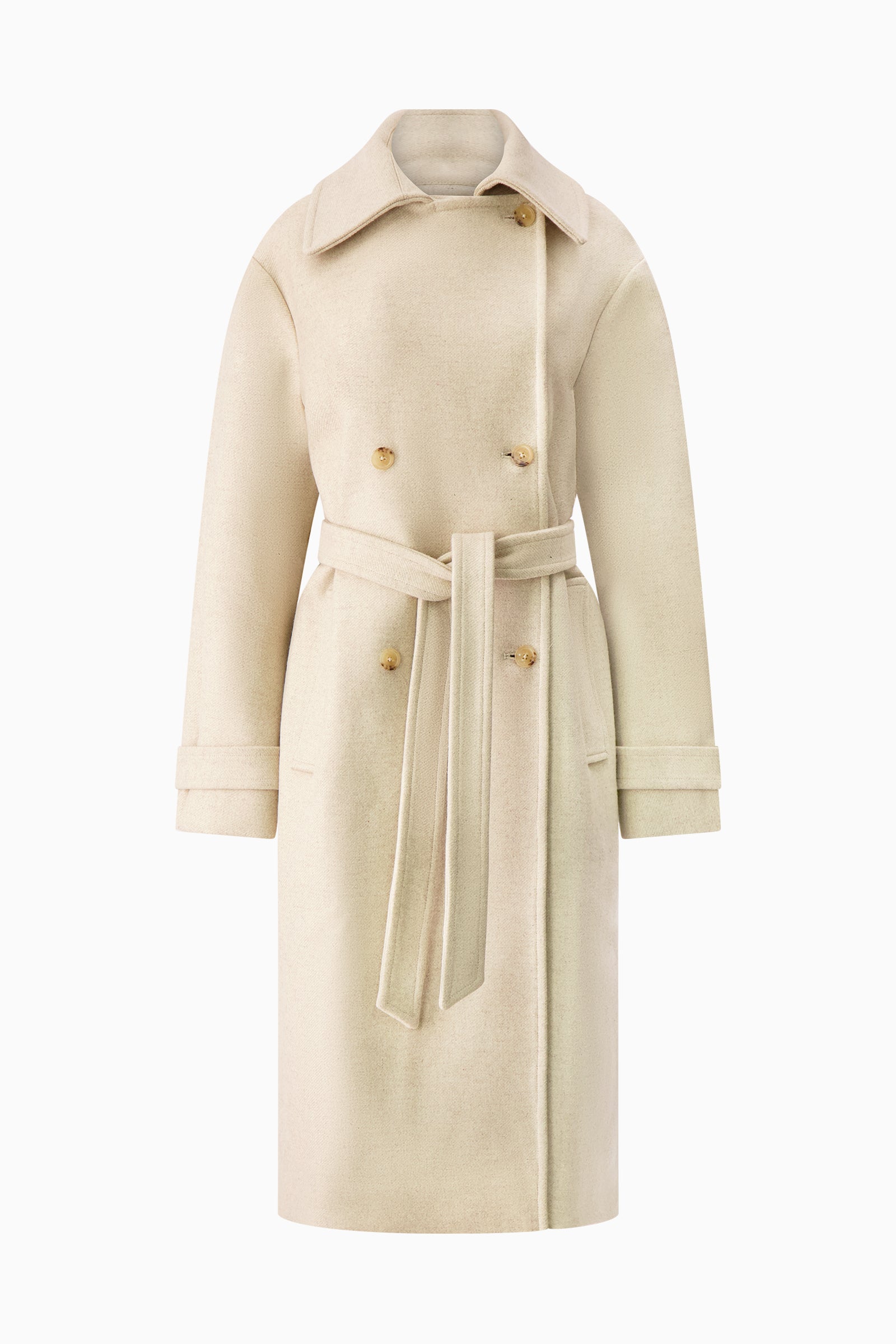 Belted double-face melton trench coat lined with silk twill. Horn button closures.