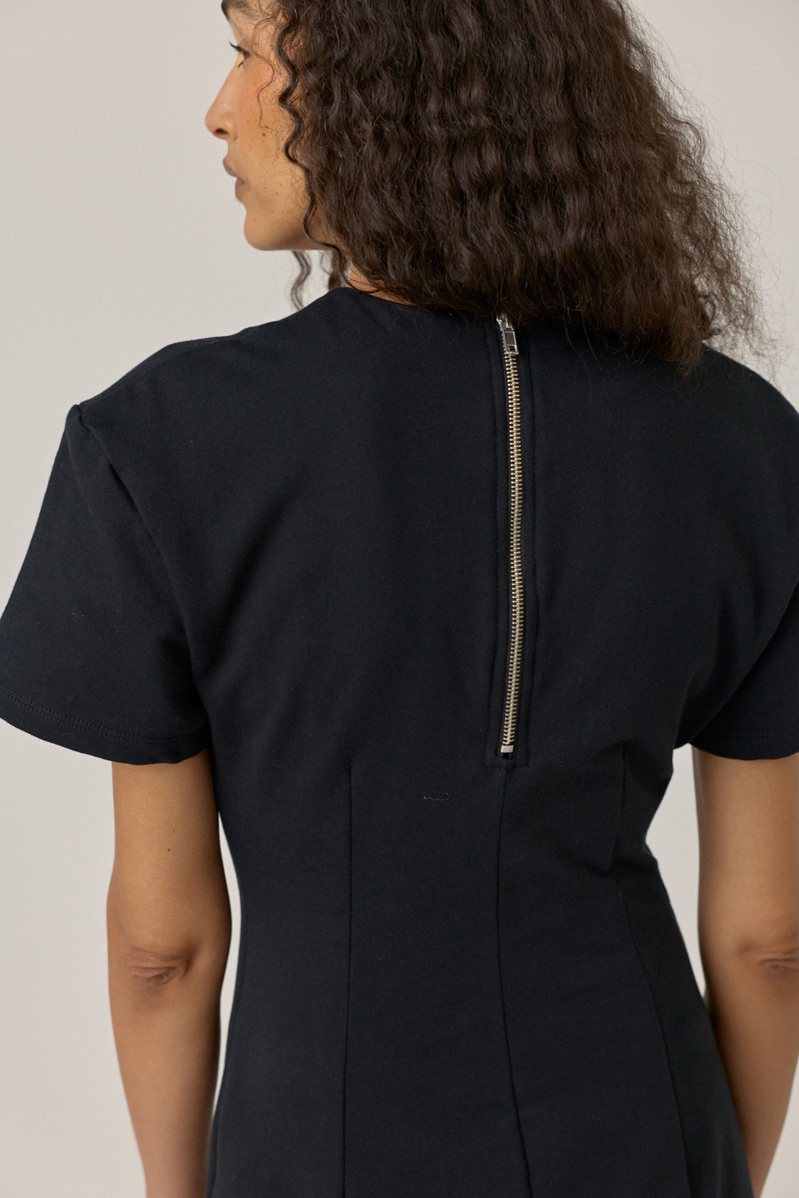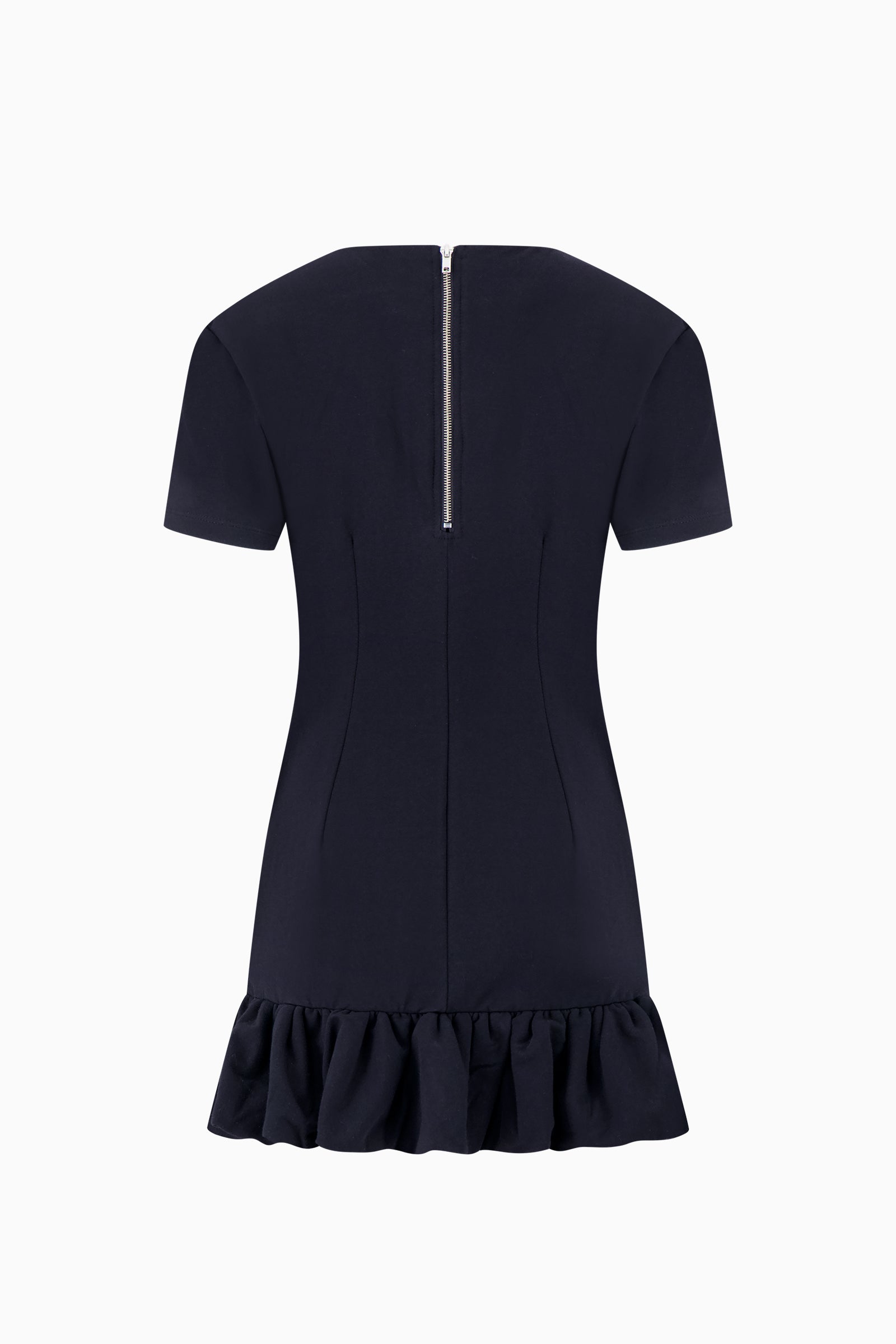 Short-sleeve mini dress with fitted silhouette and ruffled hem. Finished with round neckline and exposed back zip closure.