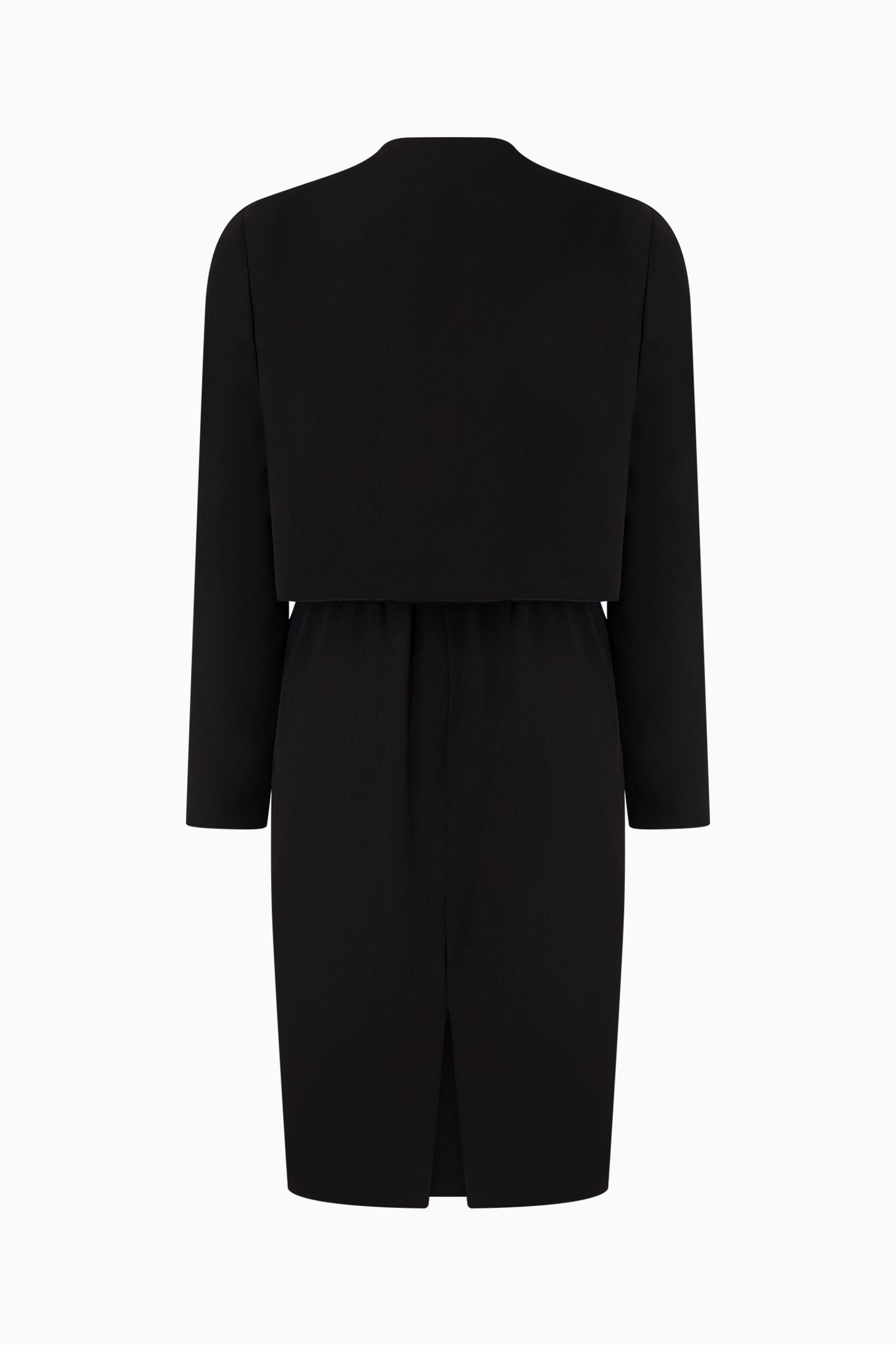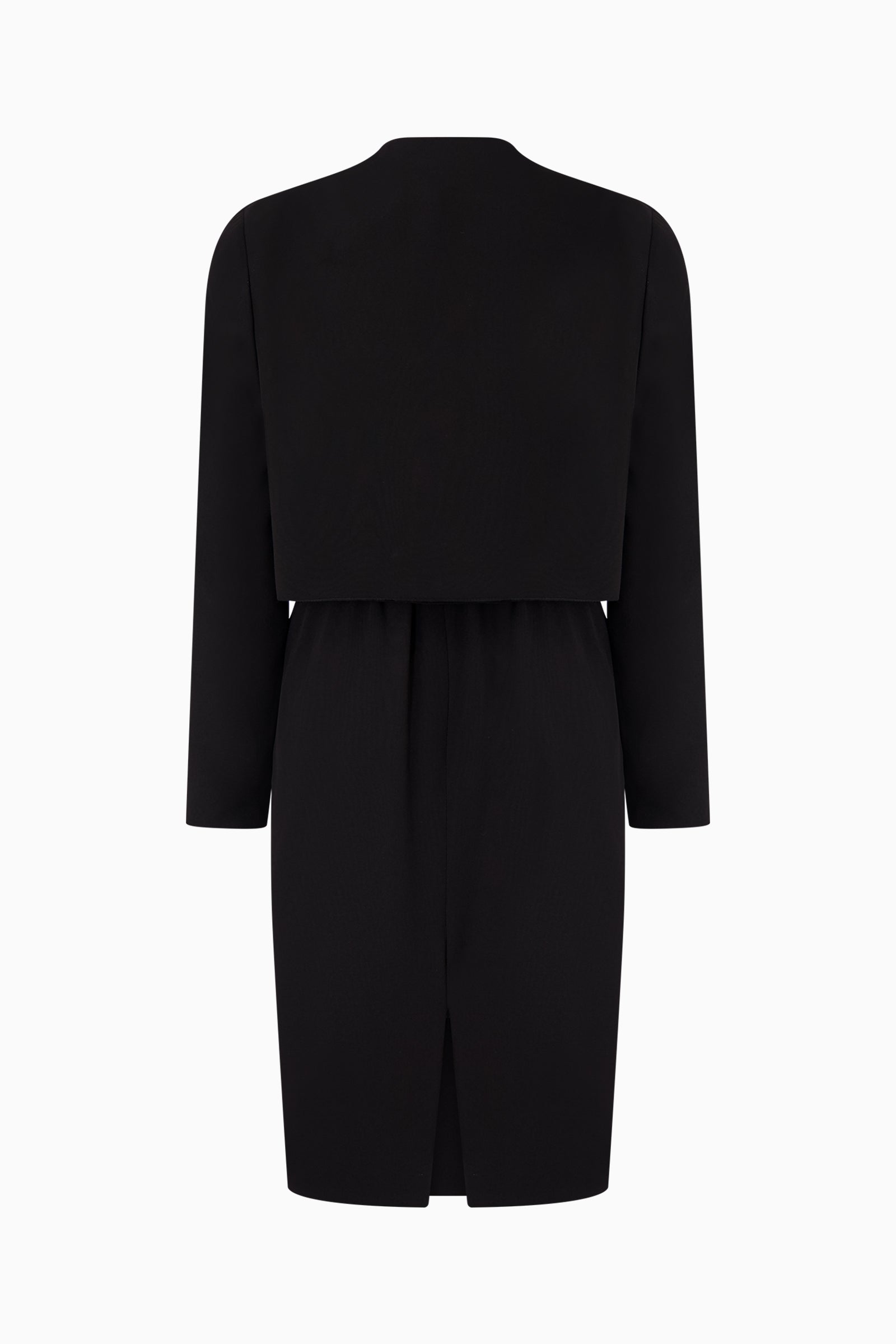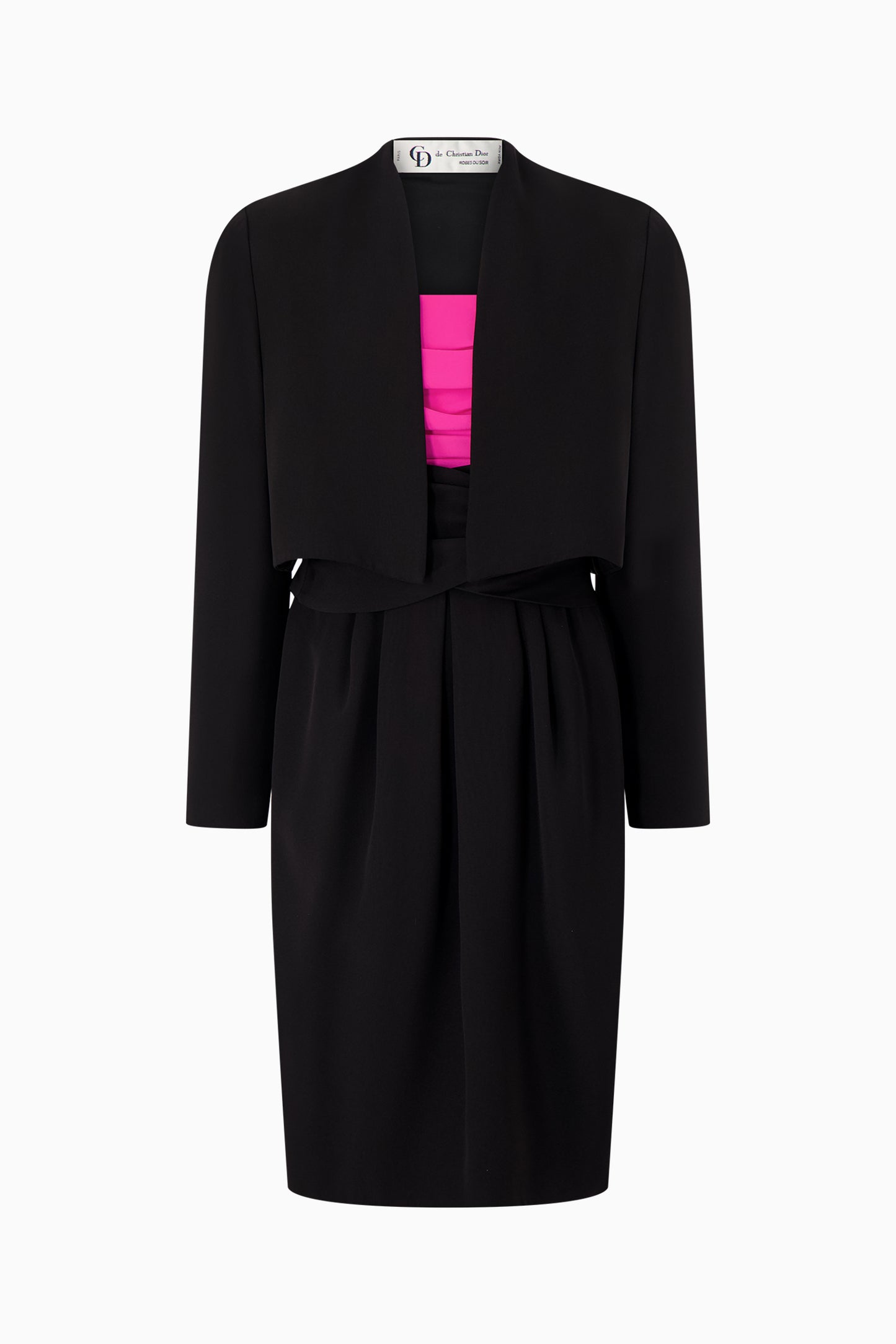Vintage Christian Dior dress and jacket. Midi-length dress with pink ruched bust. Cropped collarless jacket.
