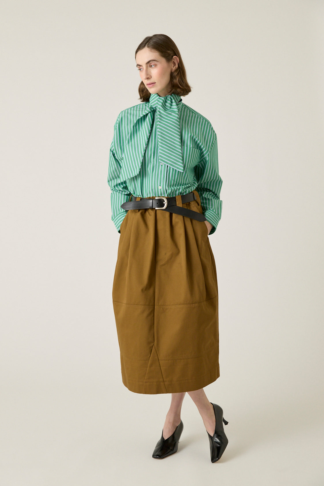 Long-sleeve striped shirt with an attached scarf tie at the collar. Straight, relaxed fit with button front and cuffs.