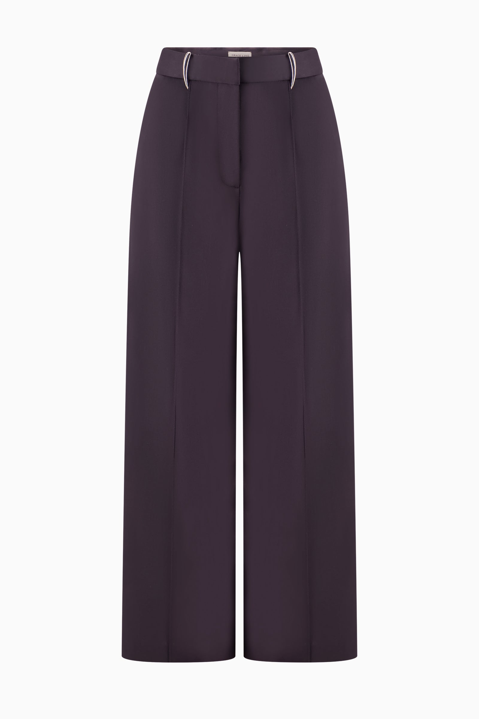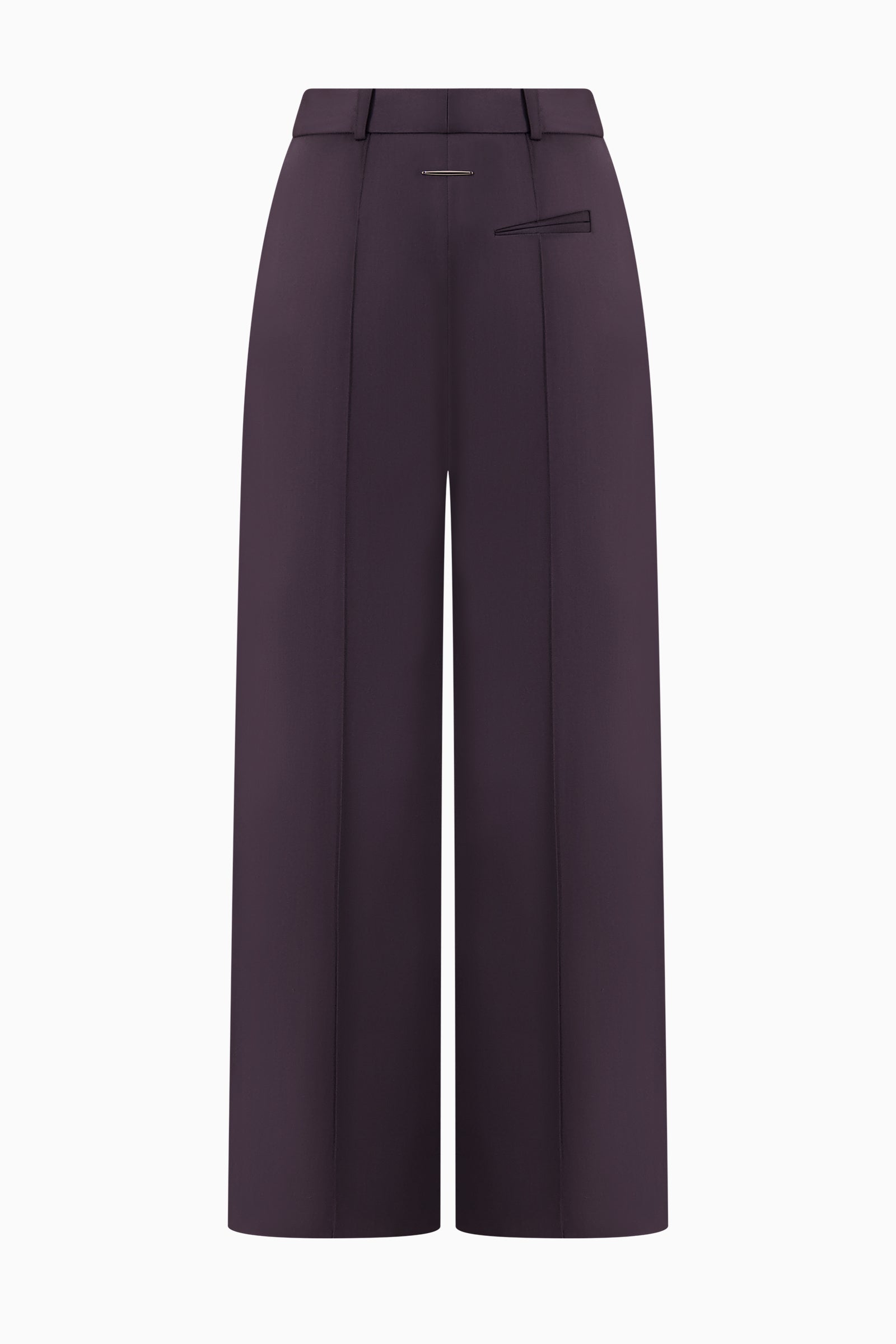 Tailored wide-leg trousers featuring claw clasp details at belt loops and sharp front pleats. Finished with welt pockets at the back.