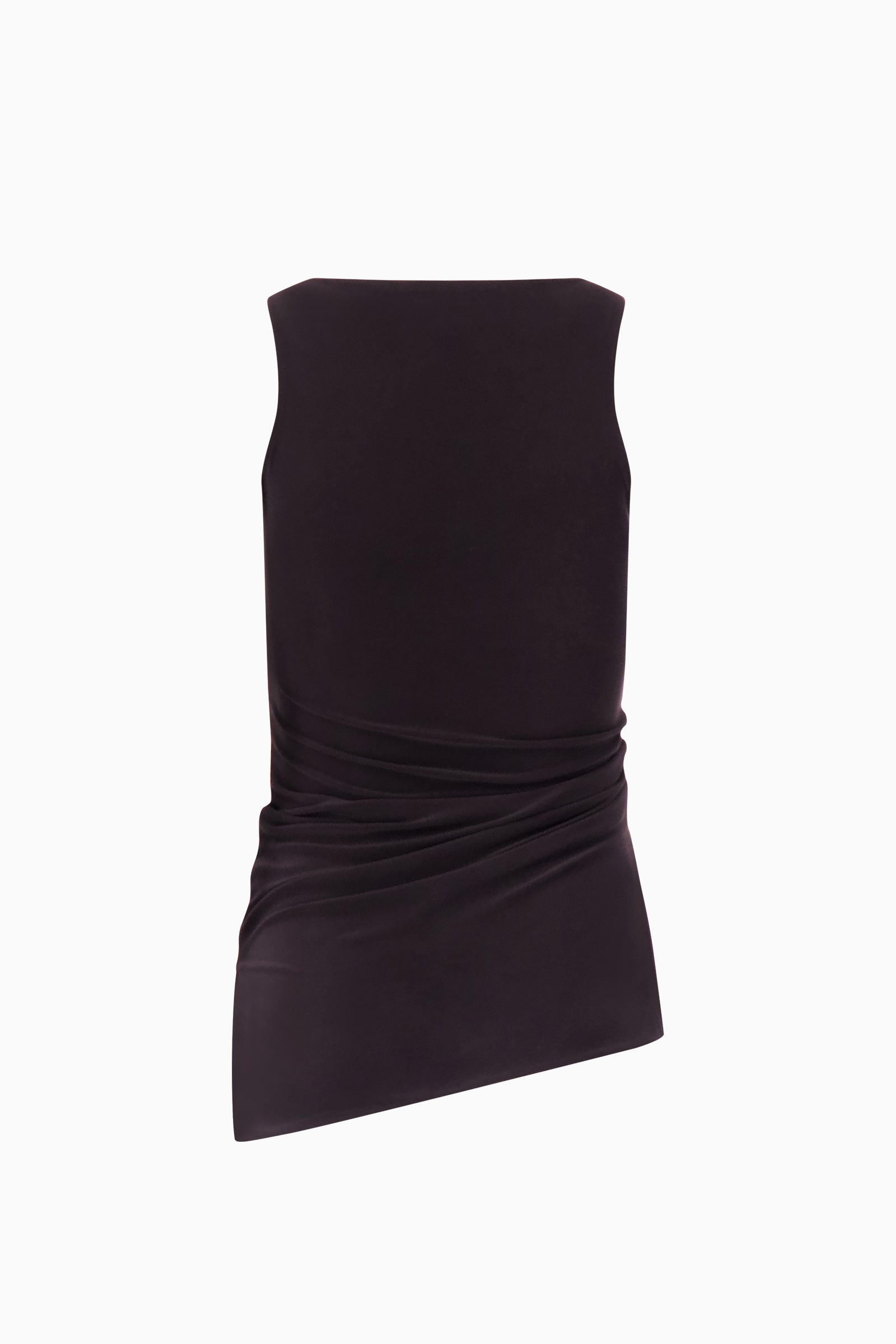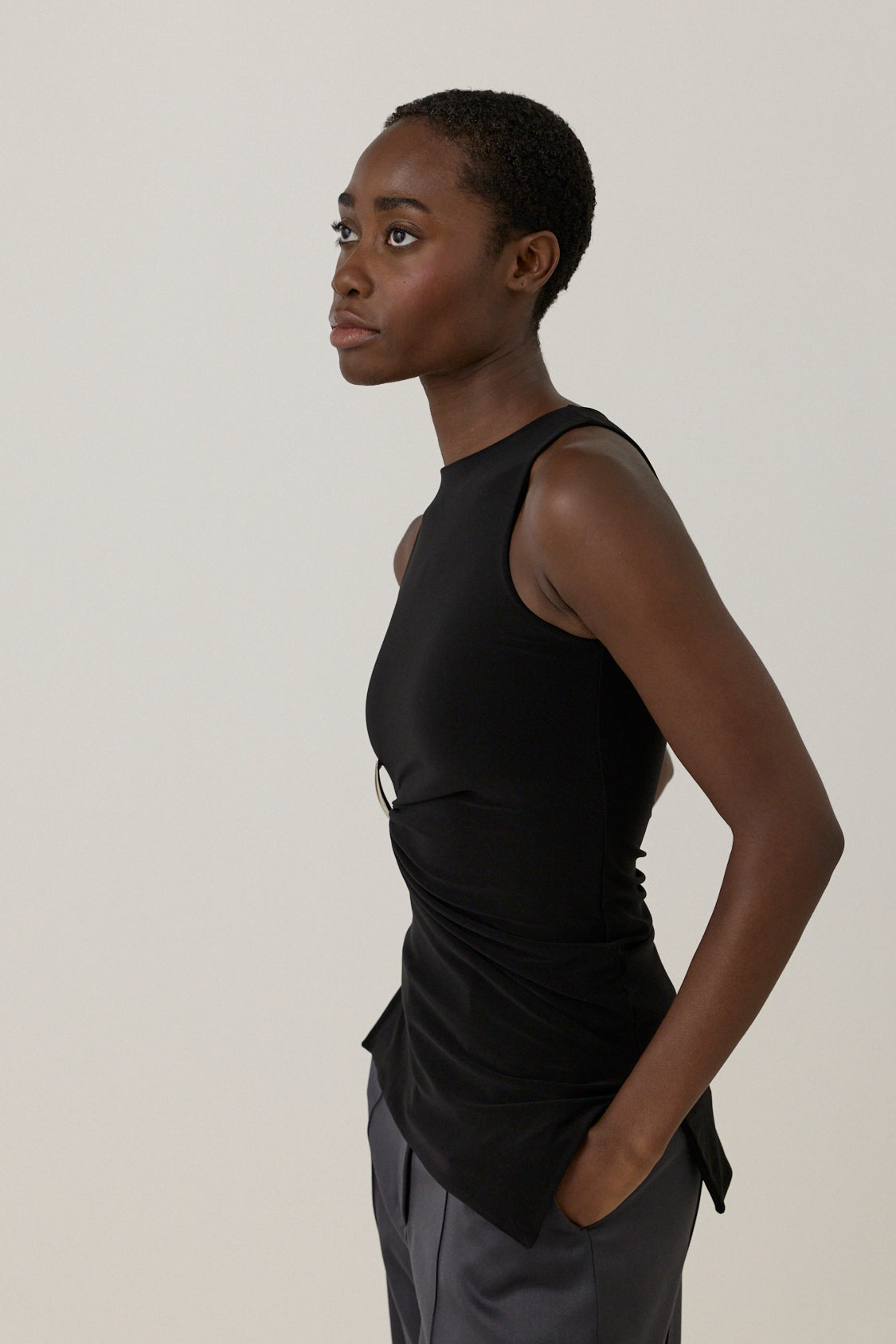Sleeveless draped tank with an asymmetric hemline, detailed with a claw clasp at the waist.