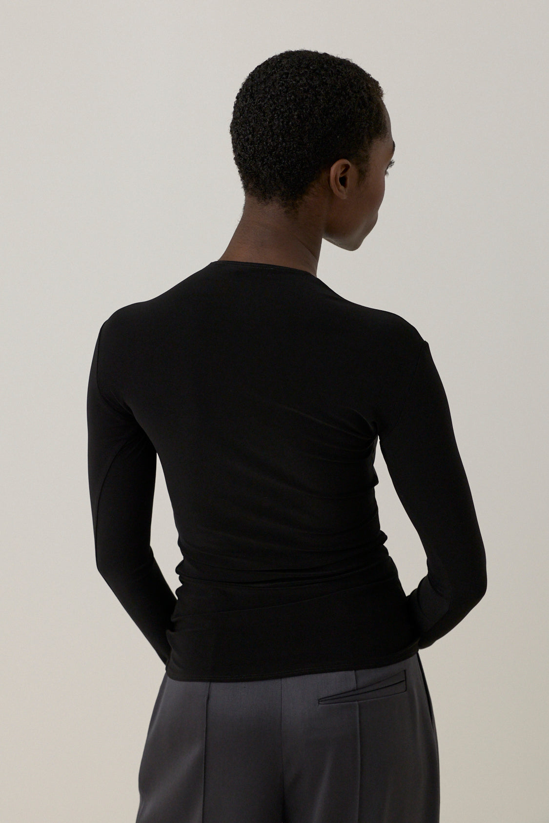 Long-sleeve fitted top with an asymmetric neckline, detailed with a claw clasp accent at the shoulder.