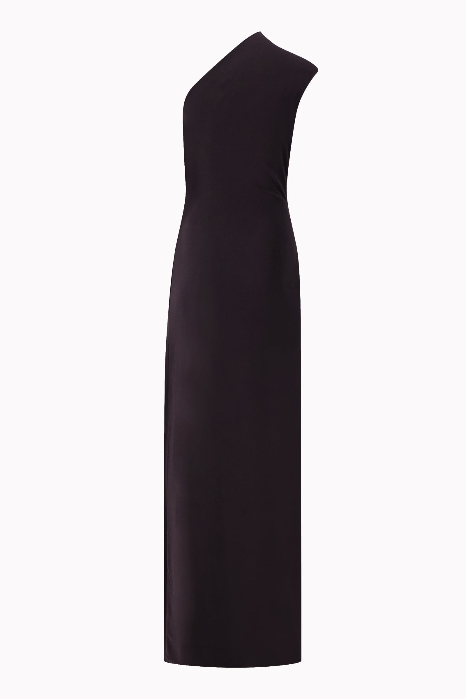 One-shoulder floor-length dress with draped detailing and sculptural claw clasps at the chest and hip. Designed with a slim, elongated silhouette.