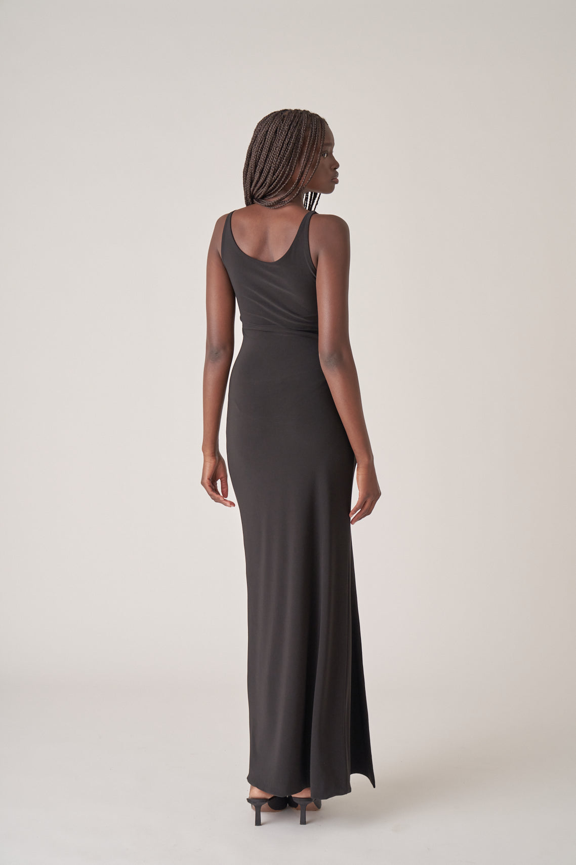Slip dress in jersey. Sculpted biomorphic "claw" metal trim cinching the fabric. High stretch. Scoop neck. Side slit.