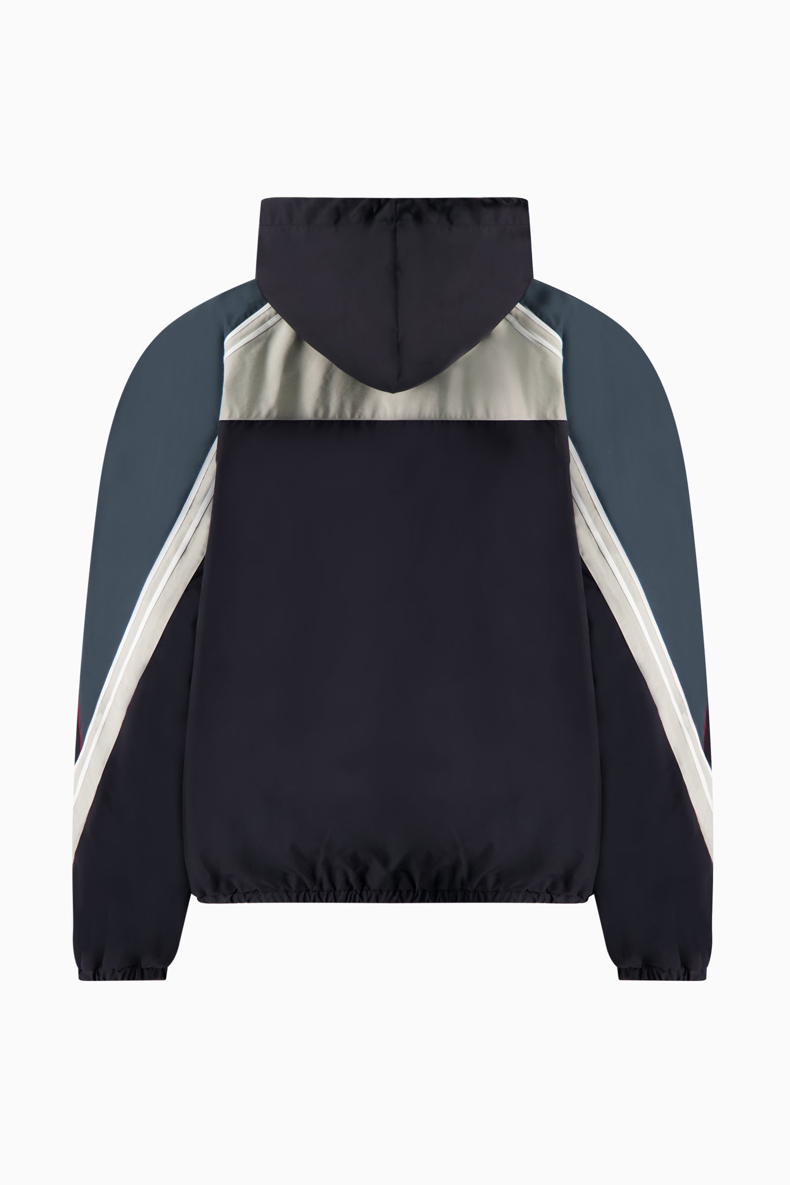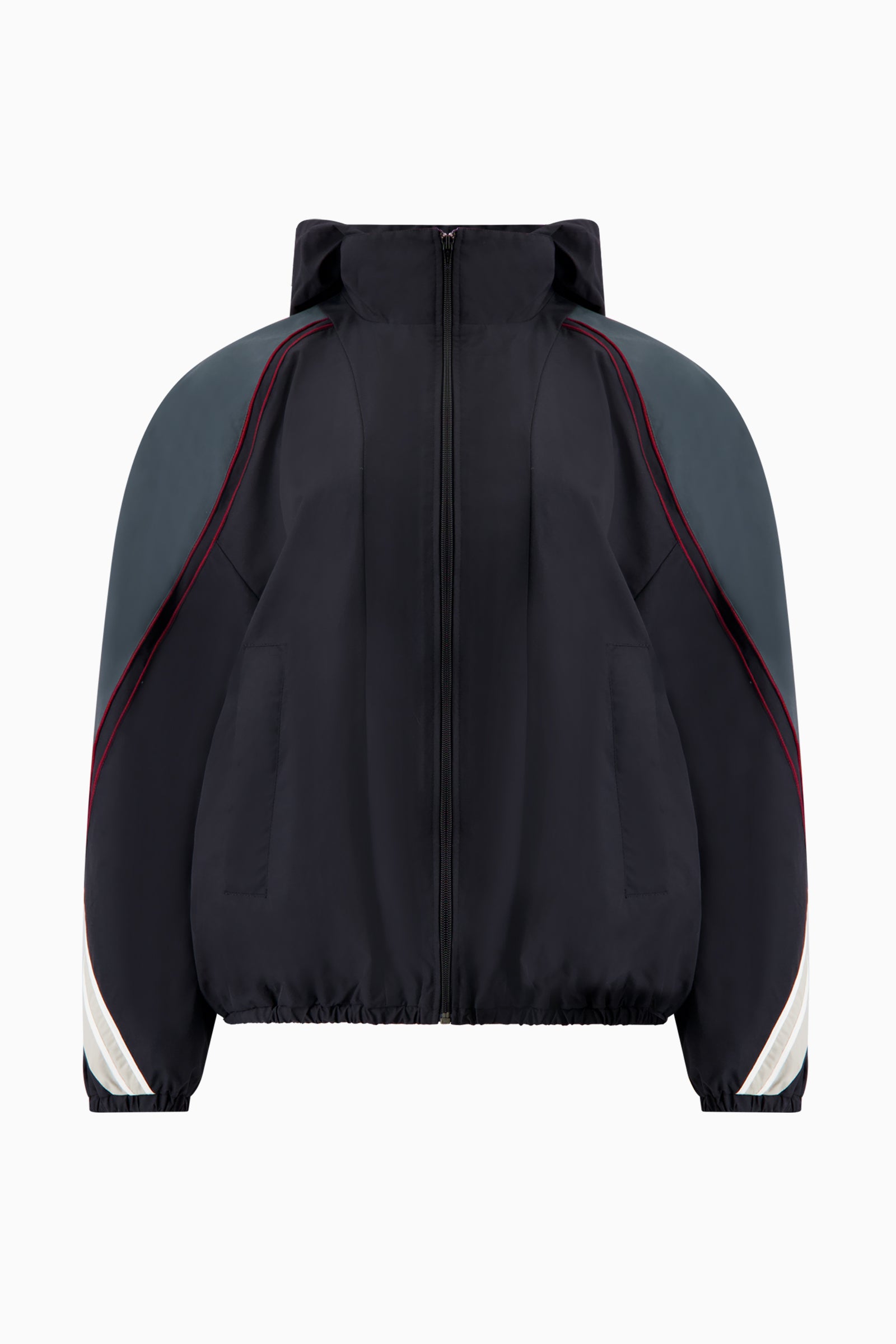Lightweight zip-front jacket with relaxed silhouette. Designed with a hood, elasticated hem and cuffs, and side seam pockets. Contrast paneling through the sleeves and back with subtle piping detail.