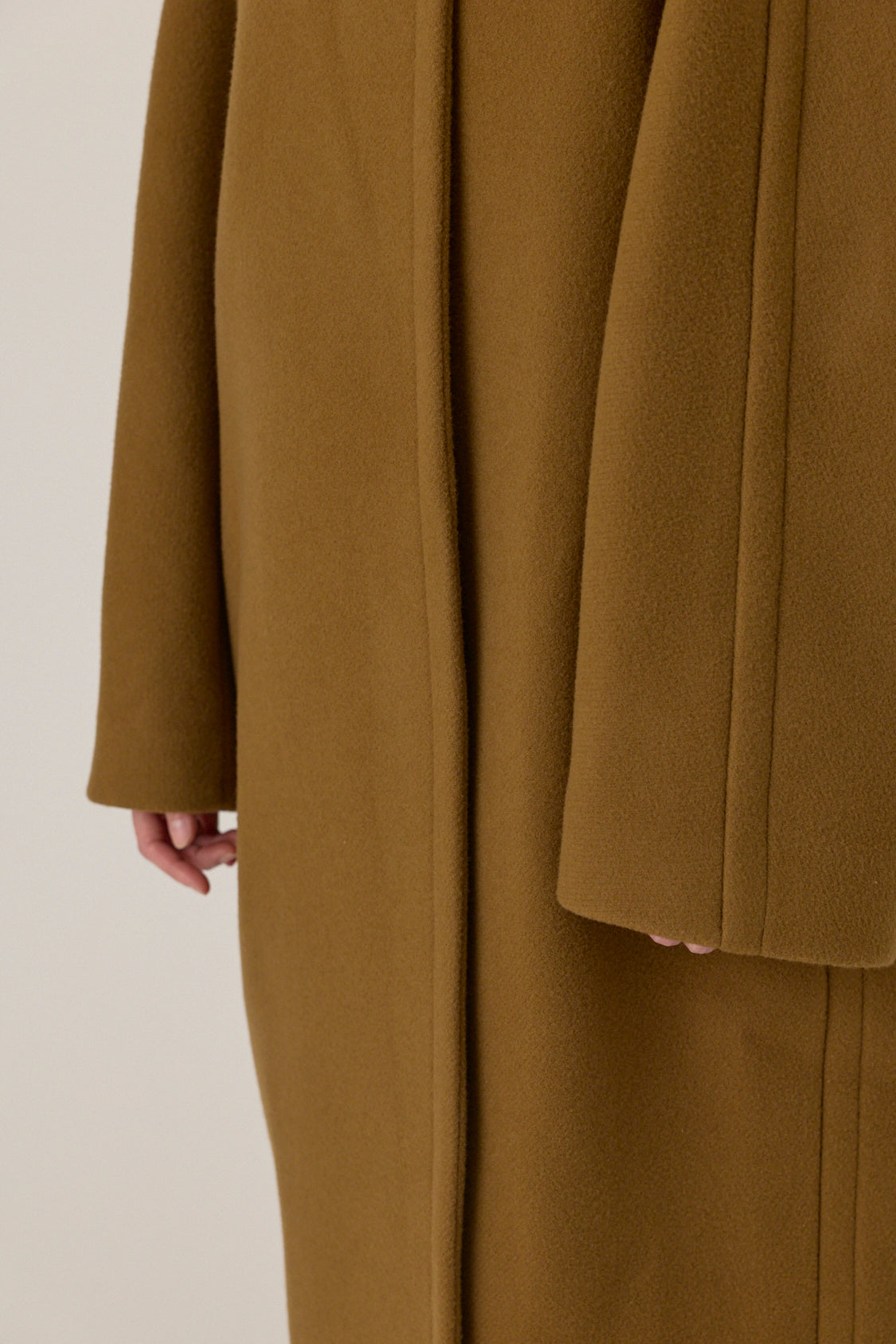 Voluminous coat with curved shoulder in double-face melton wool. Single button closure. Interior pocket. Lined. Oversized fit.