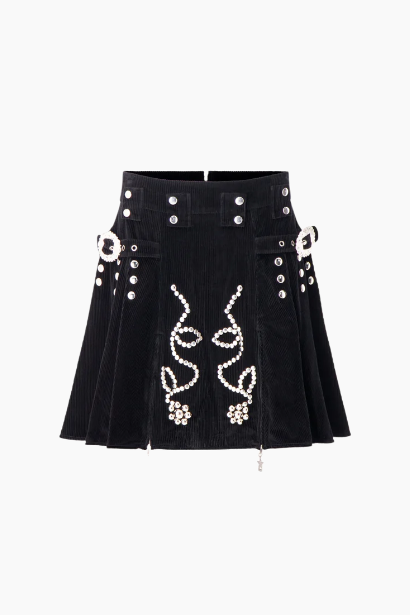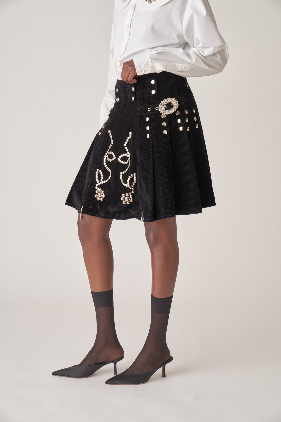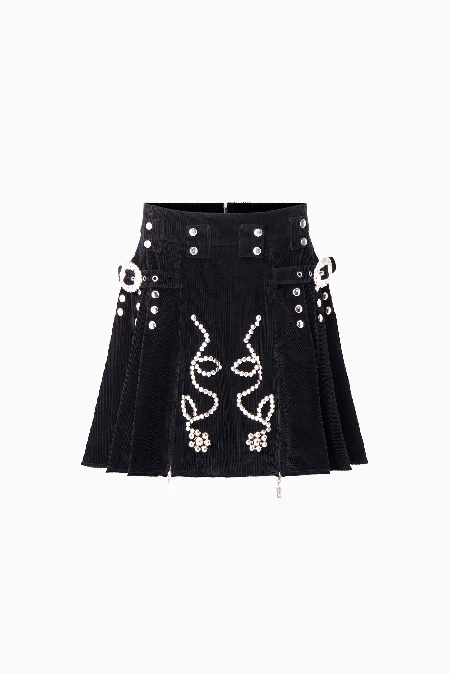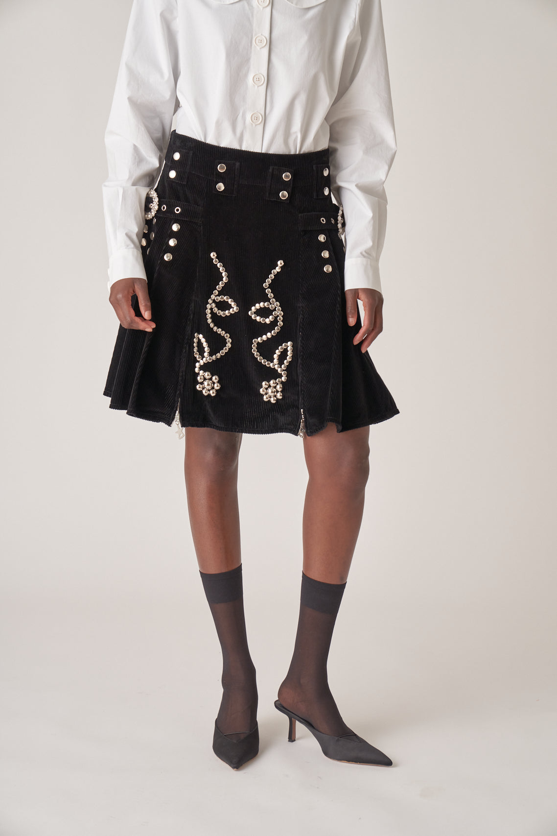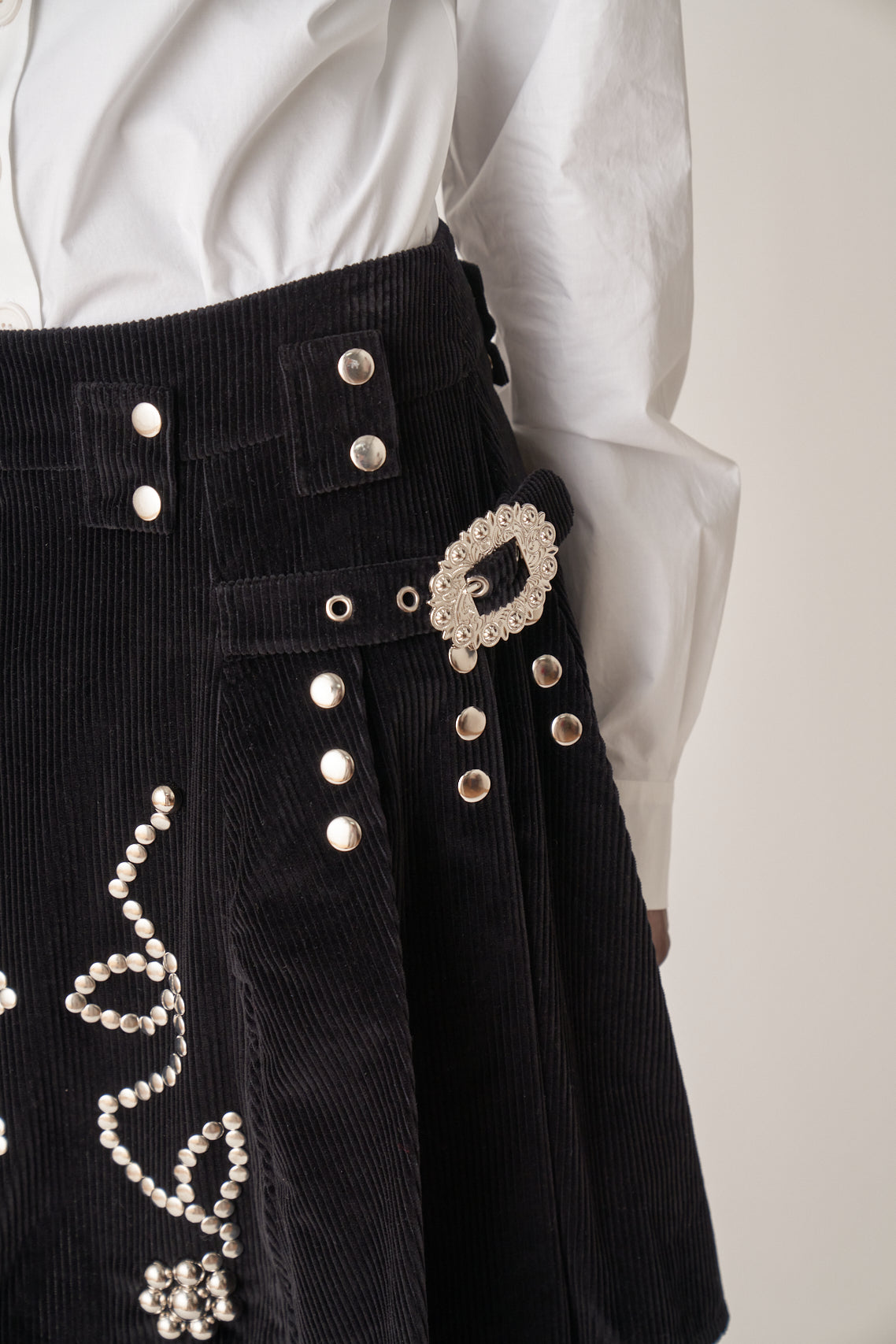 Cotton corduroy miniskirt. Pleats and studs throughout. Floral appliqués at front. Zip vents at front hem. Pin-buckle straps at sides. Zip closure at back