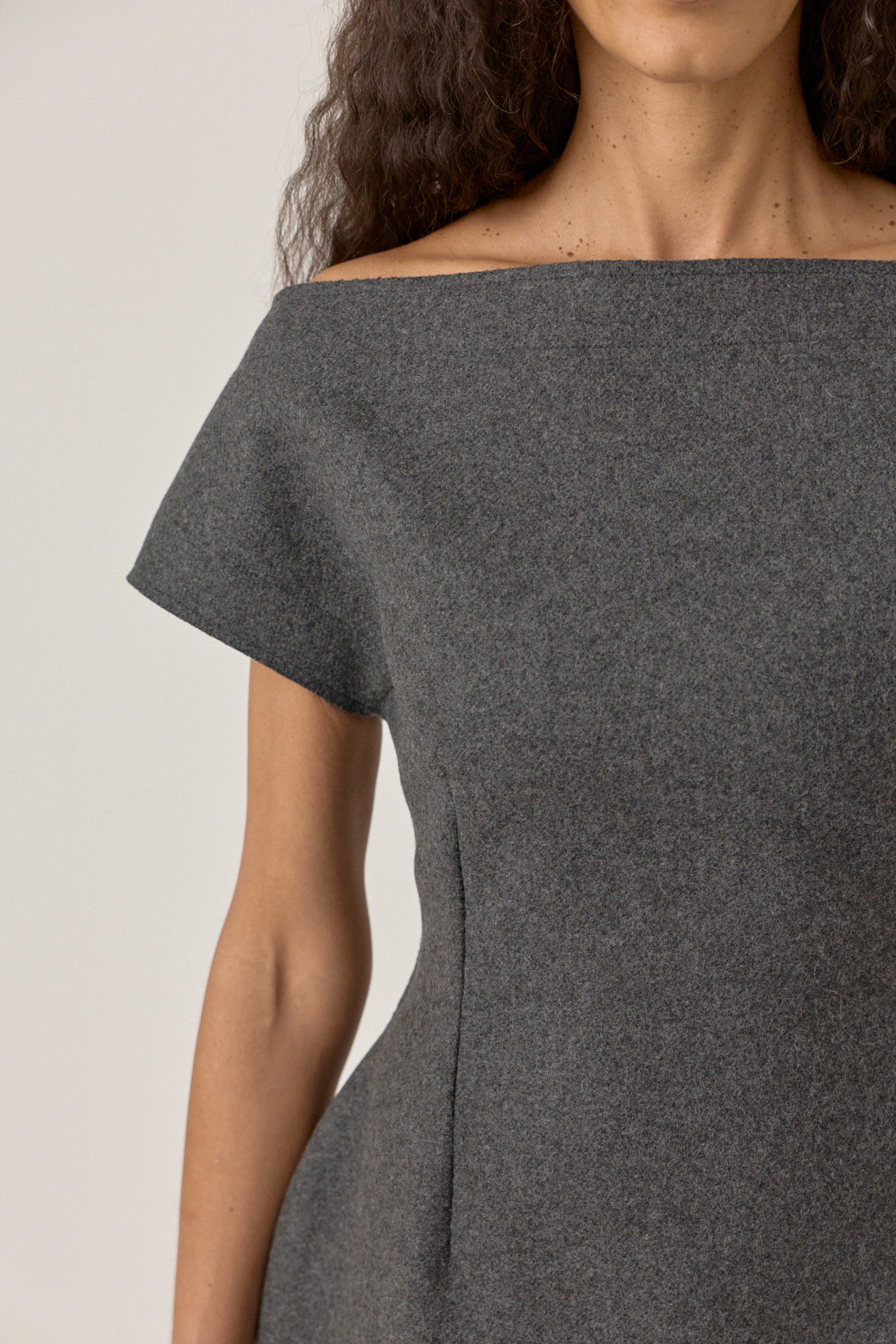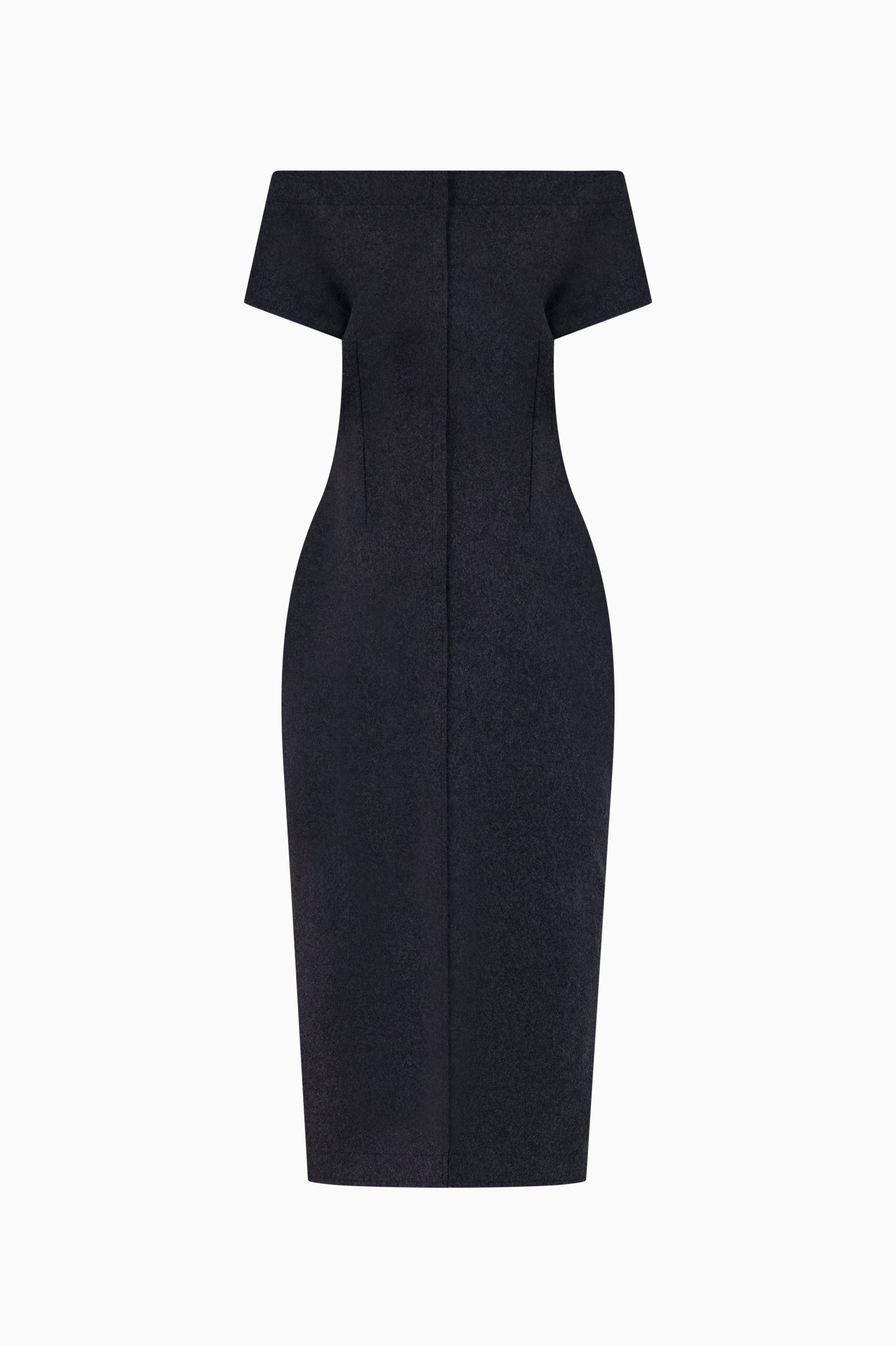Wool midi dress with structured off-shoulder neckline and fitted silhouette. Designed with clean paneling, short sleeves, and back zip closure. Fully lined.