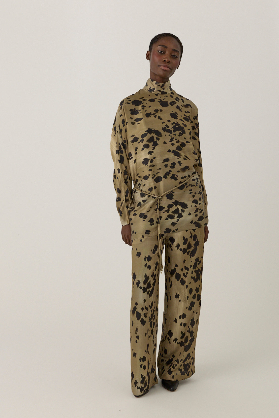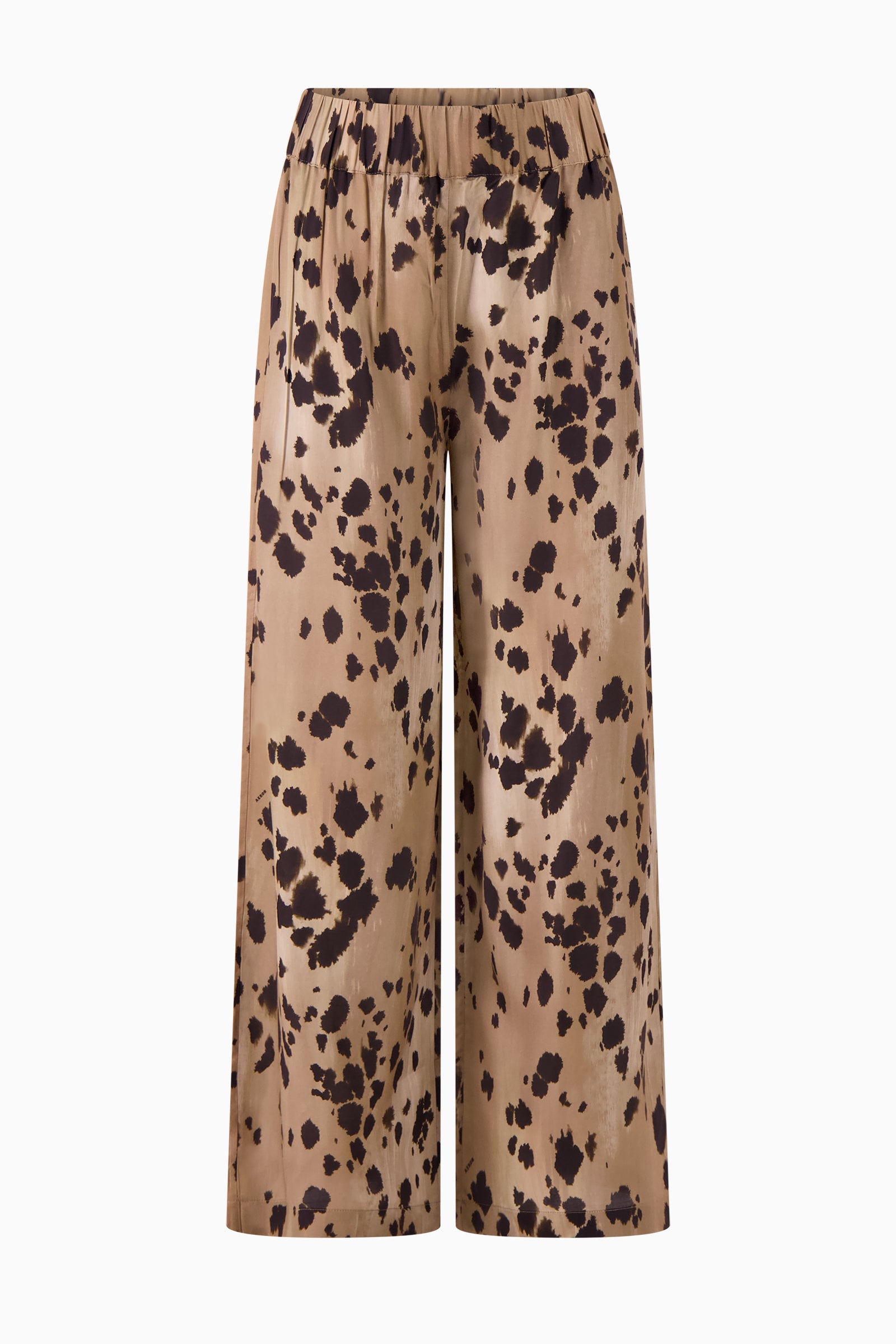 Fluid pants made of ocelot-printed viscose and silk blend. Cut to relaxed, wide-leg silhouette, featuring elasticated waistband and subtle back welt pockets.