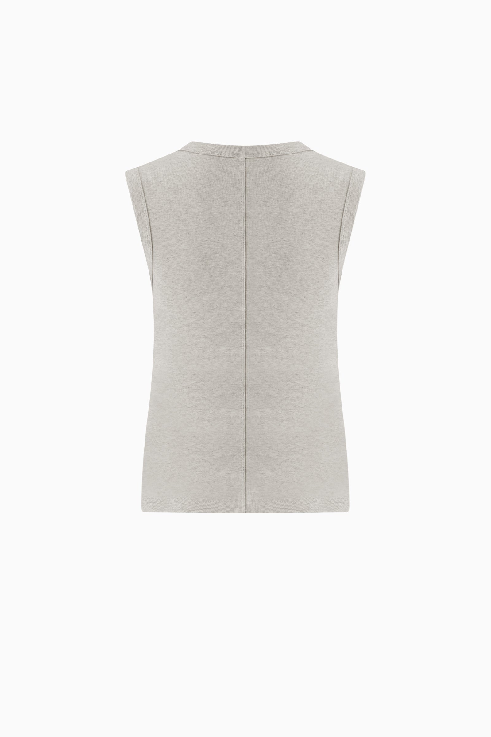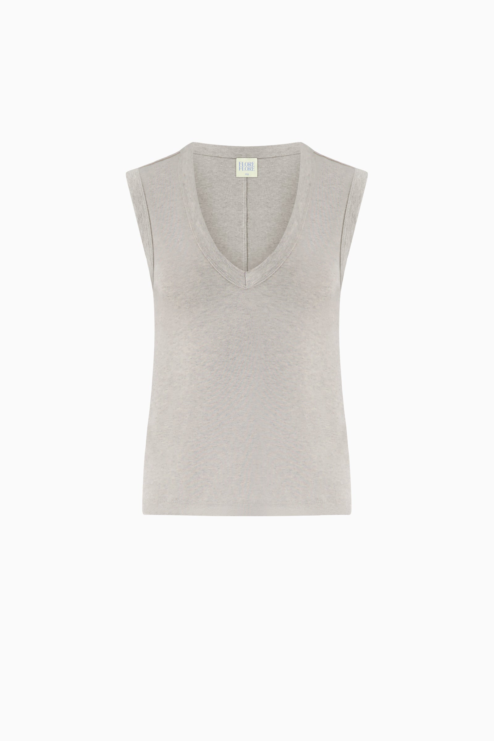 Deep v-neck tank with a scooped-out armhole made from medium-weight organic cotton.