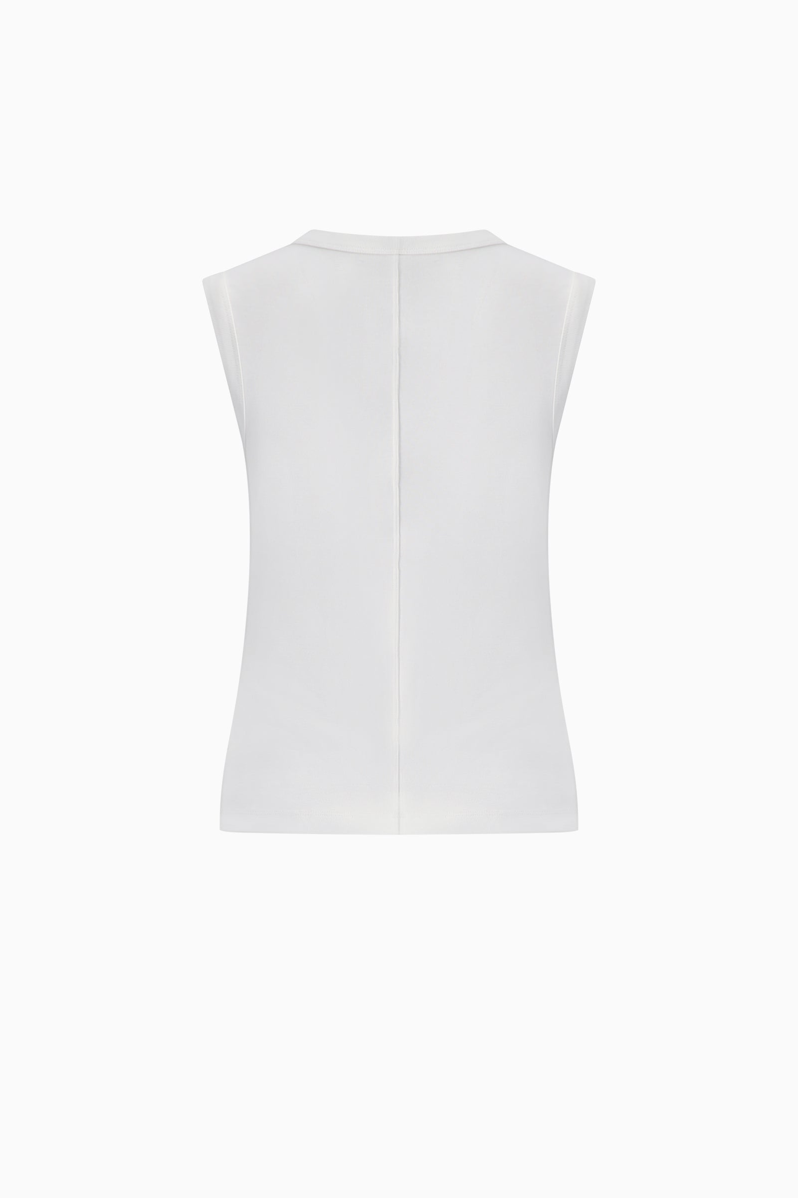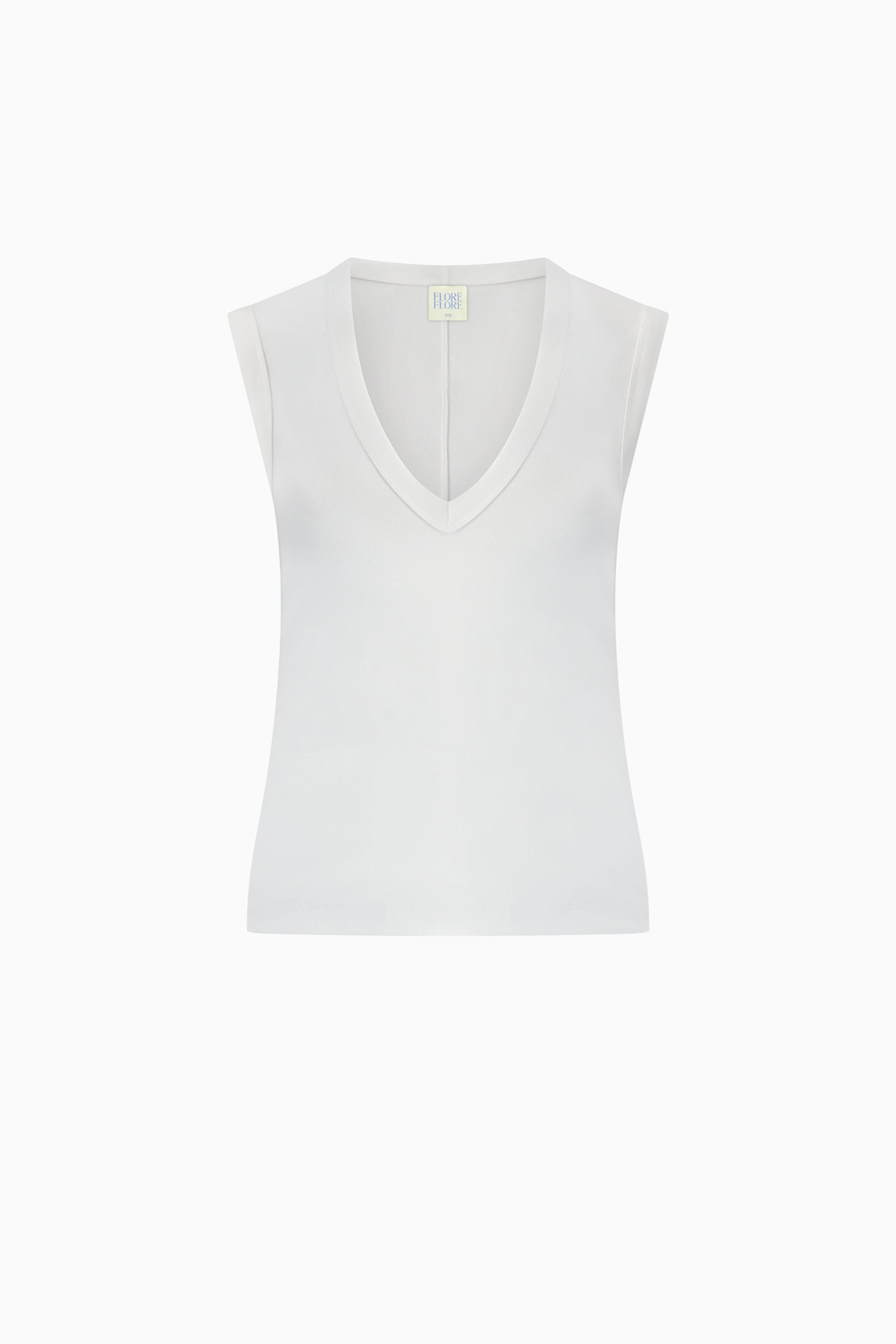 Deep v-neck tank with a scooped-out armhole made from medium-weight organic cotton.