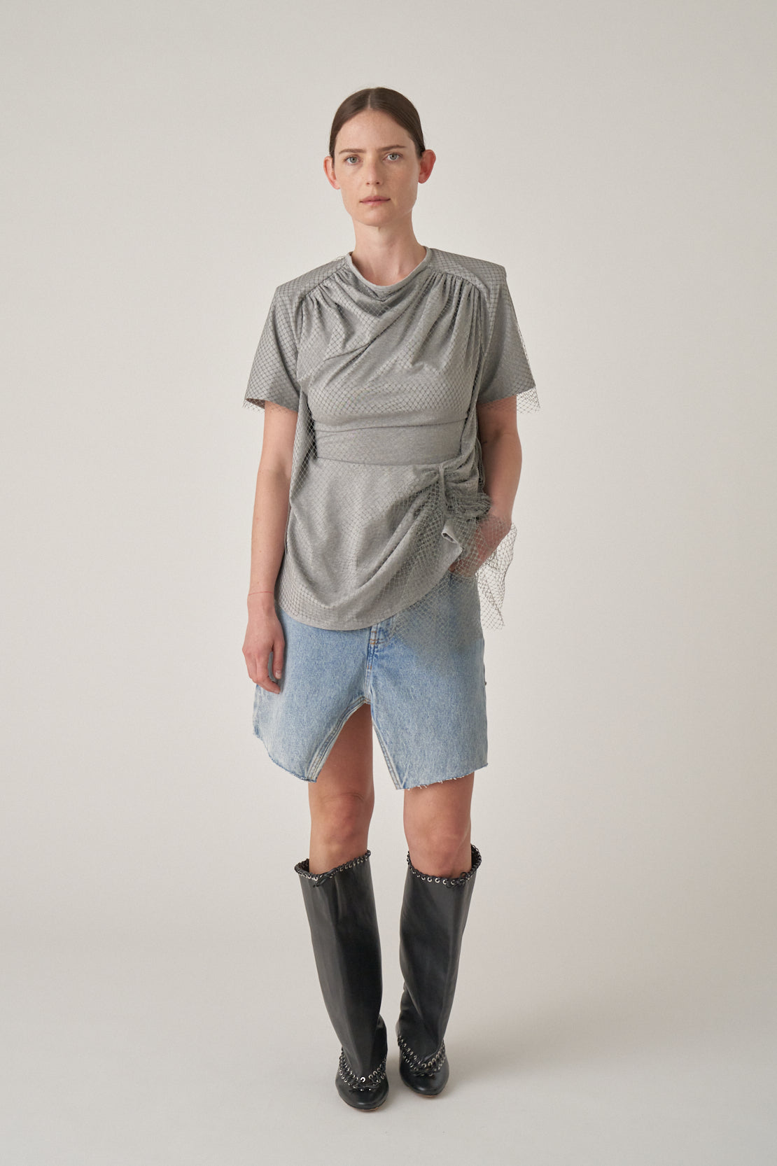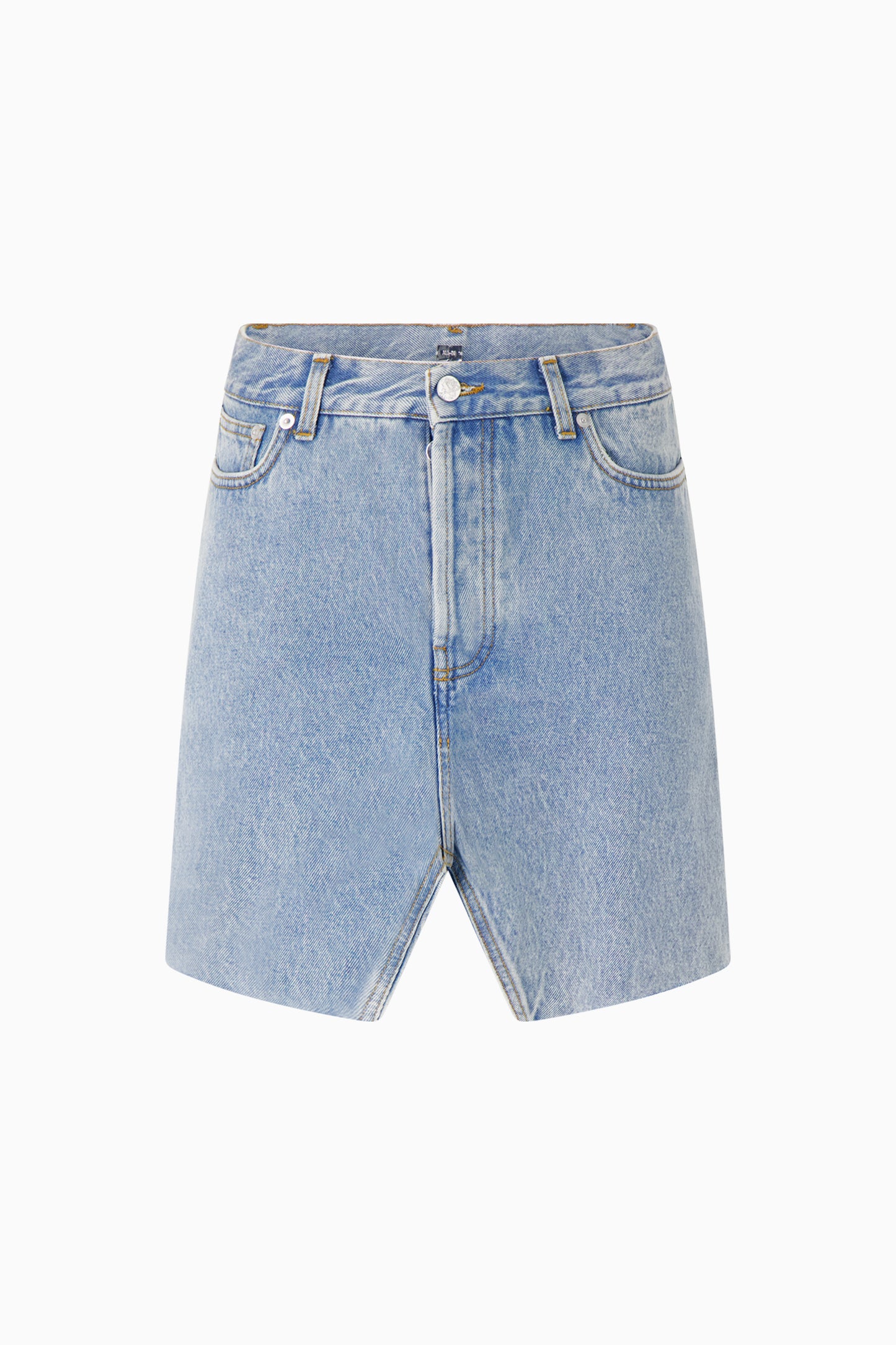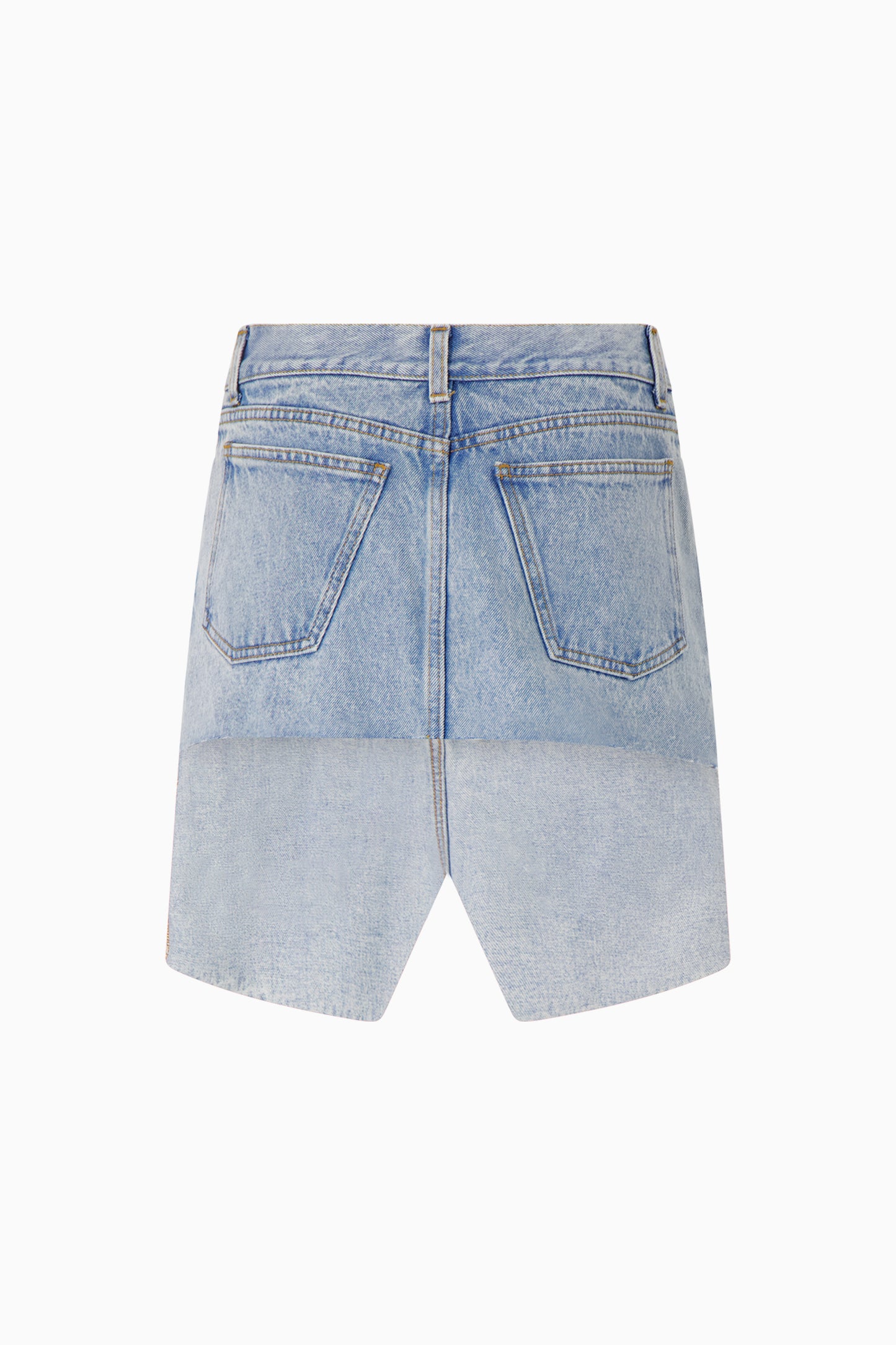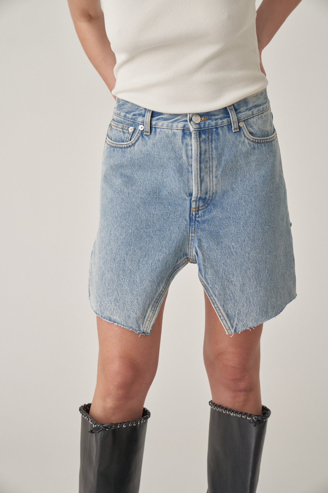 Deconstructed denim skirt that resembled shorts from the front. Drop front fabric. Button waist closure. Mini skirt length.
