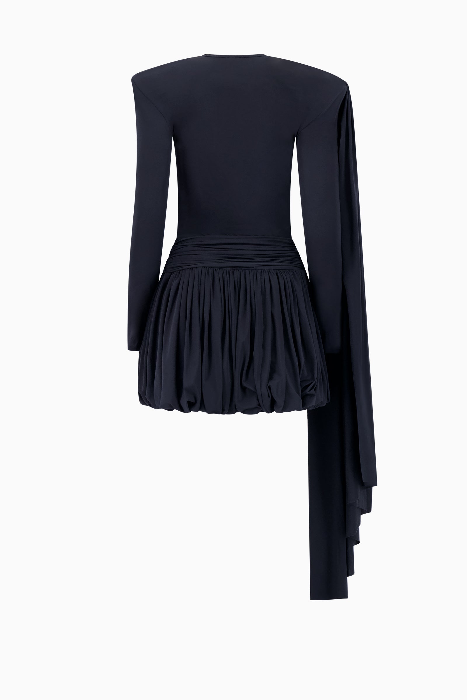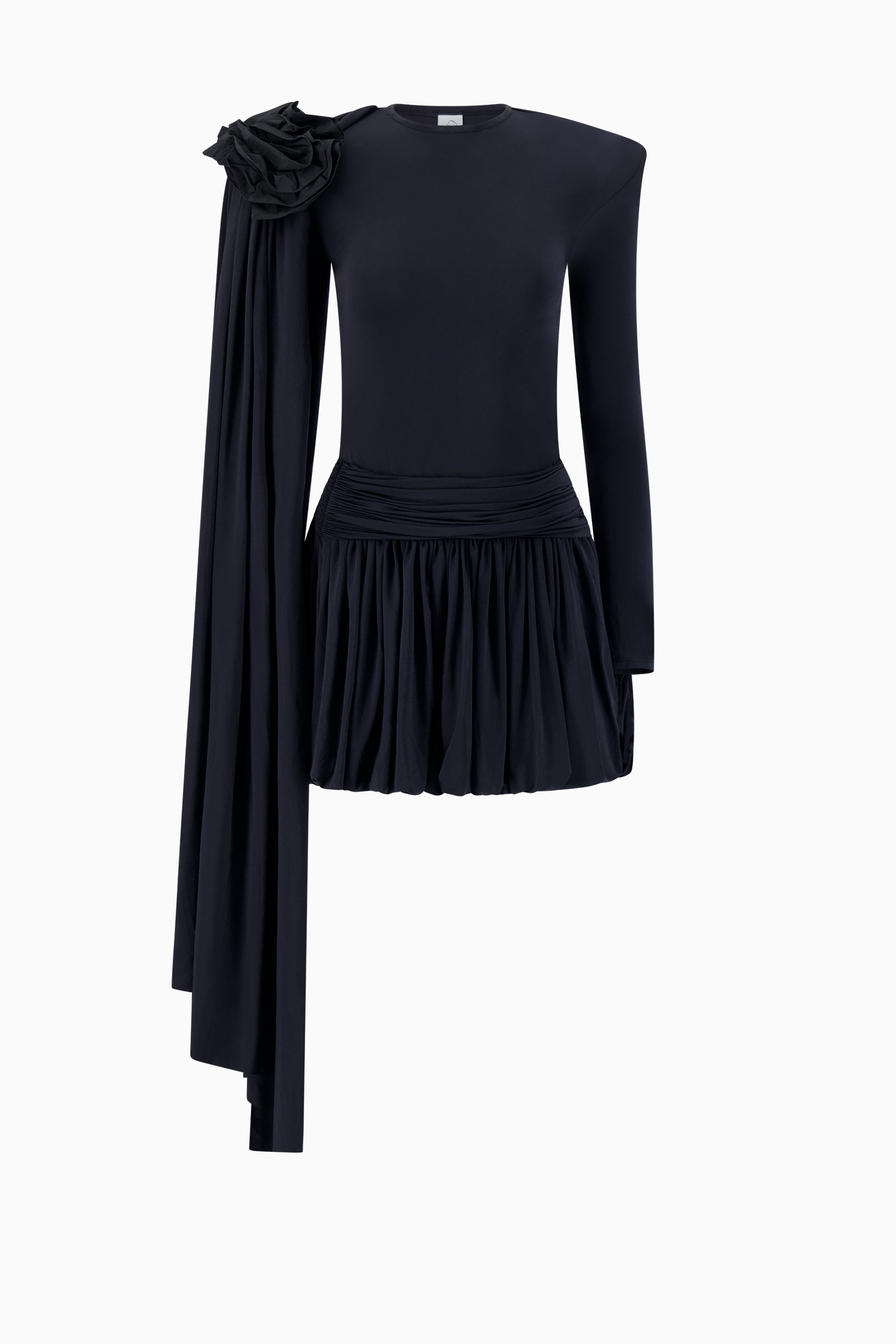 Fitted stretch drop waist dress with long sleeves. Crew neck collar. Gathered asymmetrical sash at waist. Gathered bubble mini skirt. Gathered asymmetrical panel at right shoulder seam with ruched flower detail. Panel can be styled in multiple ways.