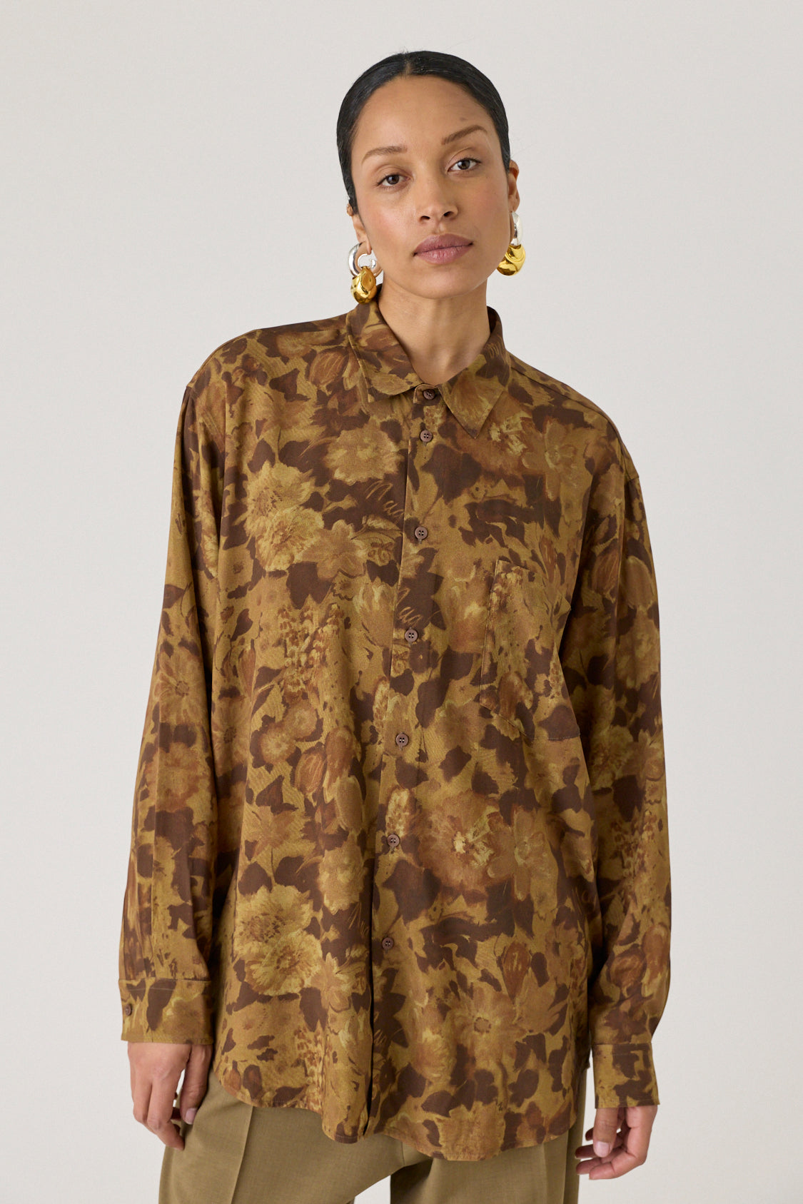 Long-sleeve button-down shirt in a lightweight printed fabric. Classic collar with relaxed, straight fit and curved hem. Single chest patch pocket.