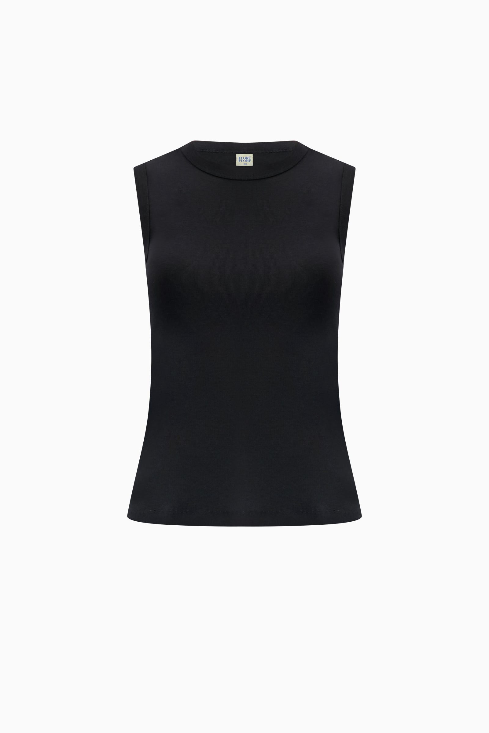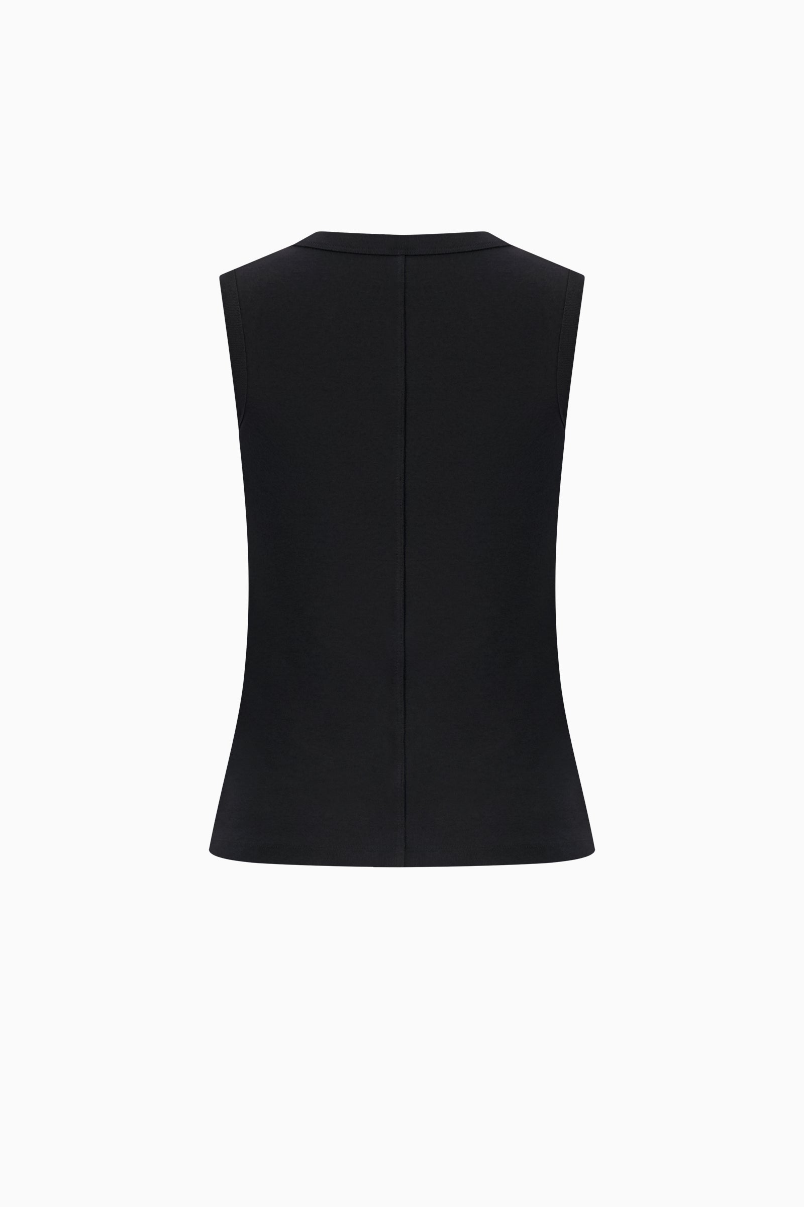 Fitted crew neck tank with scooped-out armholes and a cut-off seam on the back, crafted from medium-weight organic cotton rib.