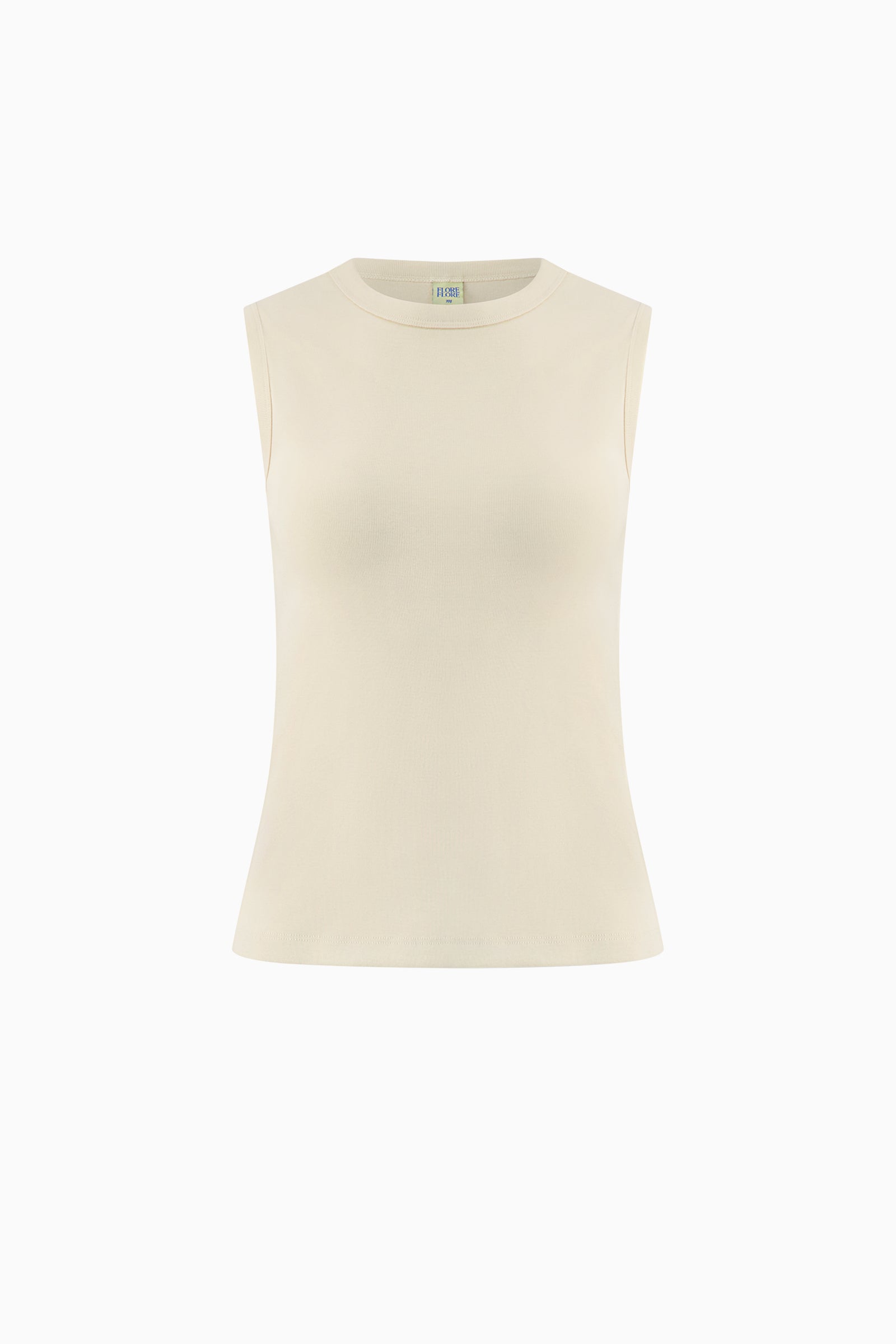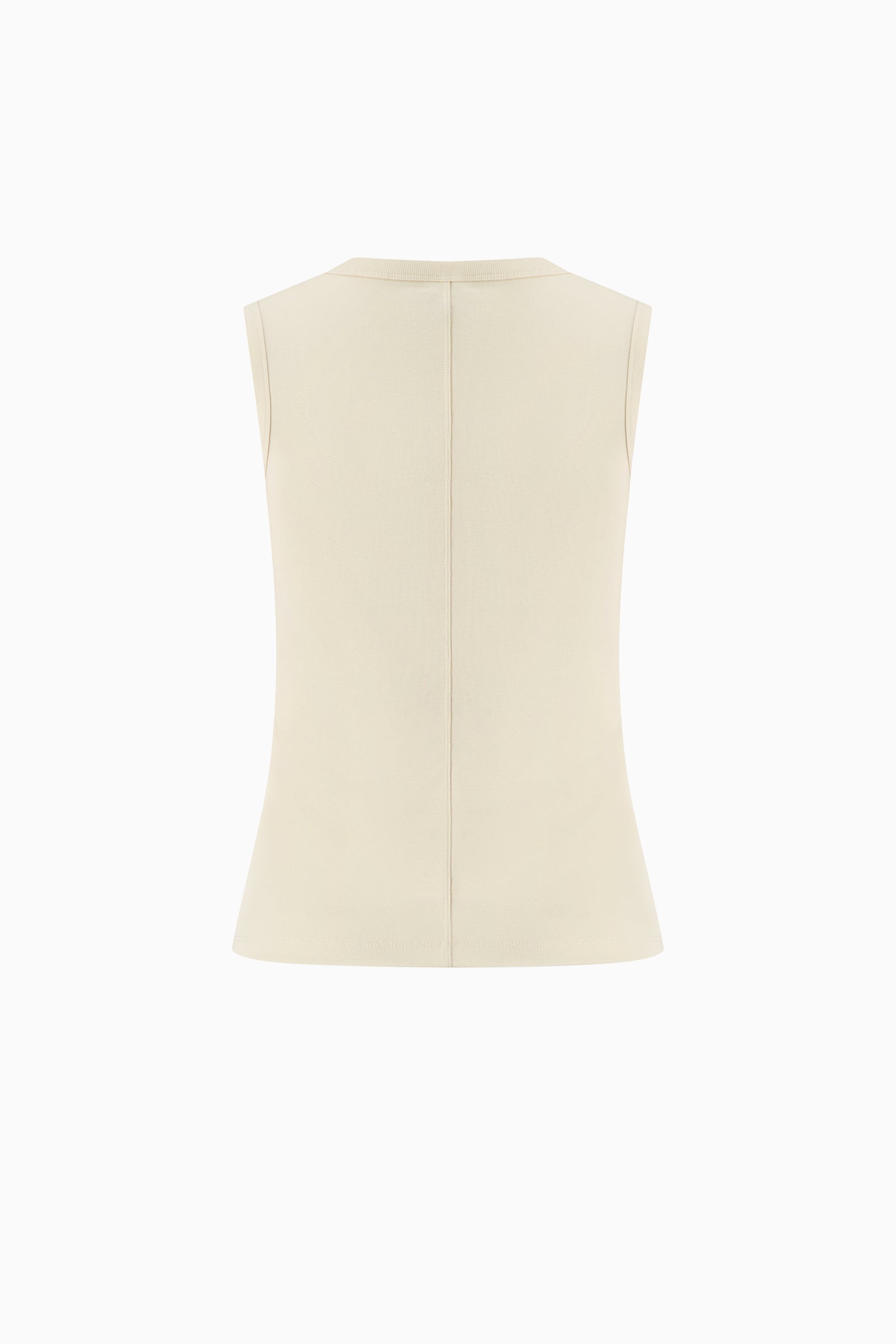 Fitted crew neck tank with scooped-out armholes and a cut-off seam on the back, crafted from medium-weight organic cotton rib.