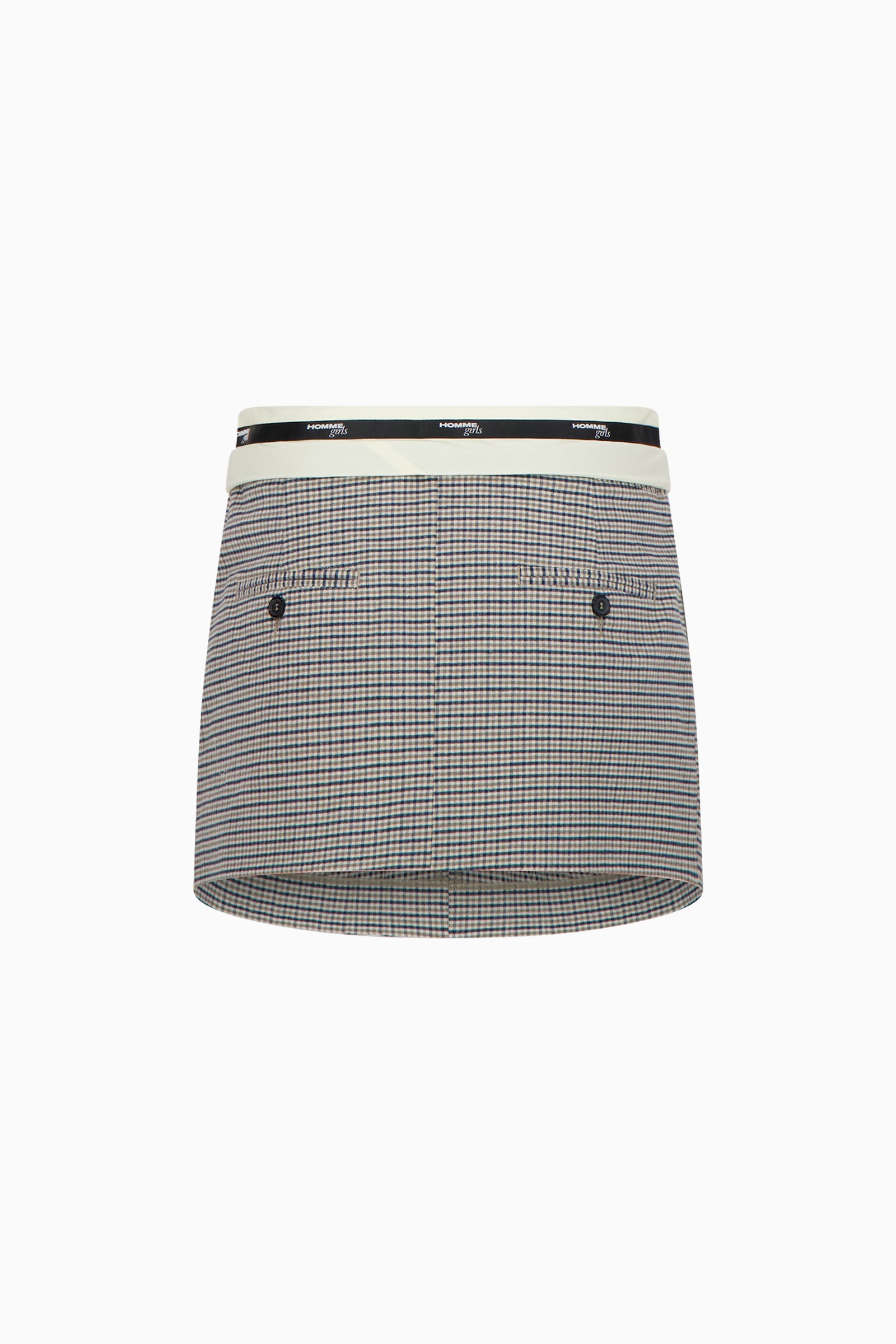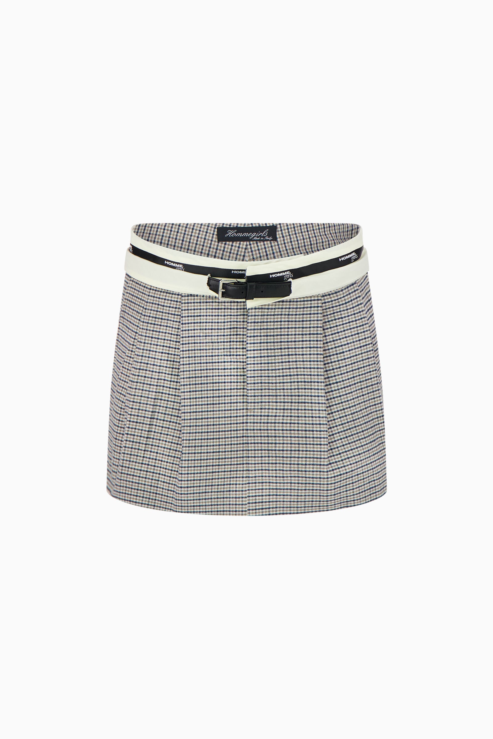 Cotton flannel mini skirt in check plaid with detachable leather pin-buckle belt. Featuring fixed foldover waistband with logo-patterned trim, four-pocket styling, zip fly, and pleats at front.