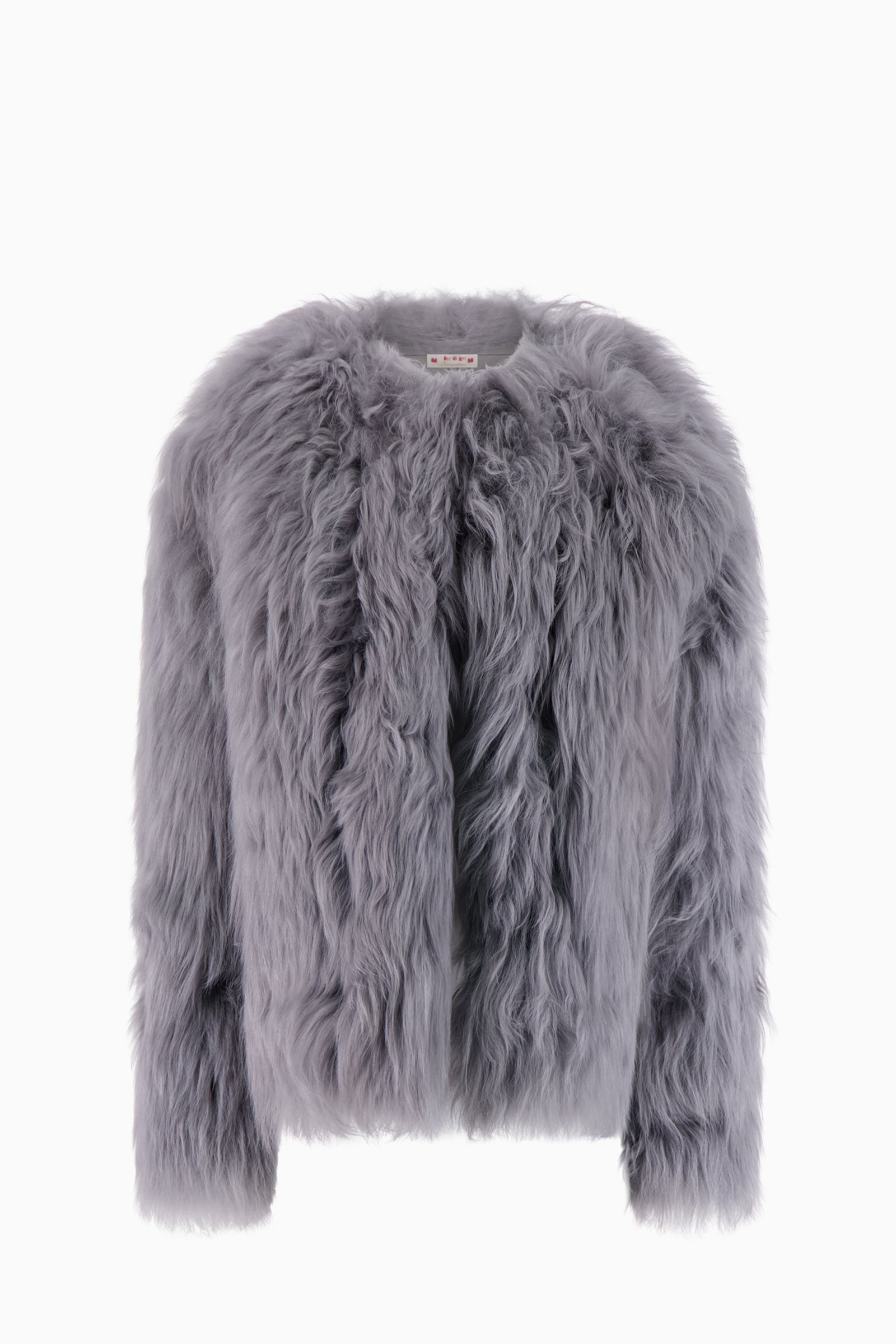 Grey goat shearling jacket with soft, curly texture. Collarless neckline, long sleeves, concealed front closure, and full lining.