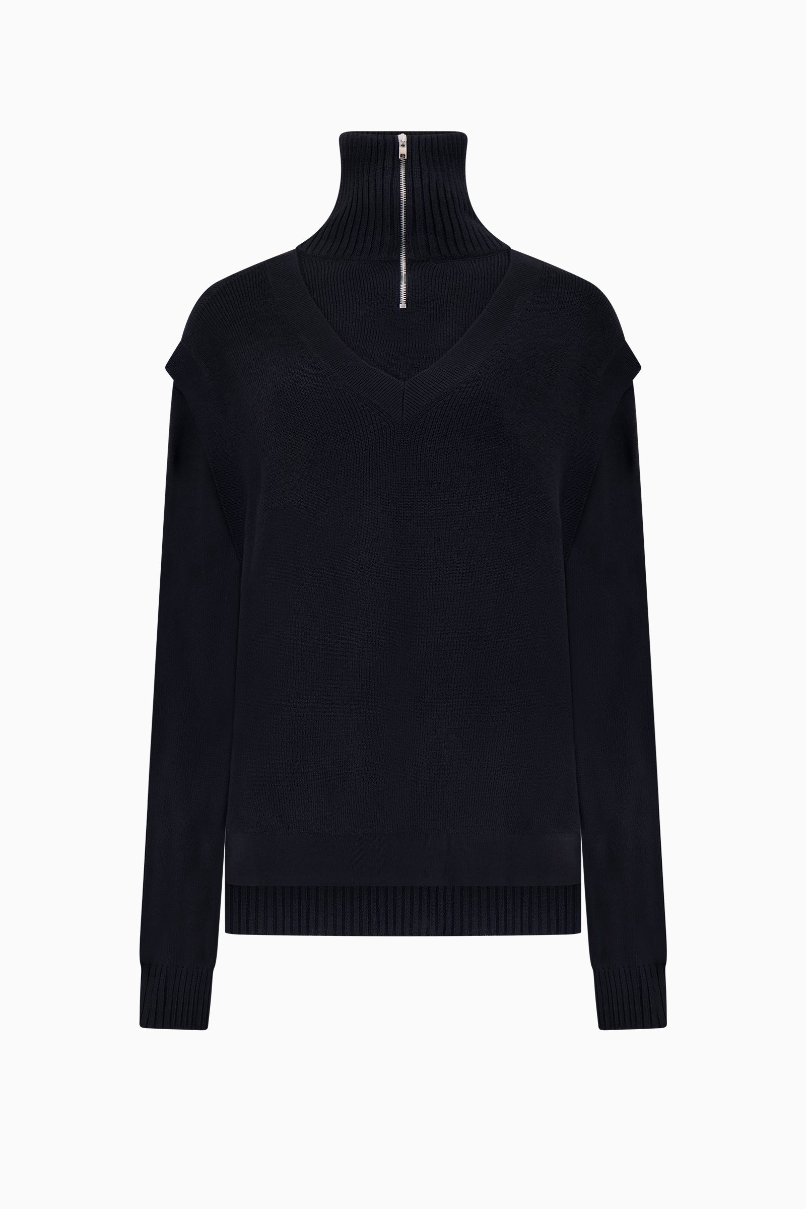 Modular wool sweater designed for multiple styling options. Finished with ribbed cuffs and hem. Half zip.