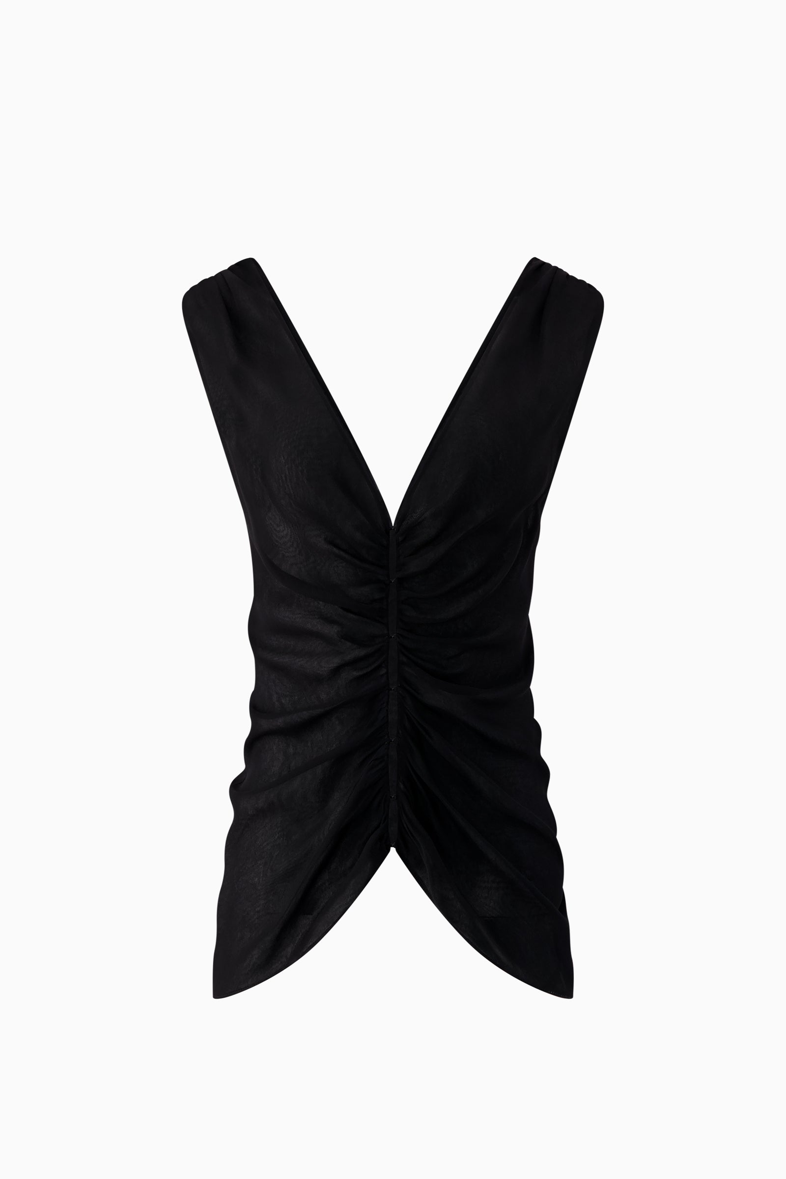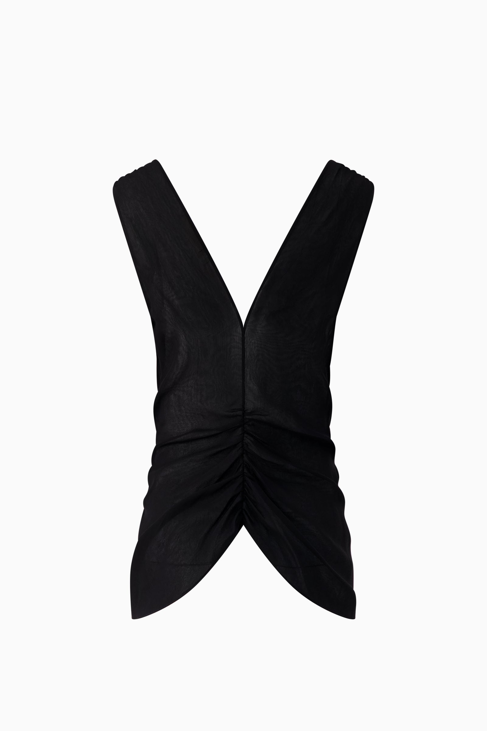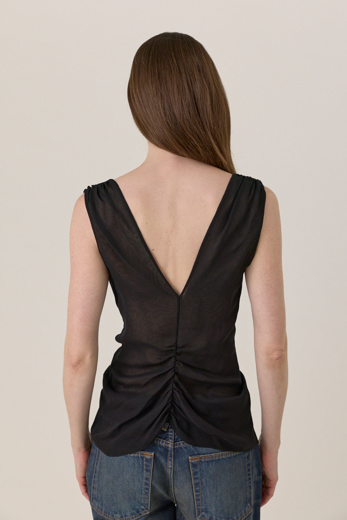 Sleeveless top made from two layers of silk chiffon, ruched along the bodice. Hook and eye fastening.