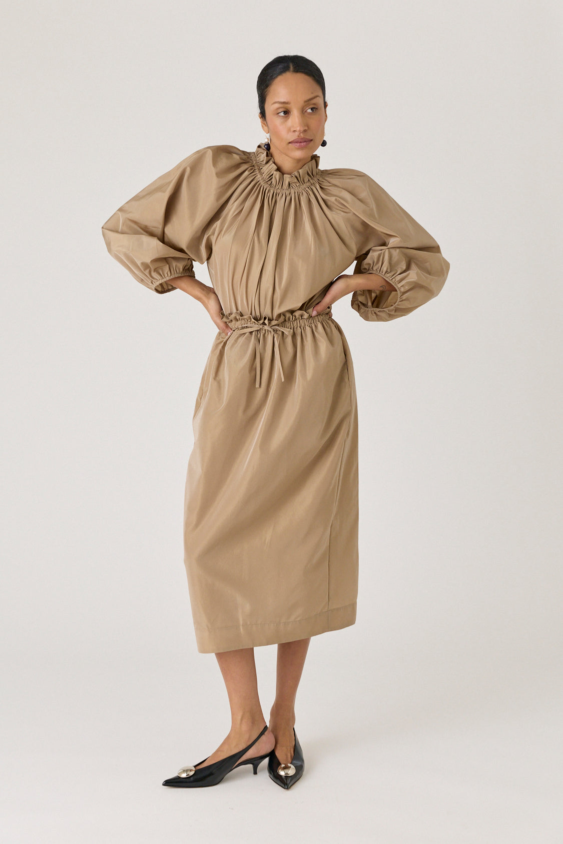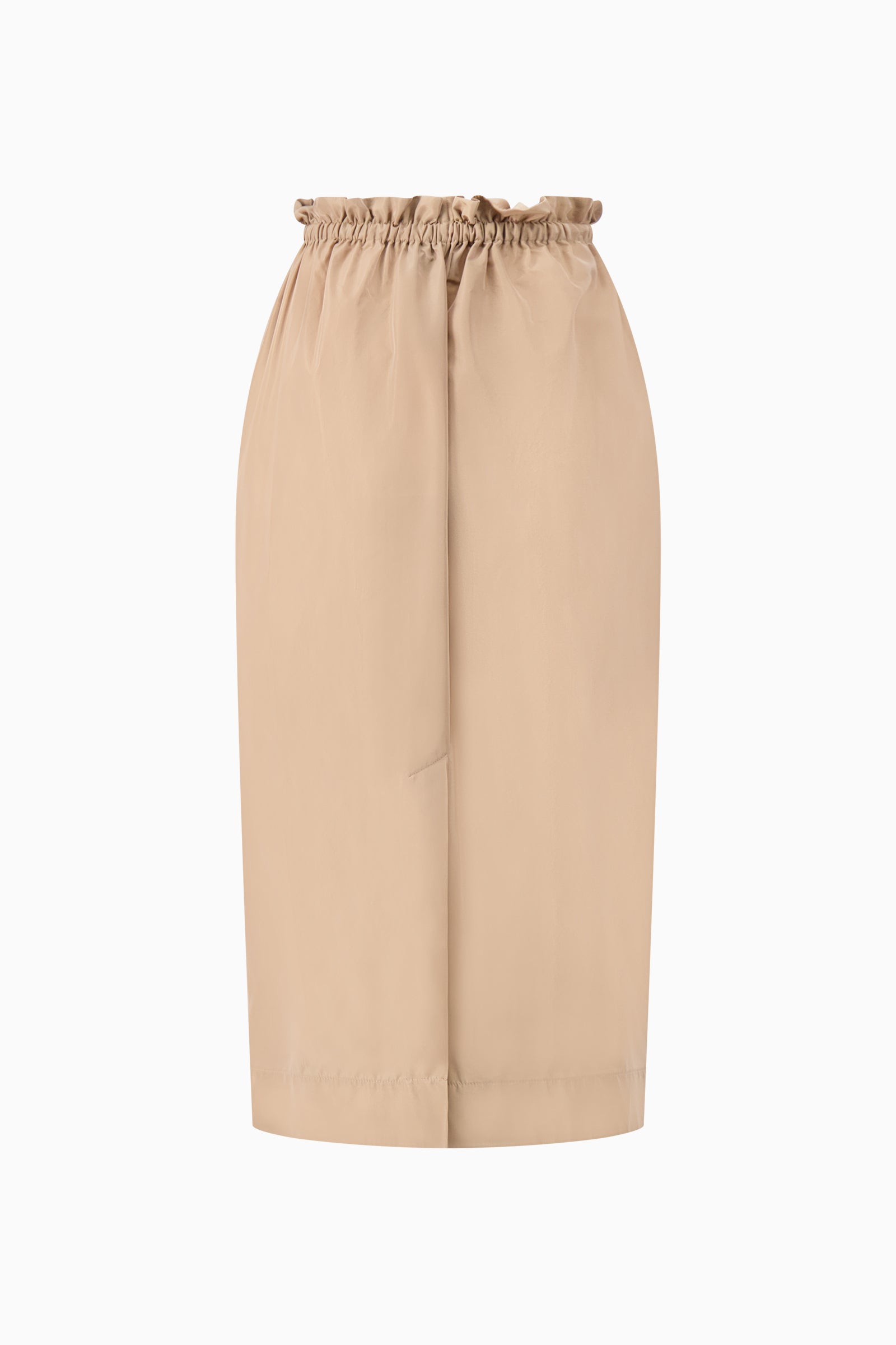 Midi skirt in a crisp woven fabric. High gathered waist with an adjustable drawstring tie. Relaxed, straight silhouette with a clean hem.