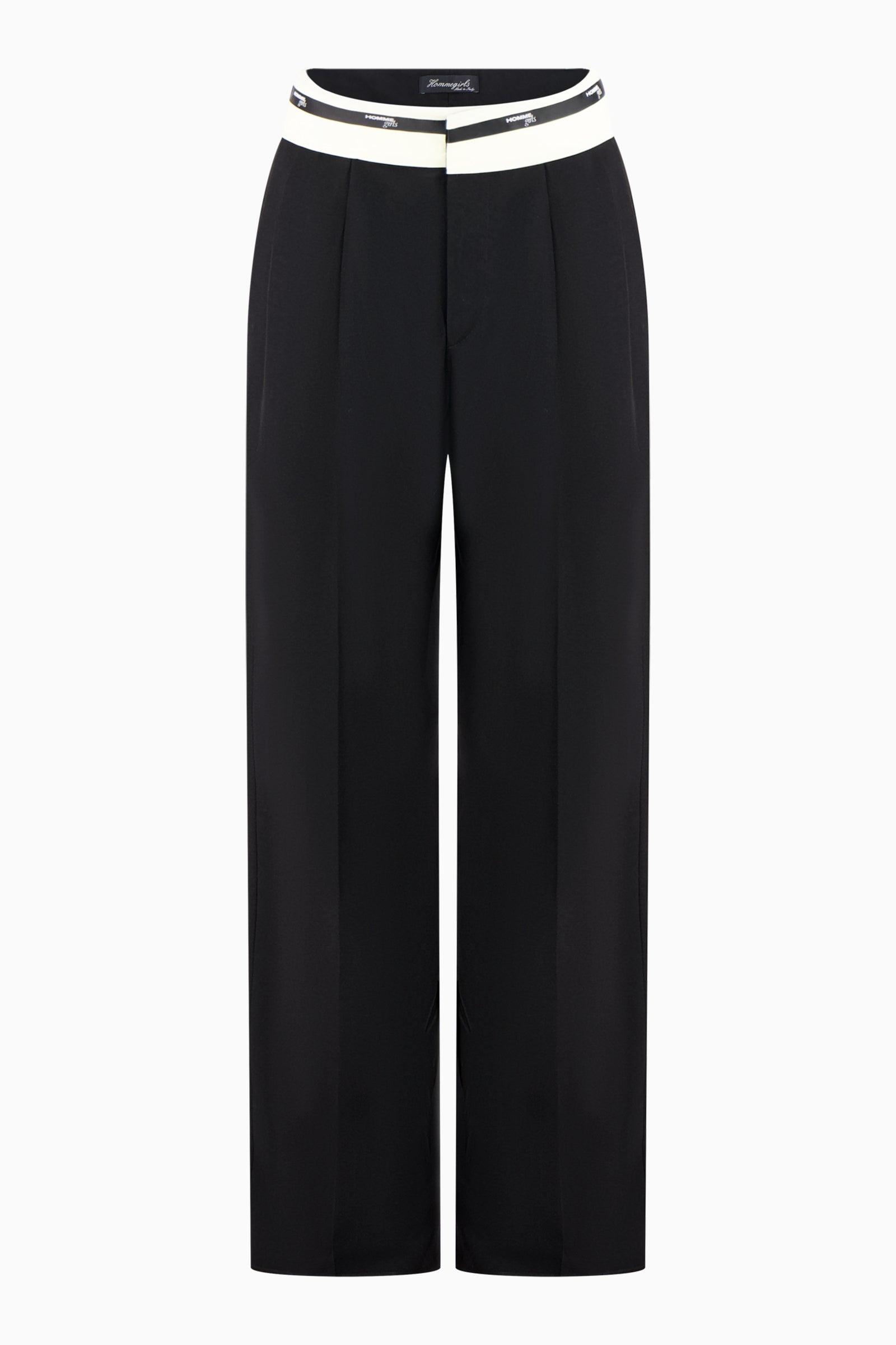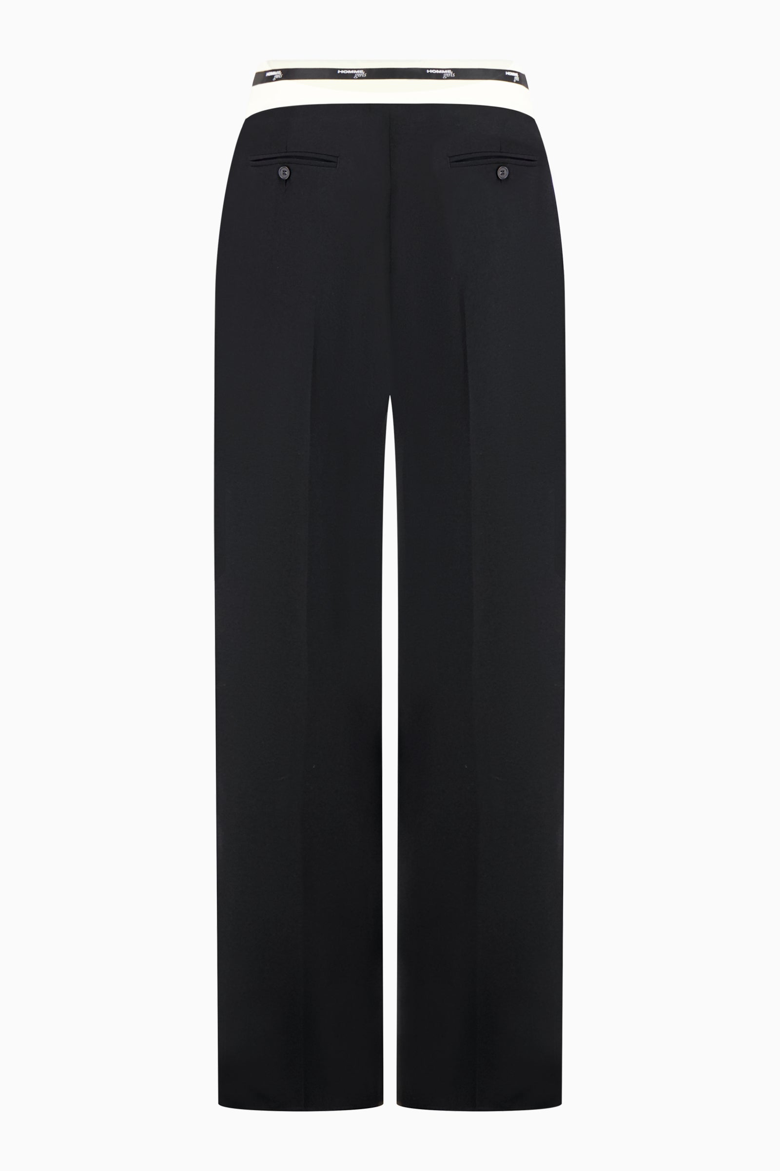 Wool mid-rise trousers featuring fixed foldover waistband with logo-patterned trim, four-pocket styling, zip fly, pleats at front, creased legs, and unfinished cuffs.