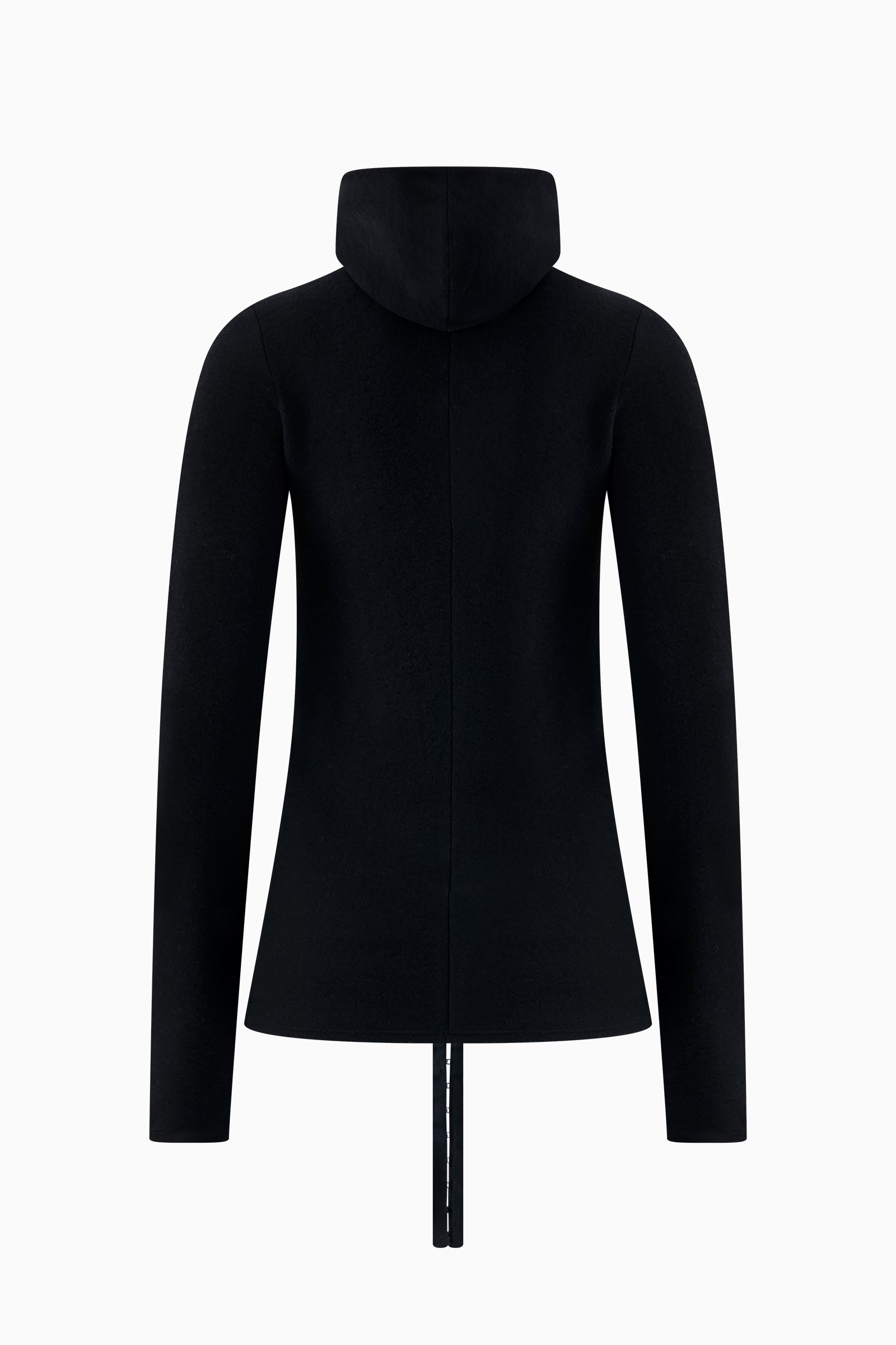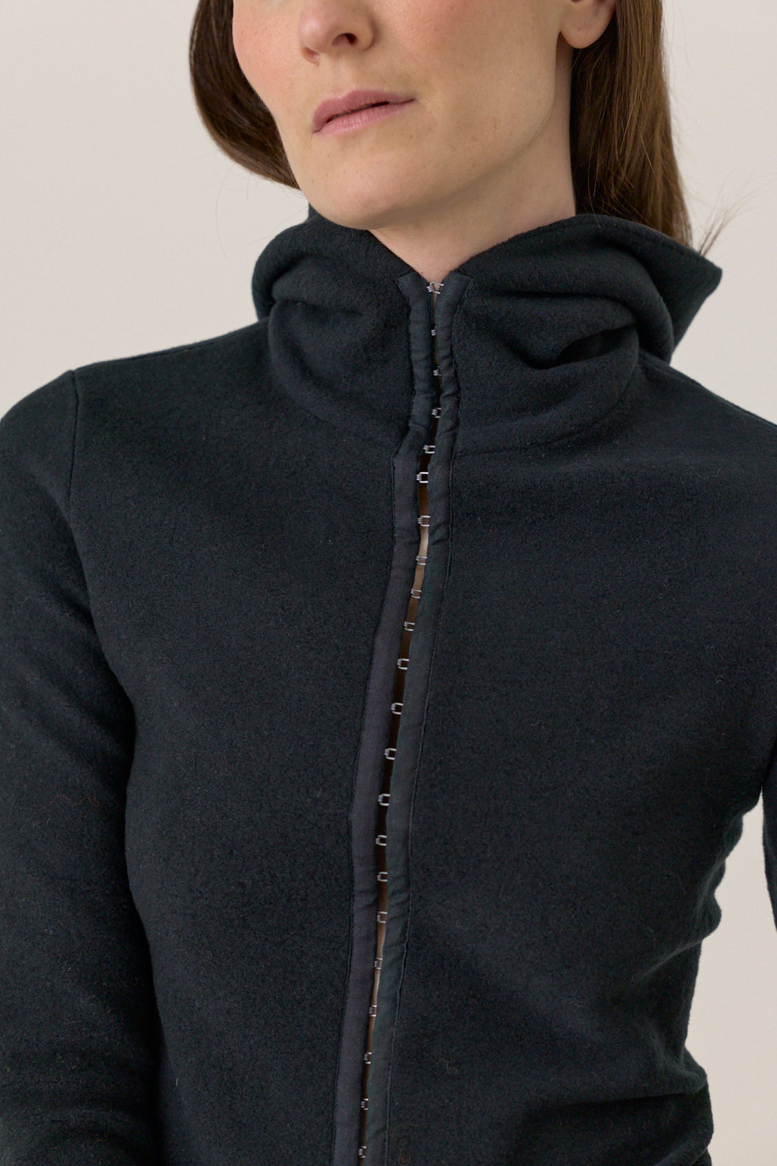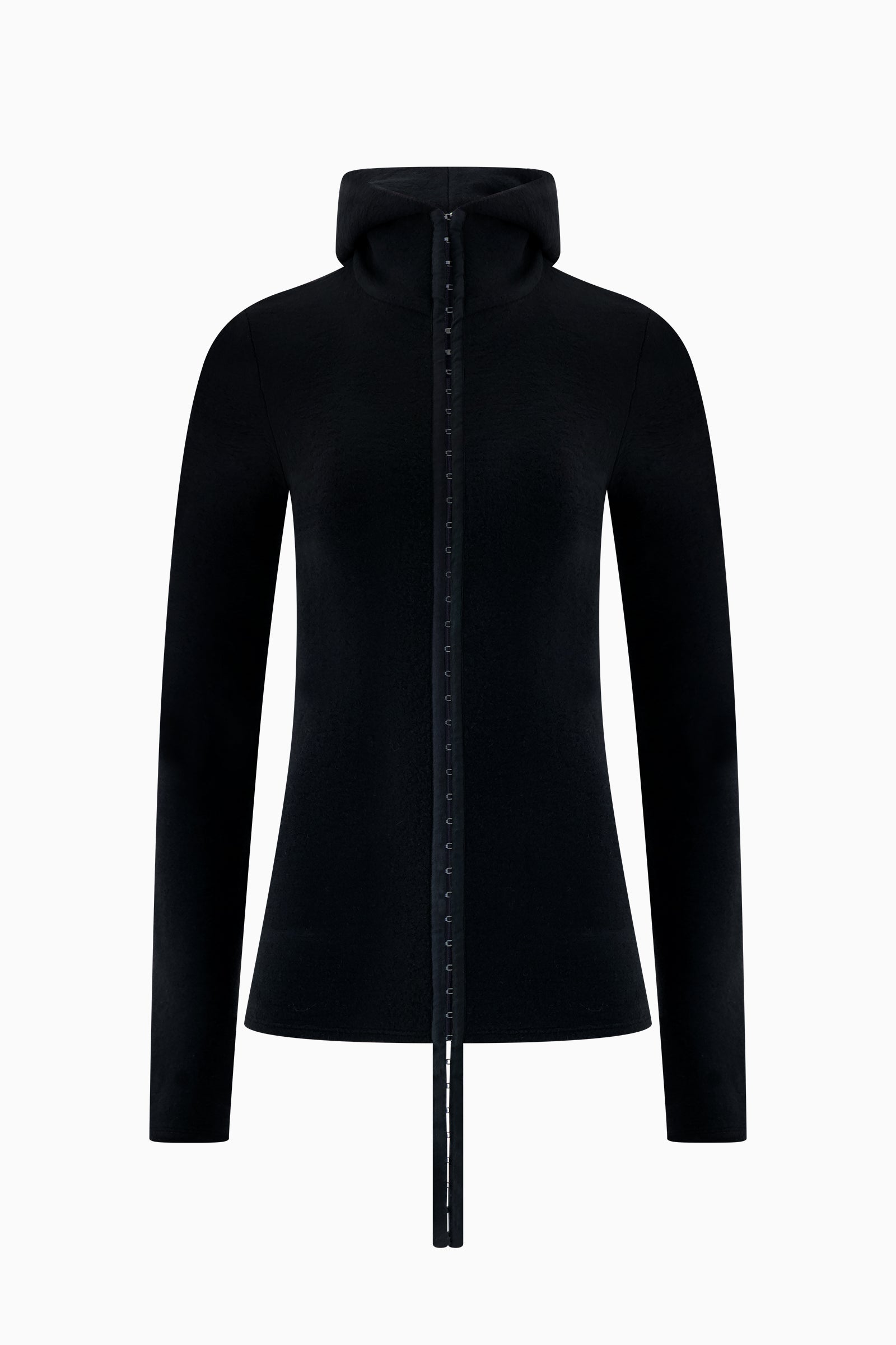 Fitted brushed wool jersey hooded sweatshirt with hook and eye closure.