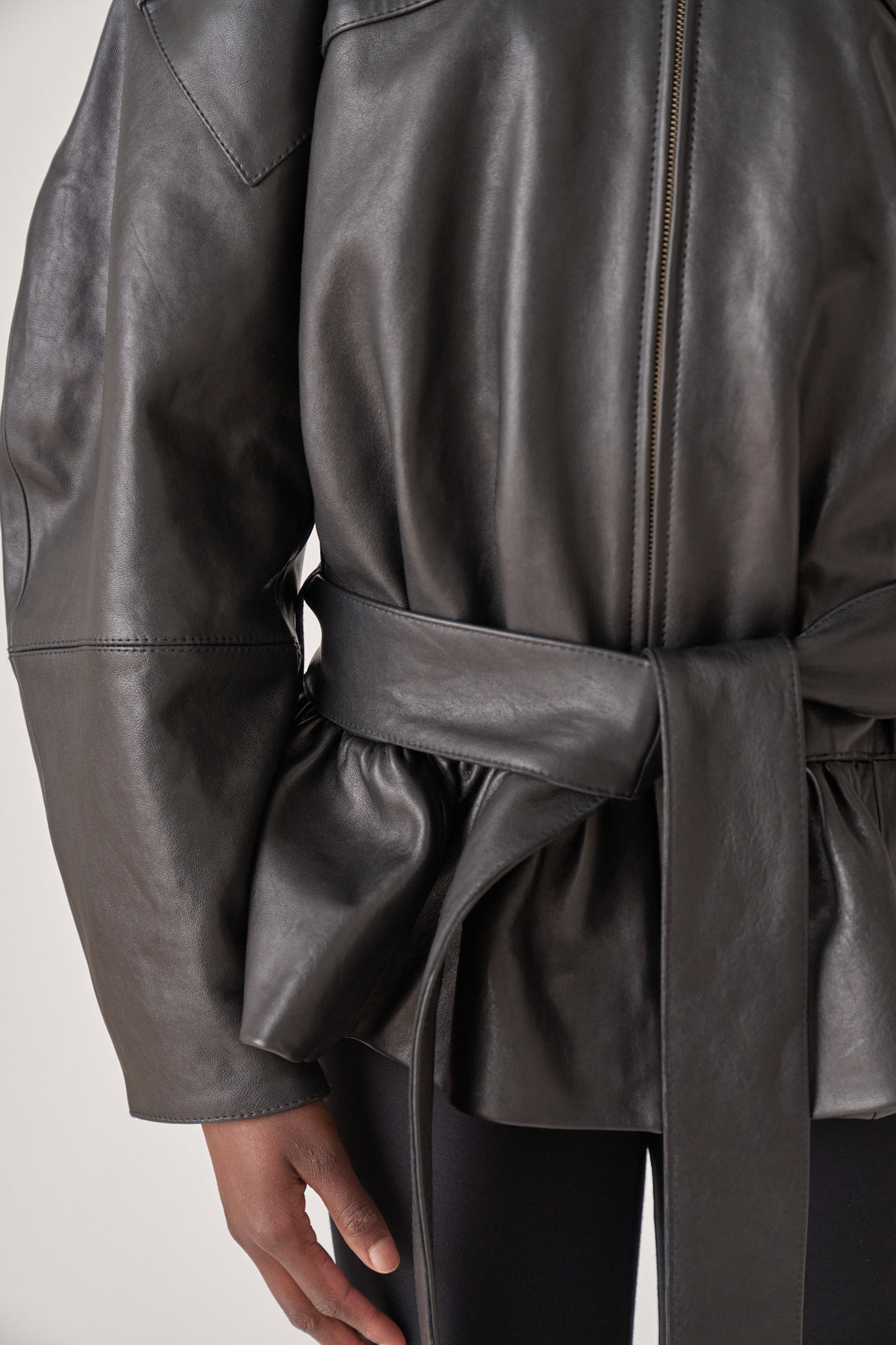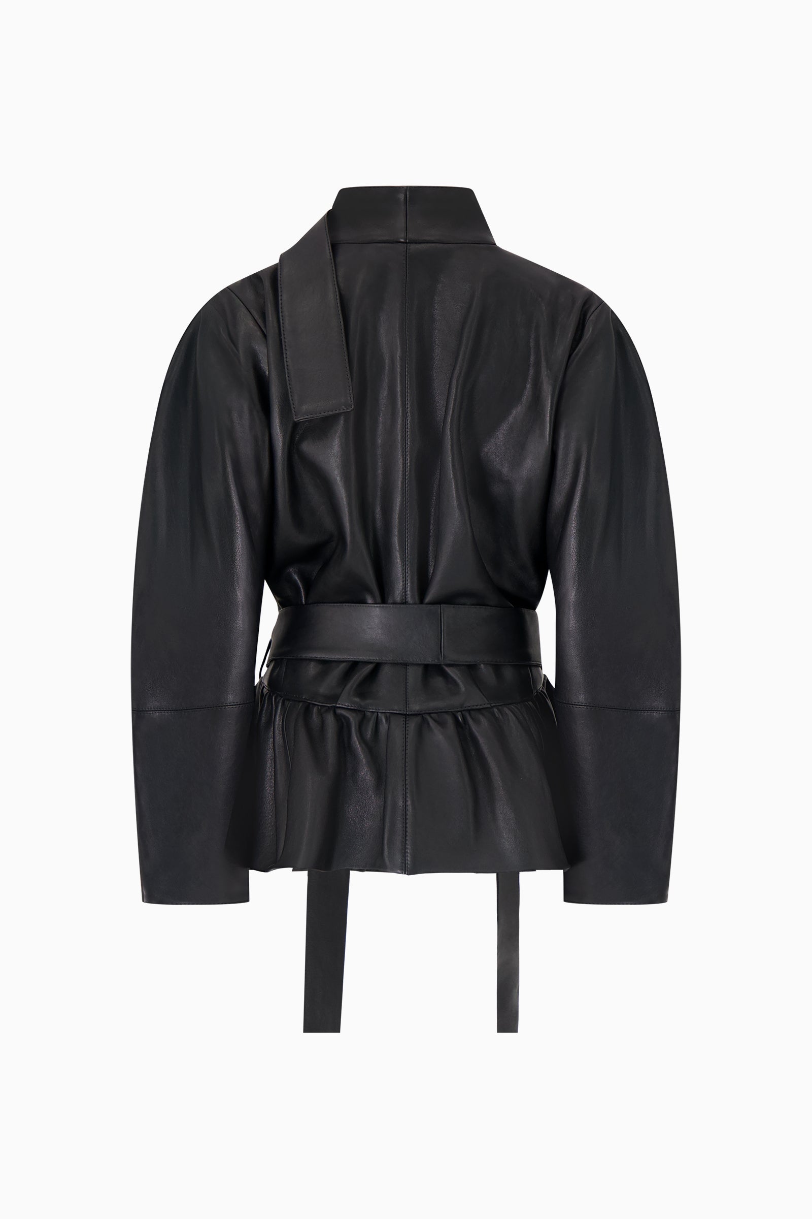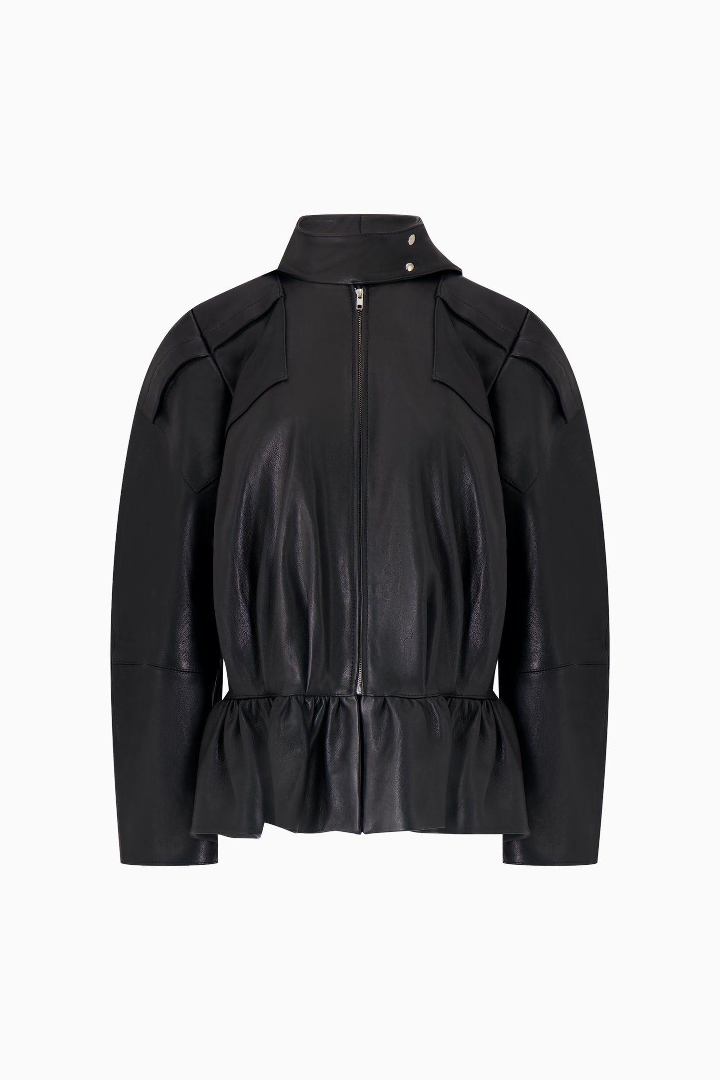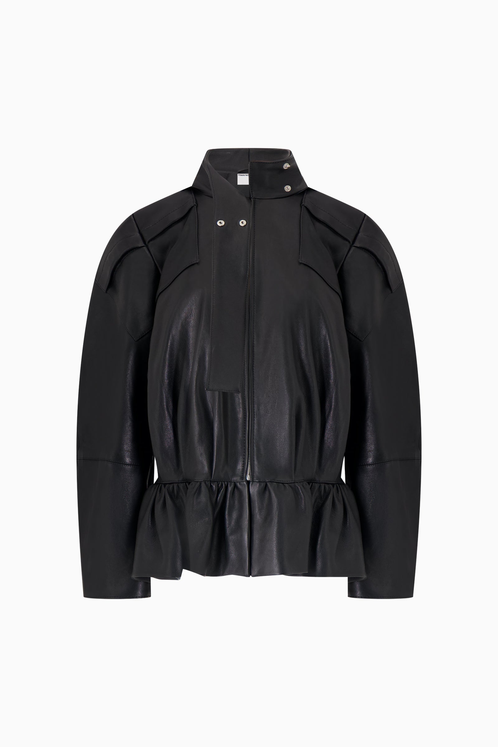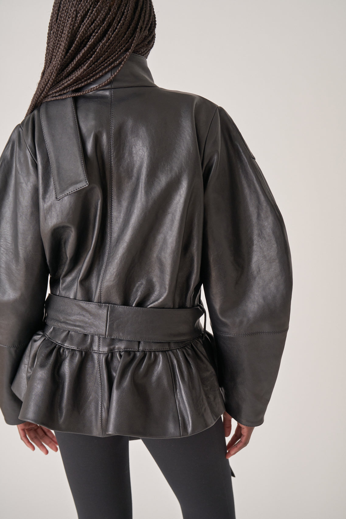 Structured leather jacket with exagerrated, curved sleeves with shoulder pockets and an extended stand-up collar that features snap-button closure. Peplum details at the hips with attached belt ties.