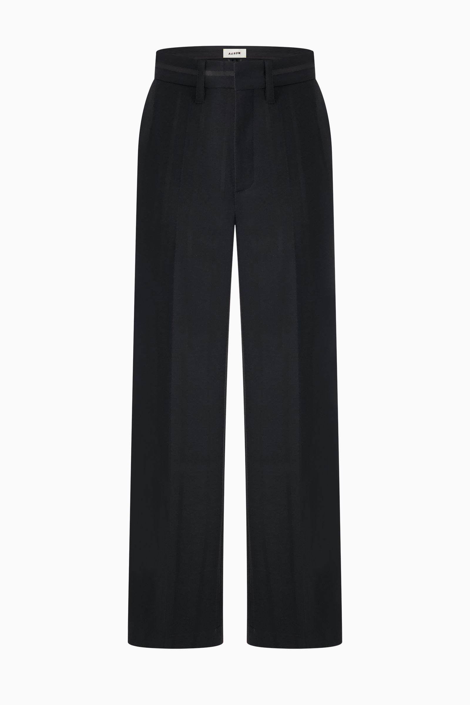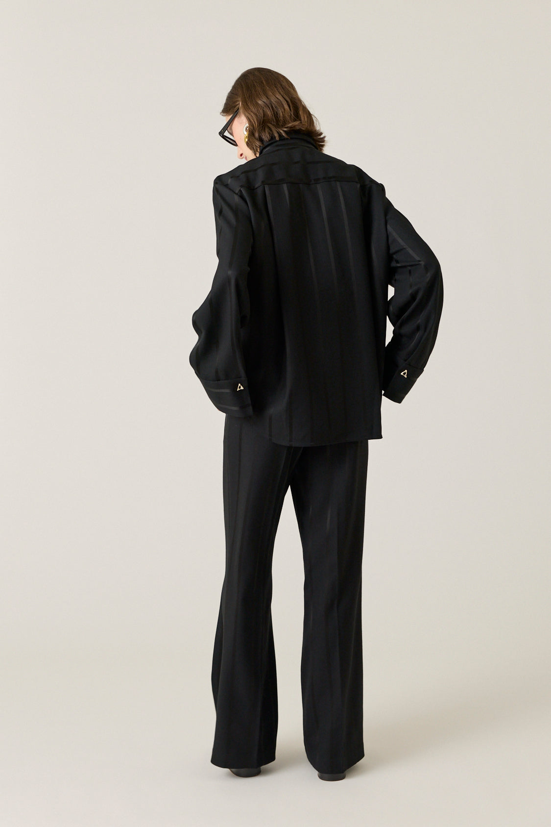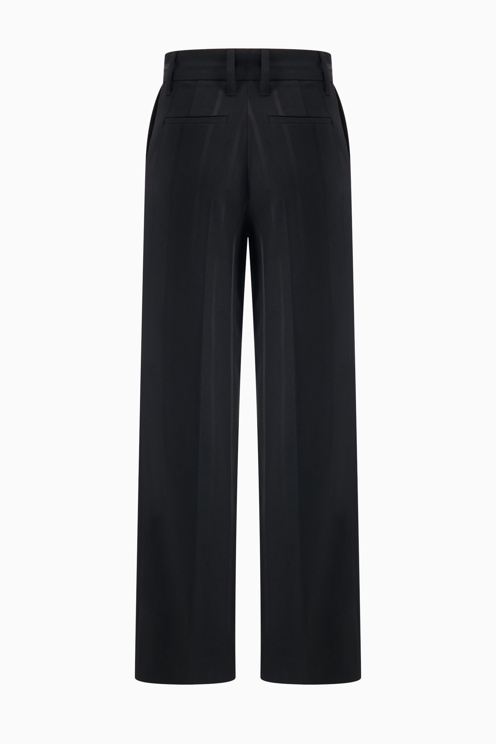 Wide-leg suiting pants cut to long, fluid silhouette. Sits at the natural waist. Subtle tonal stripes.
