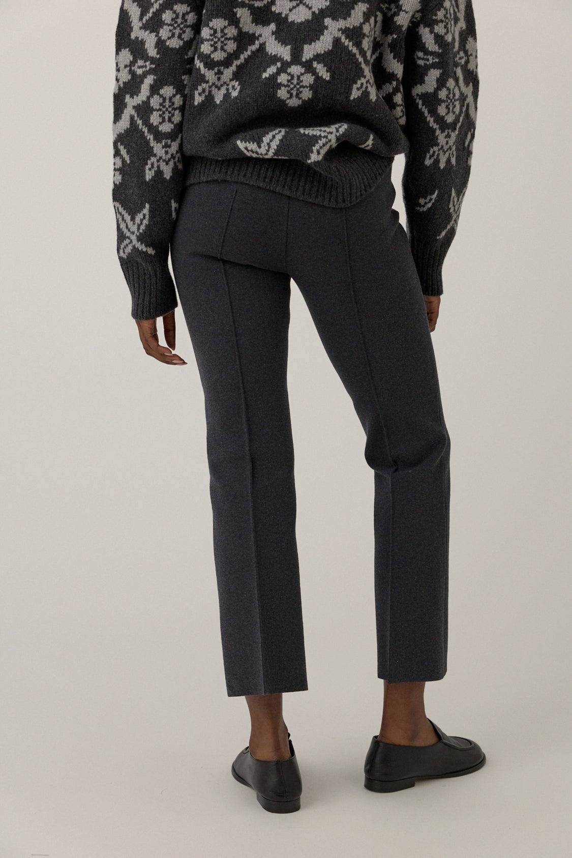 Pull-on pants with slim pin-tucked legs that flare out from the knee to cropped hem.