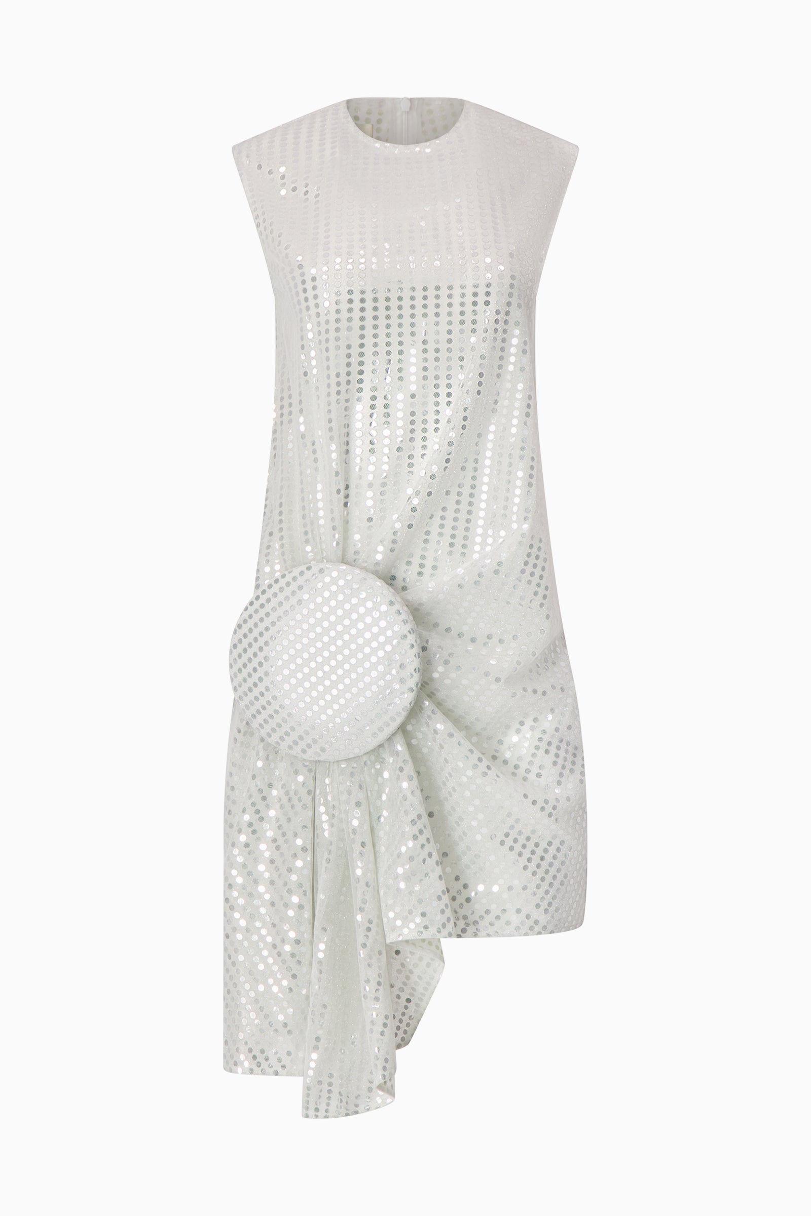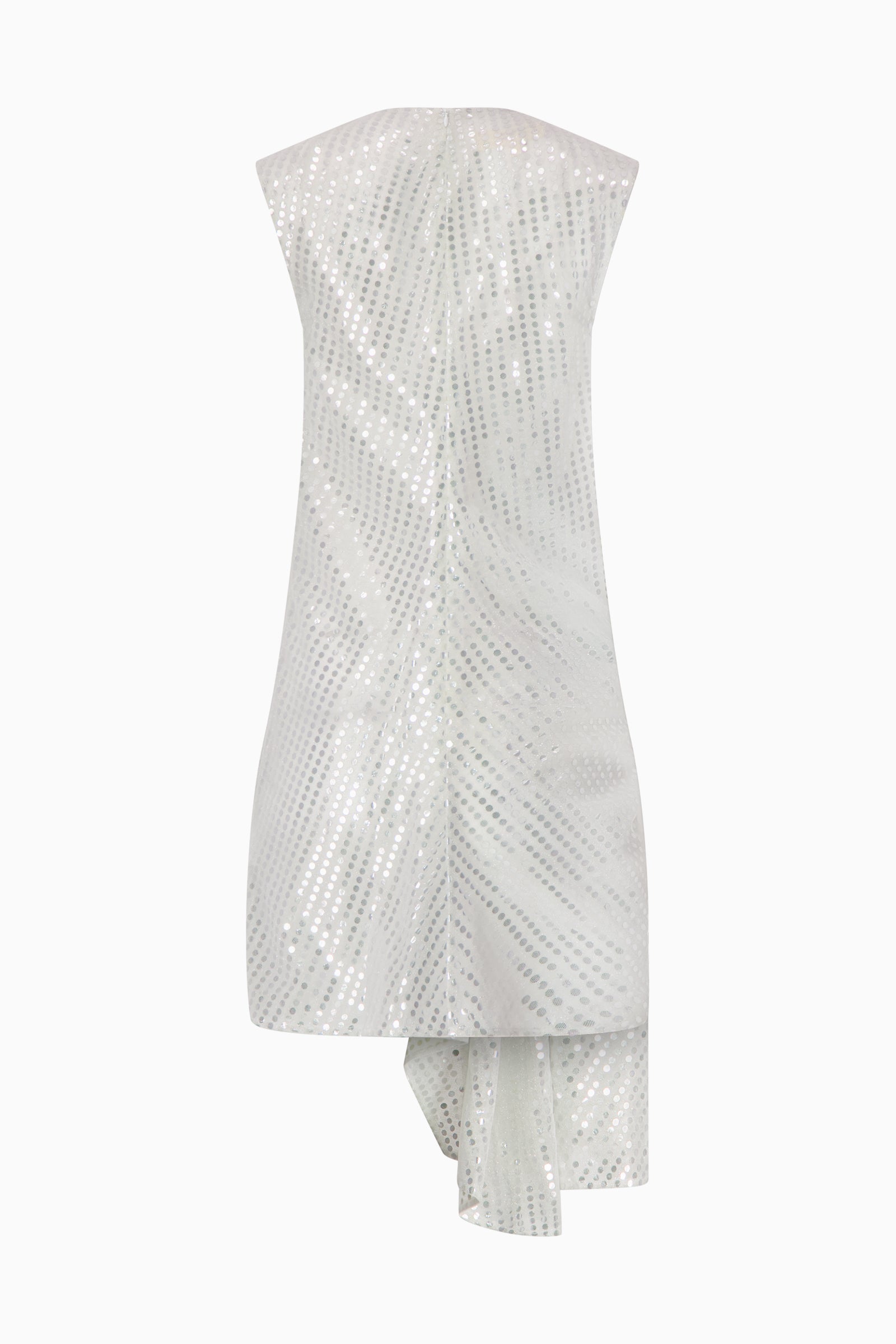 A sleeveless mini dress with a round neckline, structured shoulders, and an asymmetric draped detail gathered at the hip. Fully sequined with a back zip closure.