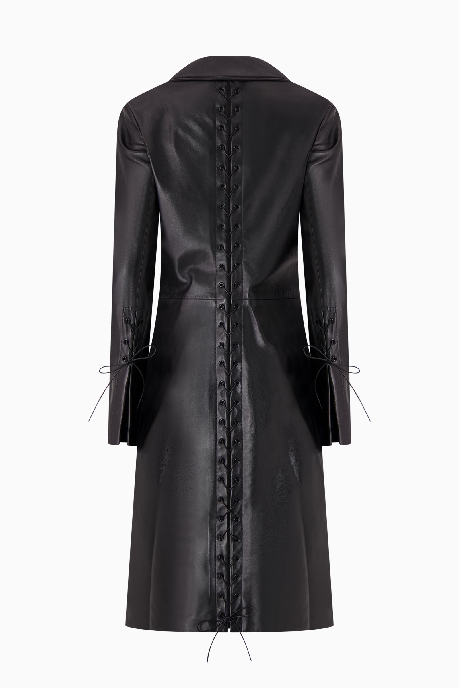Leather coat with tailored fit. Featuring front button closure, notched lapels, and lace-up detailing through the back and sleeves.
