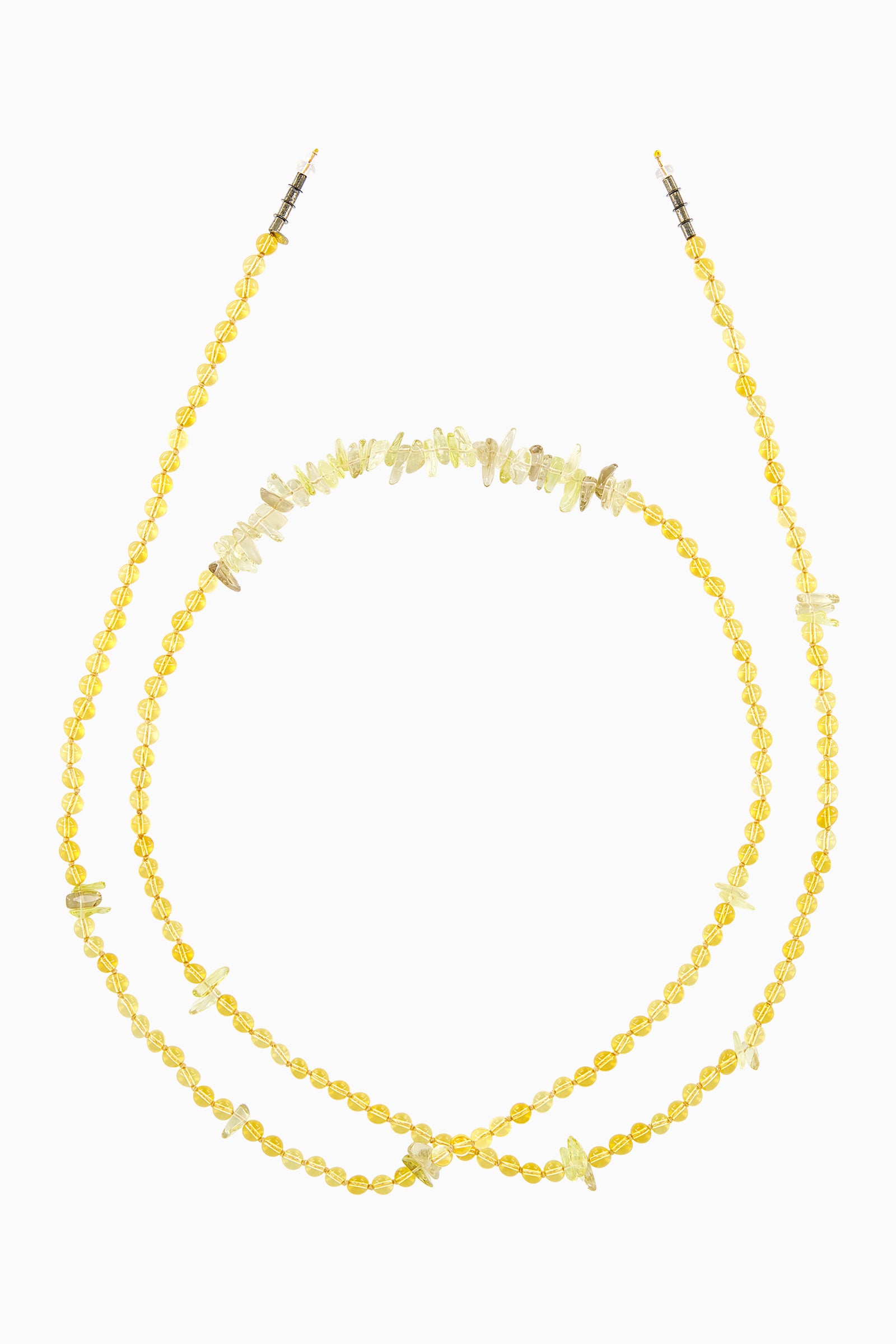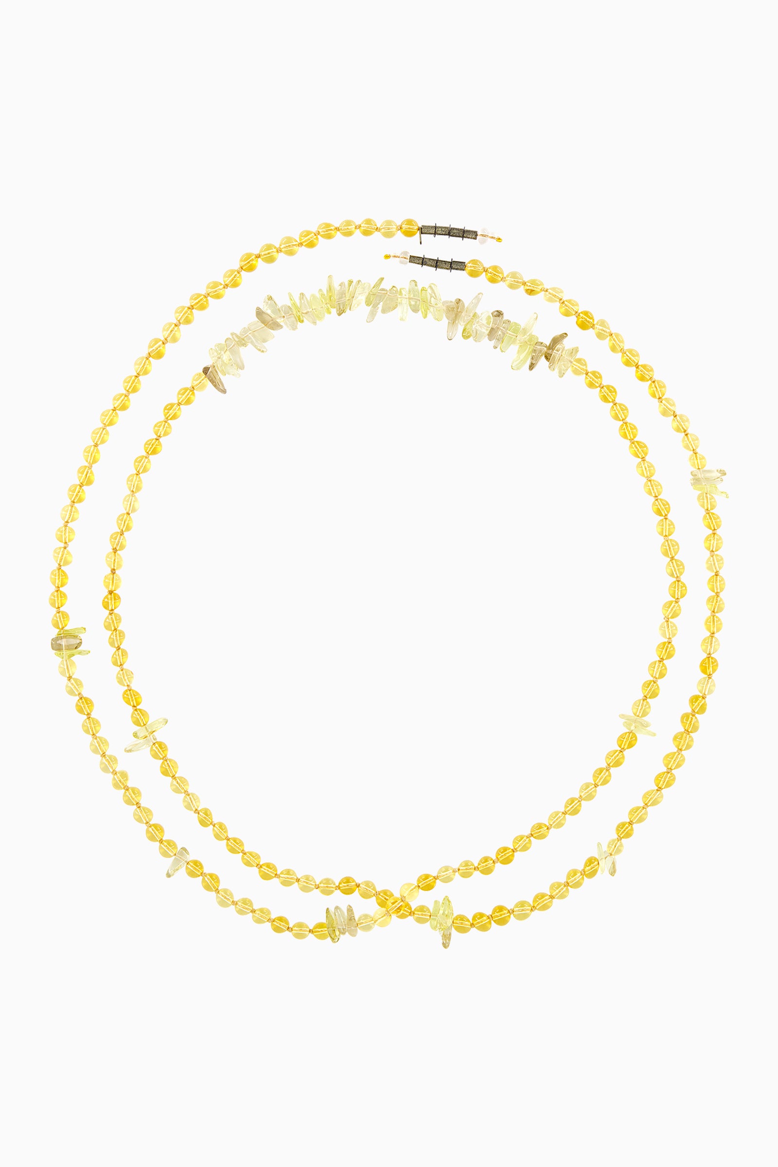 Wrap necklace composed of lemon and honey citrine and pyrite on silk. Measures 65 inches.