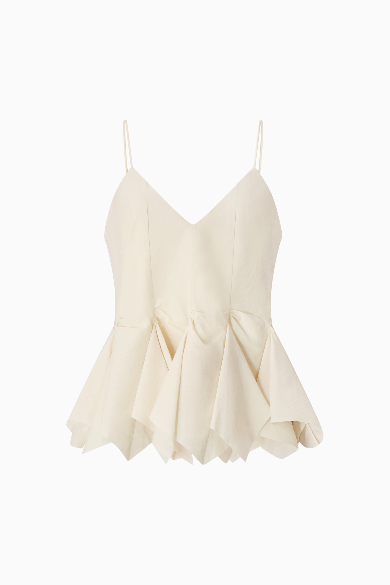 Camisole tailored with fitted panels across the bodice leading to multiple godets to create a frilled peplum hem.